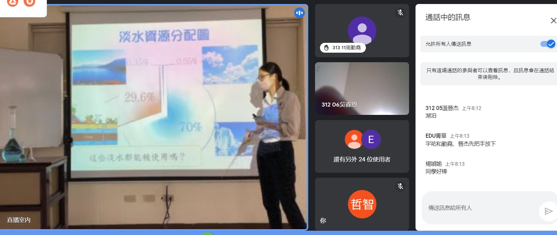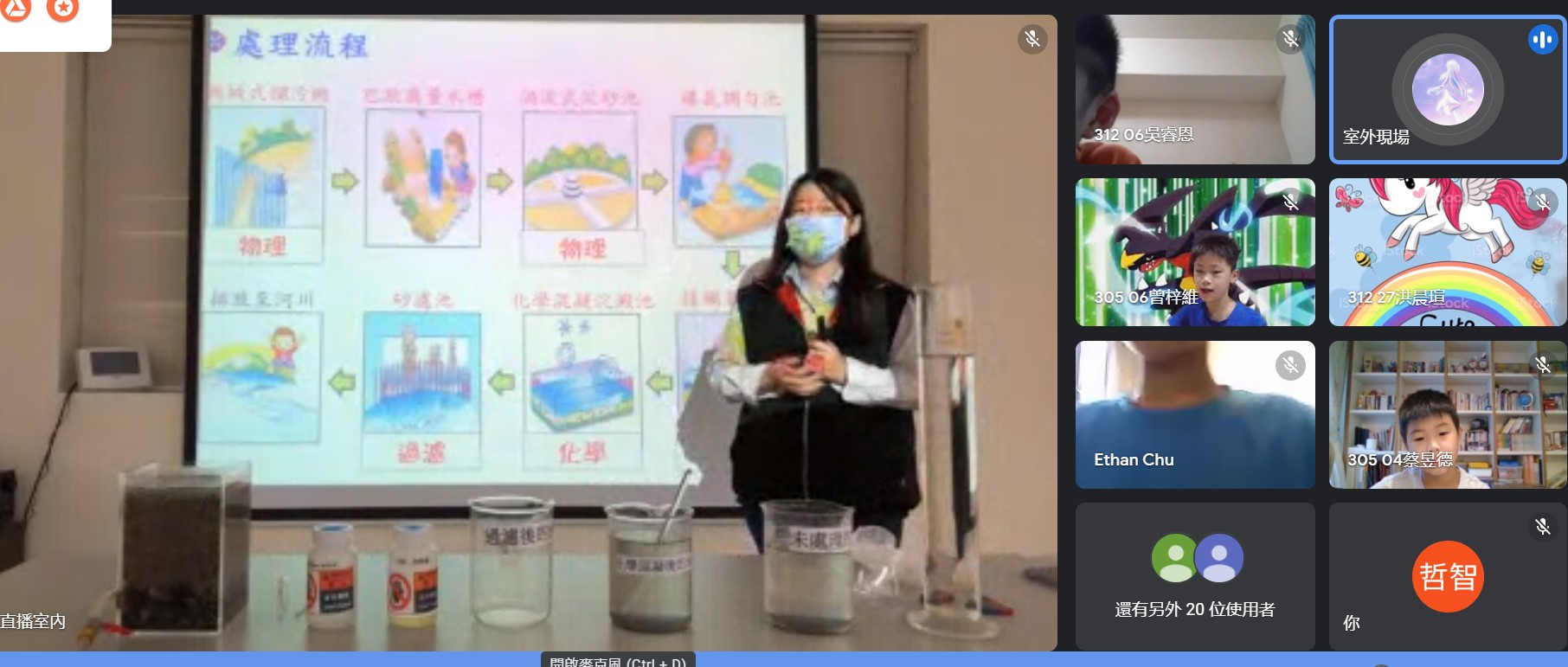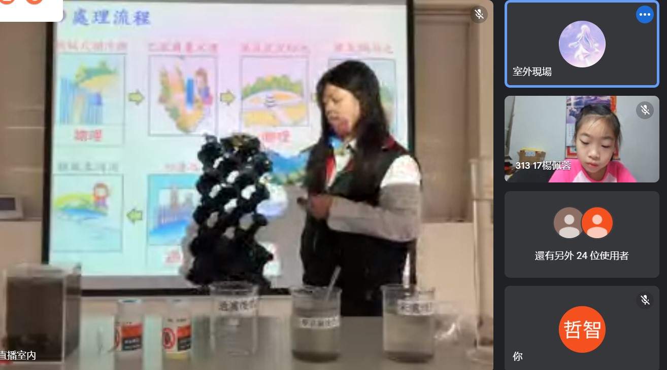 因應停課不停學,學生居家上課,原本排定好的新竹科學園區汙水處理廠的校外教學也因應取消,但透過線上視訊的方式也可以讓同學們在家了解汙水處理的過程,講師講解了水循環、園區的汙水處理過程,可惜天公不做媒,沒辦法透過鏡頭參觀汙水處理廠、但看到老師操作實驗讓水中的懸浮物可以迅速沉澱,這樣的體驗是令人印象深刻的。最後的QA時間更是提問踴躍,相信疫情結束後同學們就可以去看那神奇的沙濾池中的沙子。
