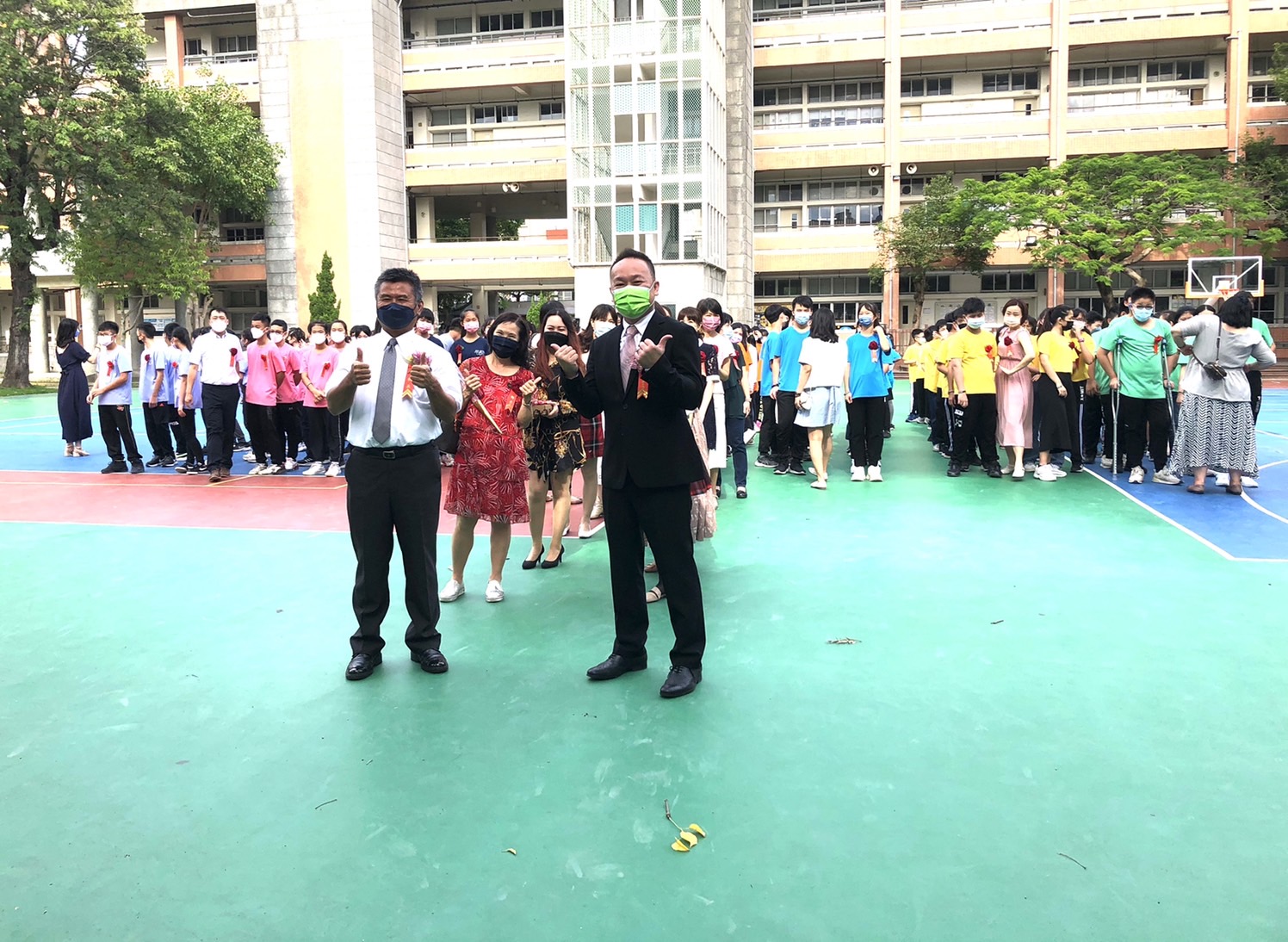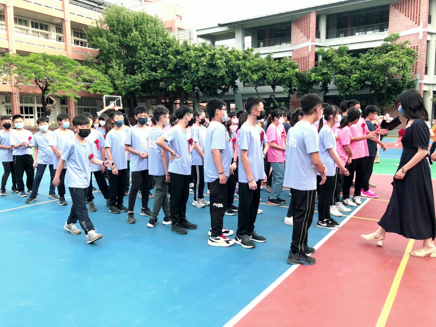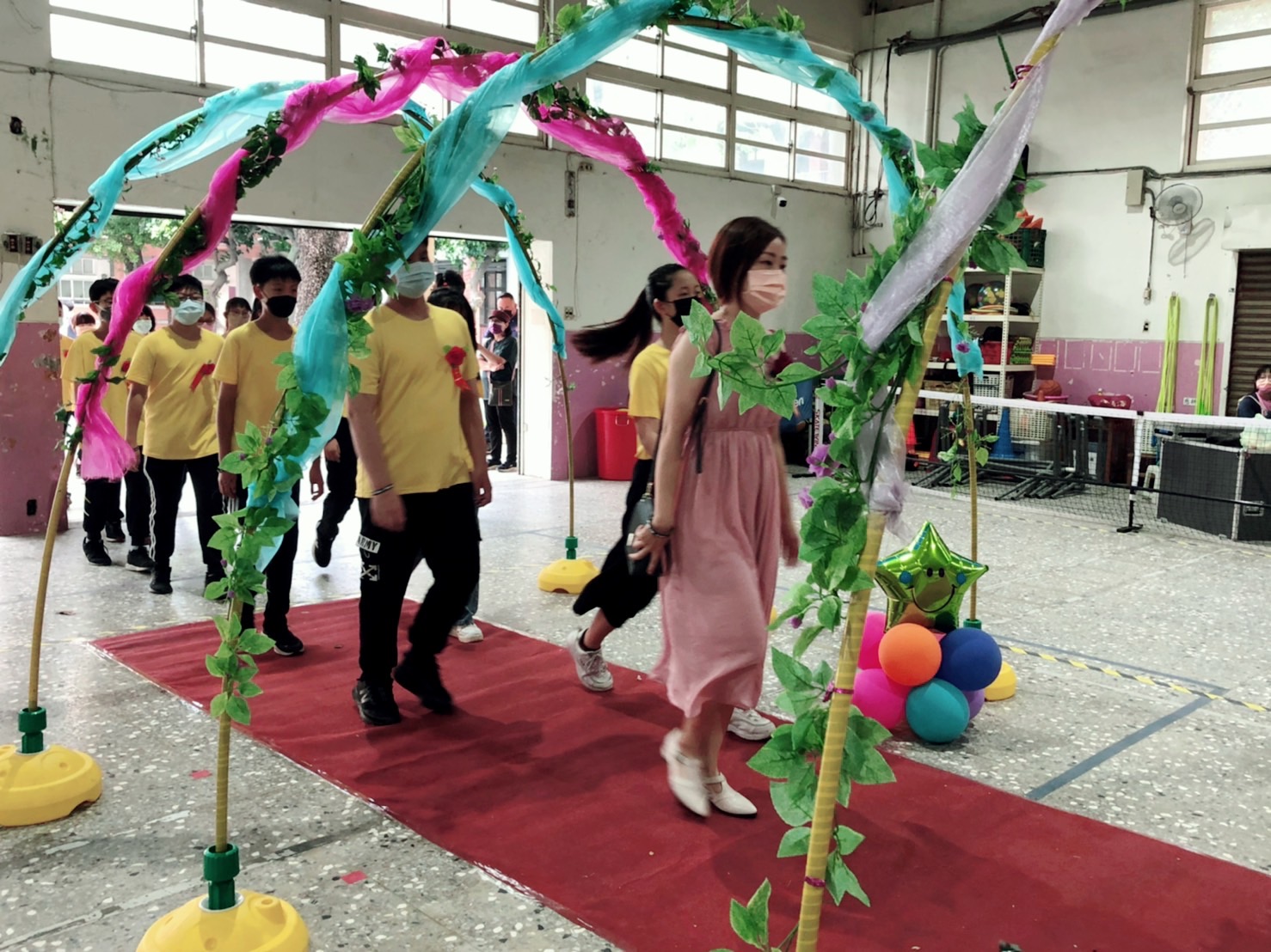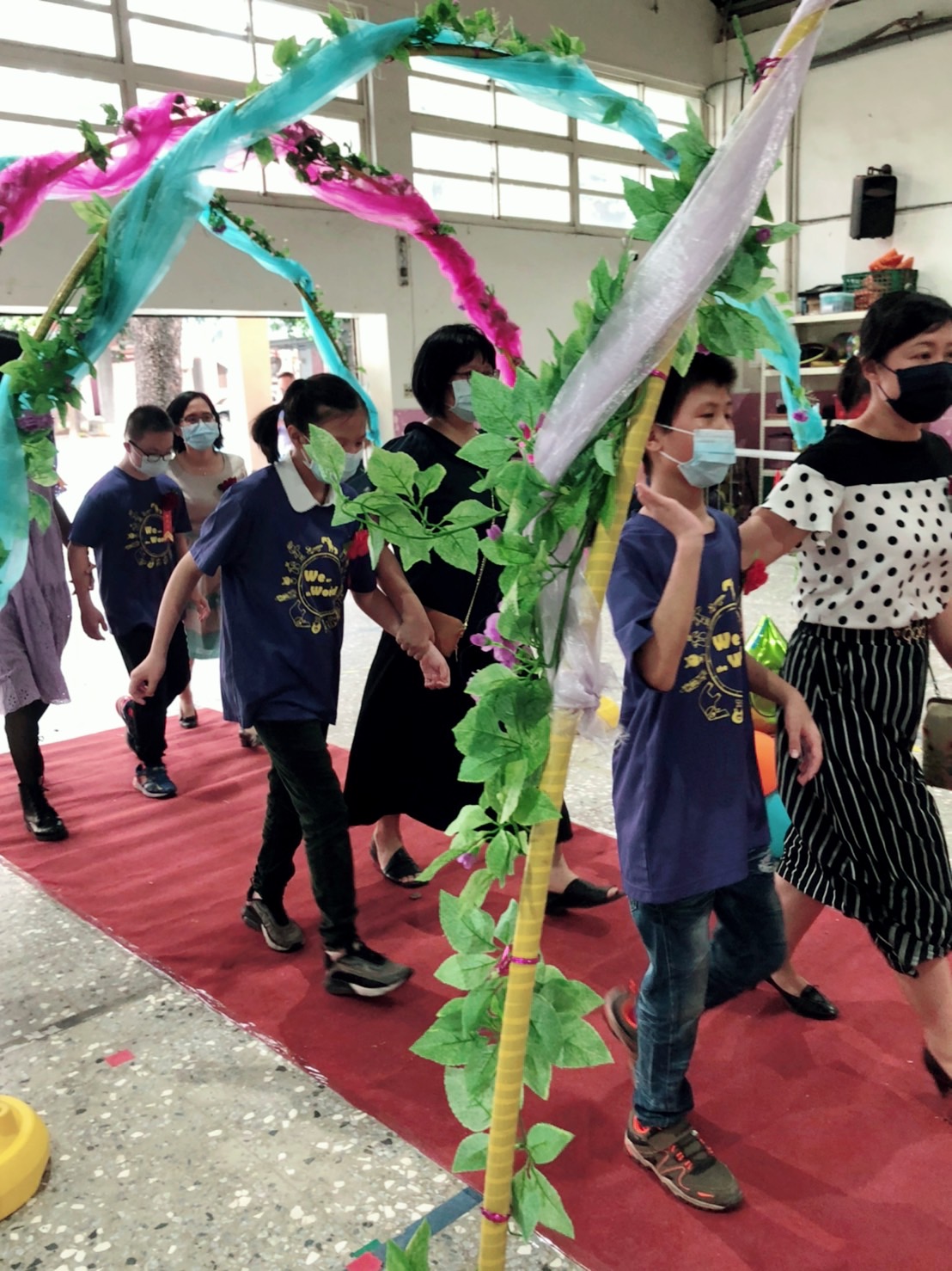 新竹市西門國小6/18(週六)下午在學校大禮堂舉辦第68屆畢業典禮,今年畢業生一共有189位,在3點50分時全體畢業生陸續來到小操場集合整隊,由校長、家長會長、師長們帶領全體畢業生,以甲〜庚〜乙〜己〜丙〜戊〜丁〜慈心慈恩班的順序,通過圓拱門進入會場。