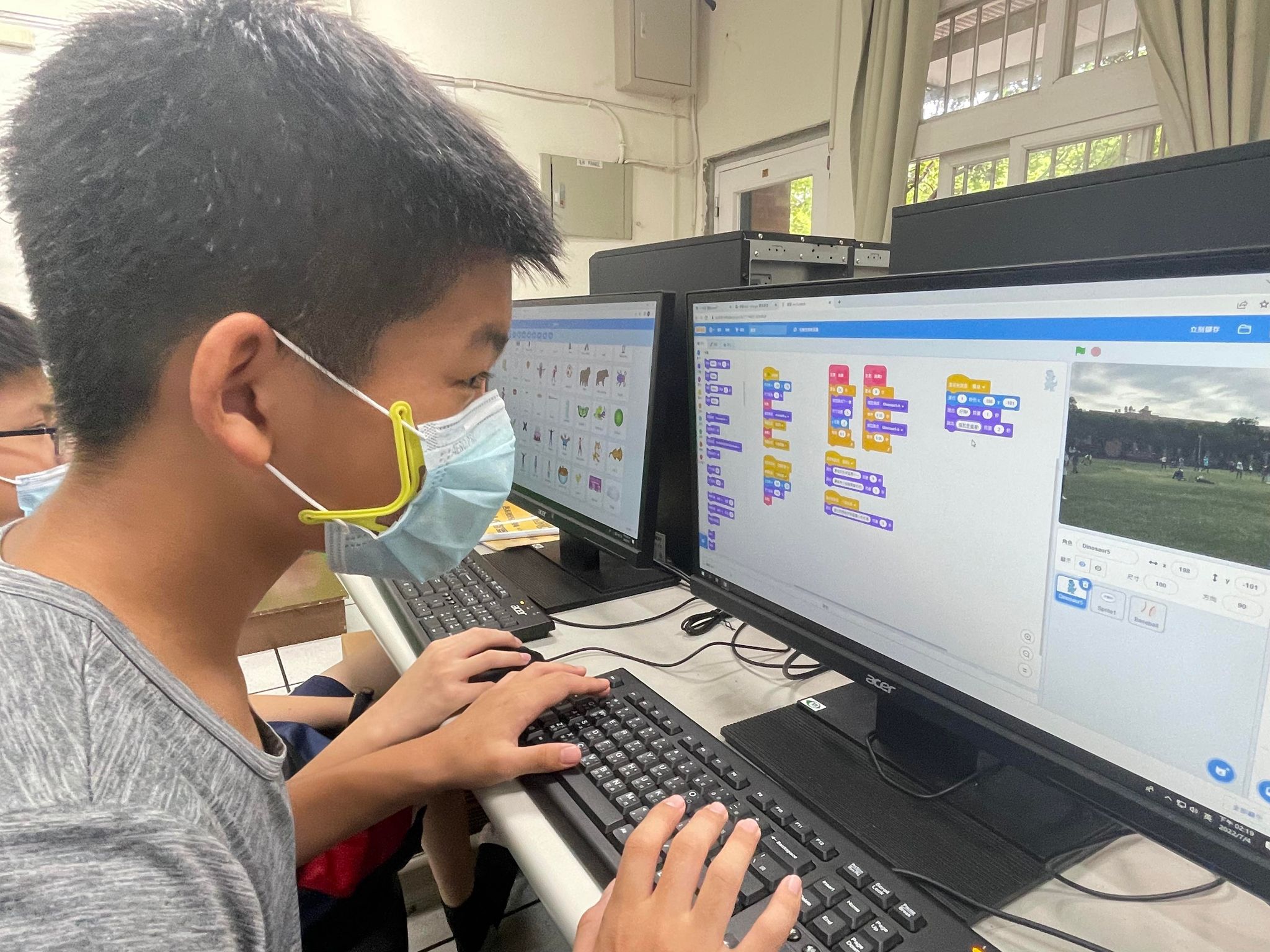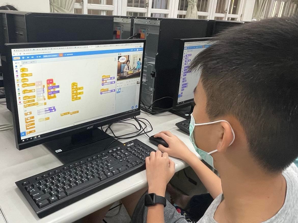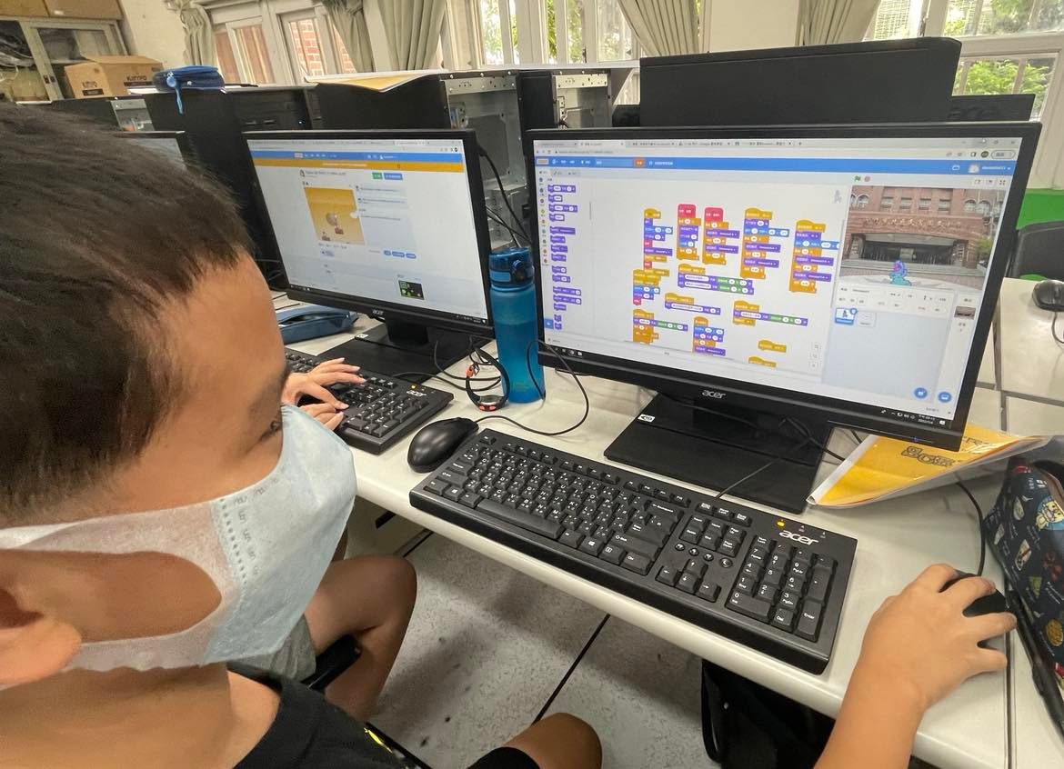 Scratch進階營隊第二天,林珉鈿講師帶著五年級的孩子們創作校園動畫,課程中運用「廣播事件」、「涵式」的程式技巧,讓兩個角色透過對話互動,介紹民富的校園之美。
