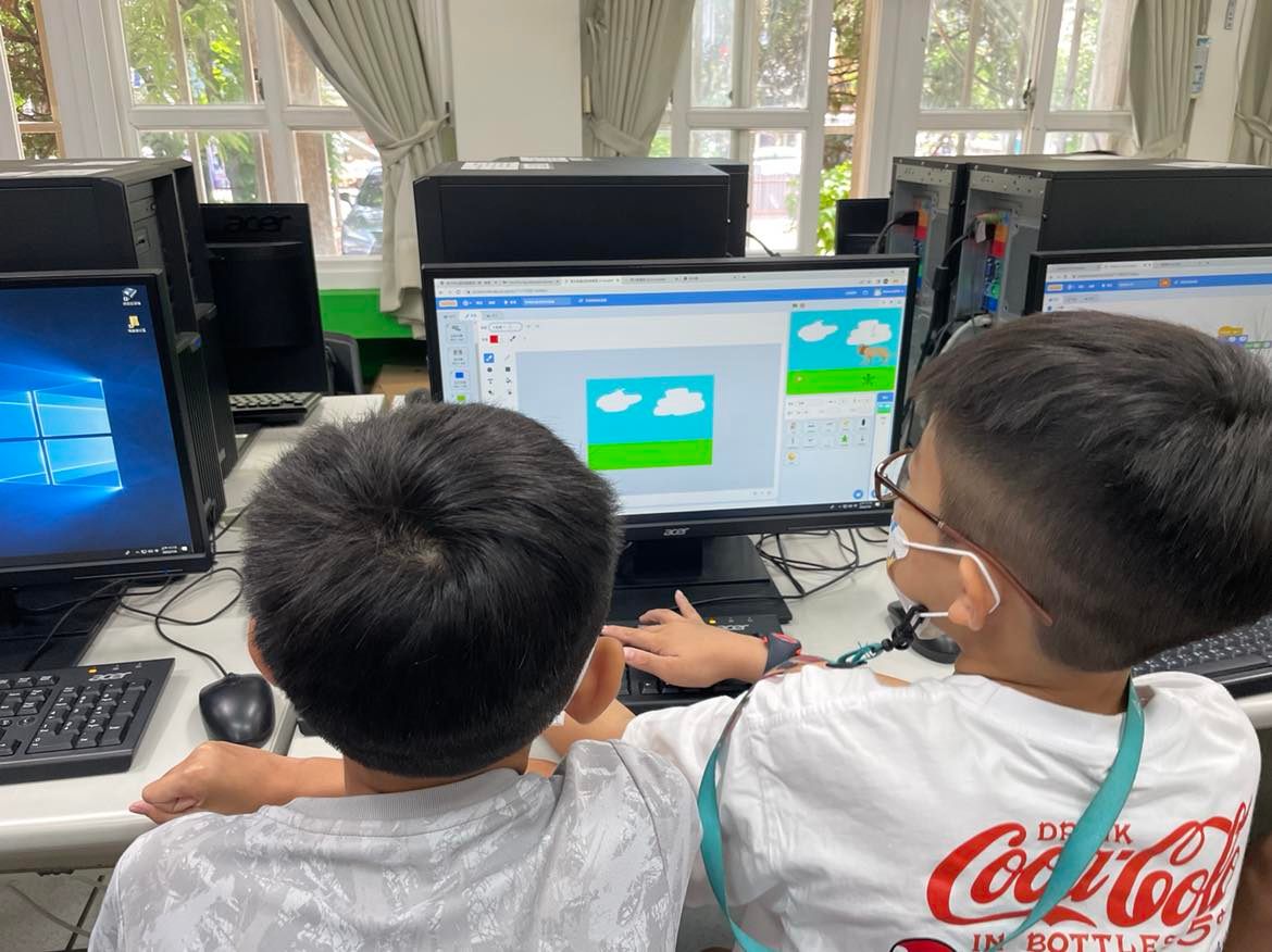 今天是「Scratch程式設計」營隊最後一天,孩子們兩兩一組絞盡腦汁的思考「動物」主題的遊戲專題,甚至有些孩子前一晚就開始設計程式,十分認真。分組討論中,有些組別朝著動物環境保護的方向設計撿垃圾的遊戲,也有組別朝著稀有動物的方向設計謎題闖關遊戲,也有組別針對動物特性設計走迷宮、對戰 等遊戲內容,最後讓各小組上台分享自己的創作以及創作過程。