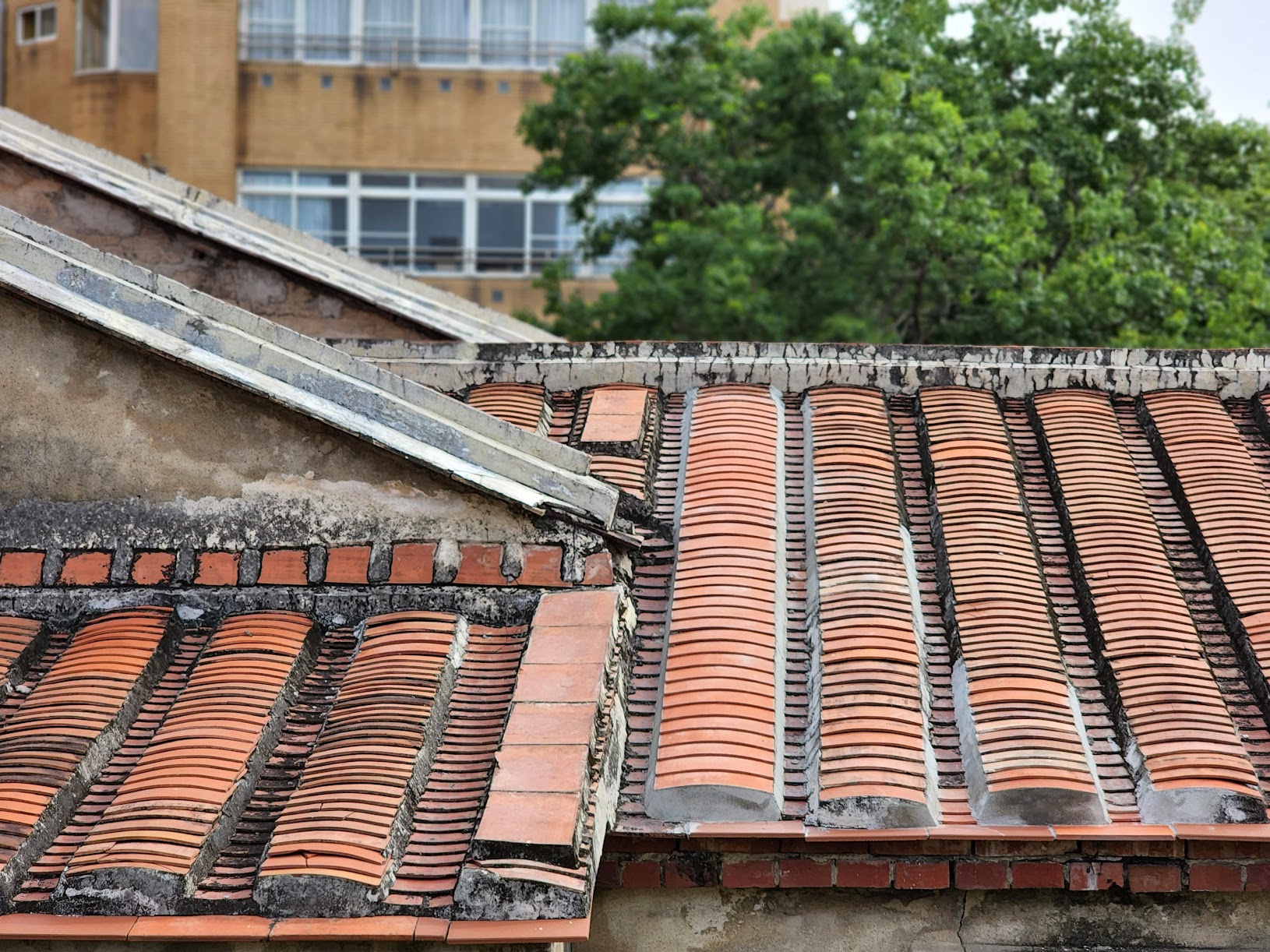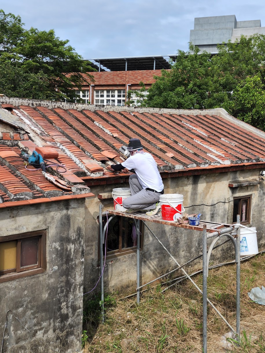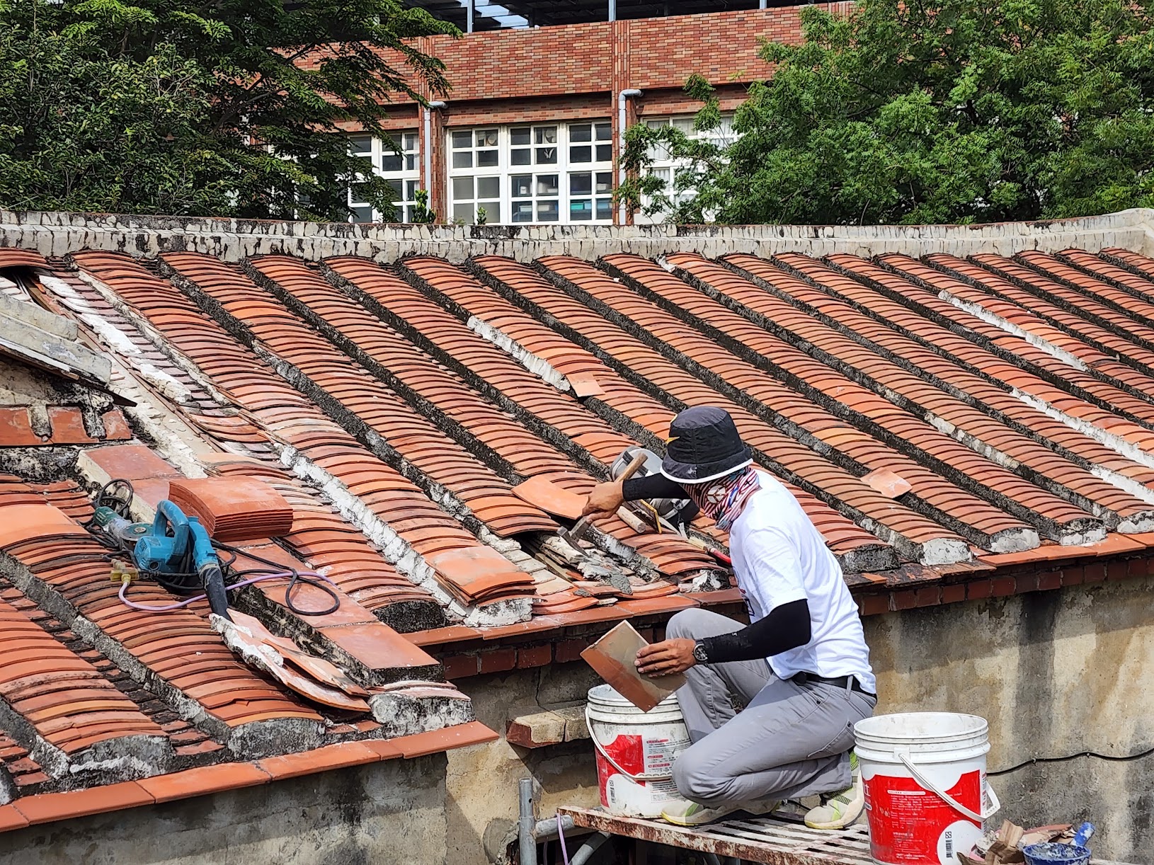 三合院的屋瓦被強風吹落,雖然不是古蹟,但要尋找能夠整修傳統建築的工班師傅,也不是那麼容易!暑假期間,特地聘請擁有專業修復傳統建築的師傅從南部北上新竹,破損面積雖然不大,師傅依然小心翼翼,一片一片修復調整受損的區域。校園中的三合院建築,是提供孩子親近本土了解過去生活的最佳情境教室,經由專業師傅的修復,期盼三合院能夠一如往昔的陪伴孩子學習成長!