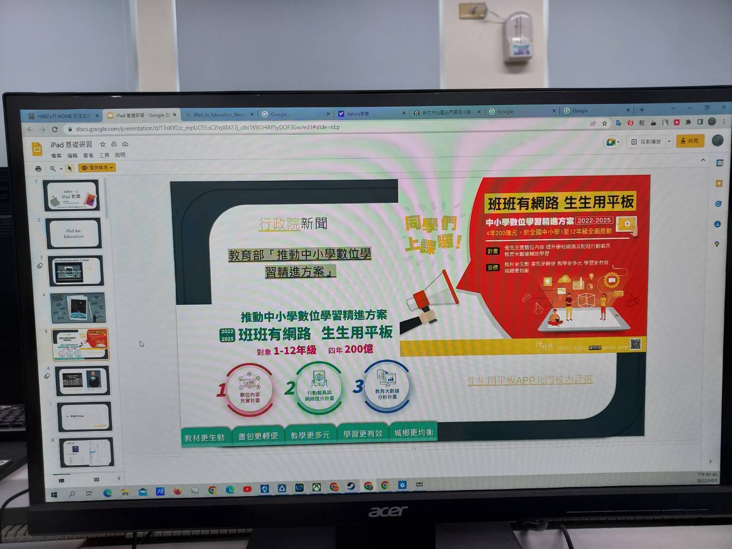 今天邀請了北門國小的薛詠浩老師到校,為本校老師分享數位學習推動計畫-教師增能研習,今日安排校內老師學習初階課程,認識ipad的基本功能(認識技術規格、機型比較、硬體功能、手勢使用……),課堂上每位老師都很認真的學習和討論,課程最後都需練習操作再繳交作業才可獲得認證喔!