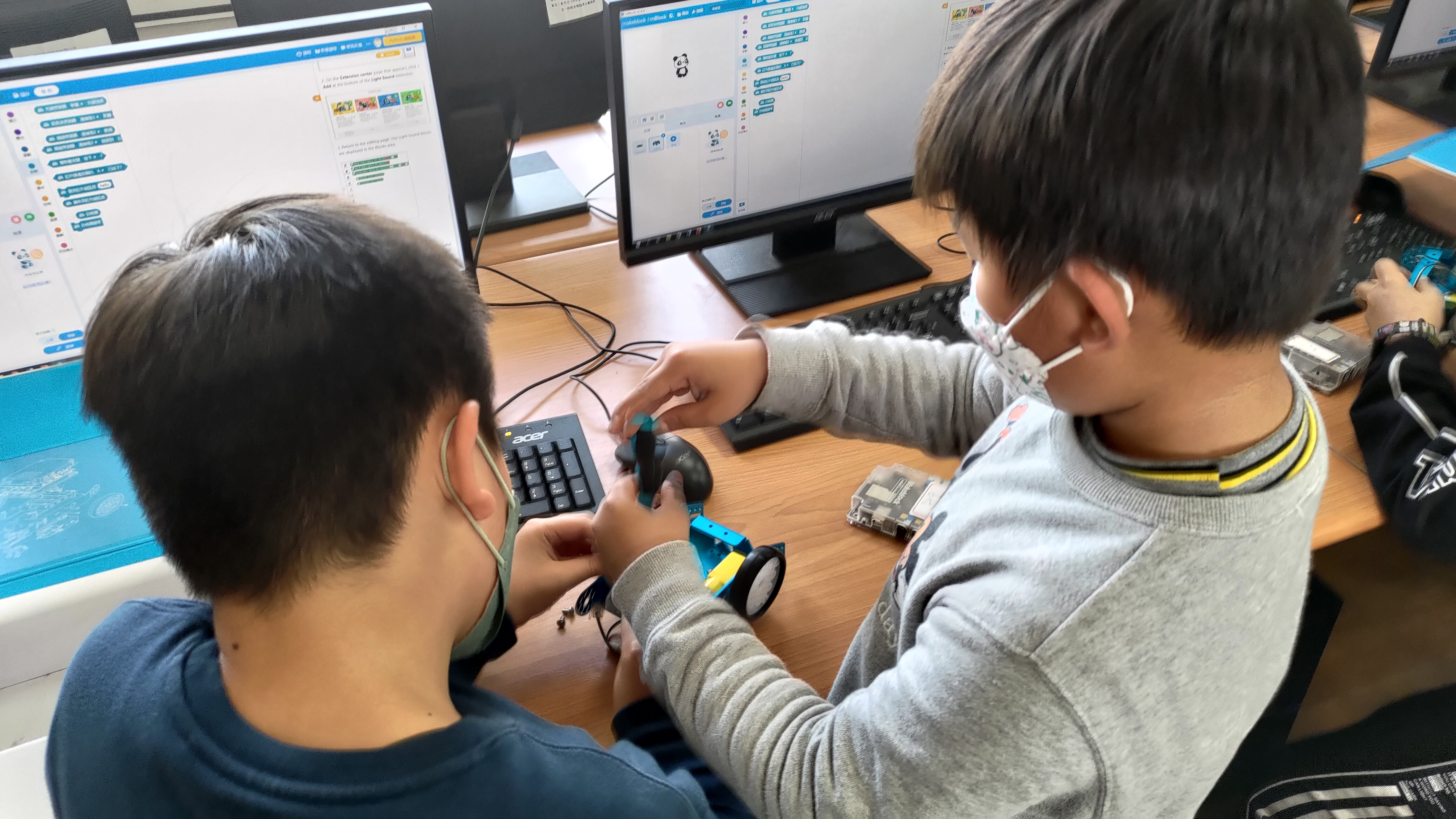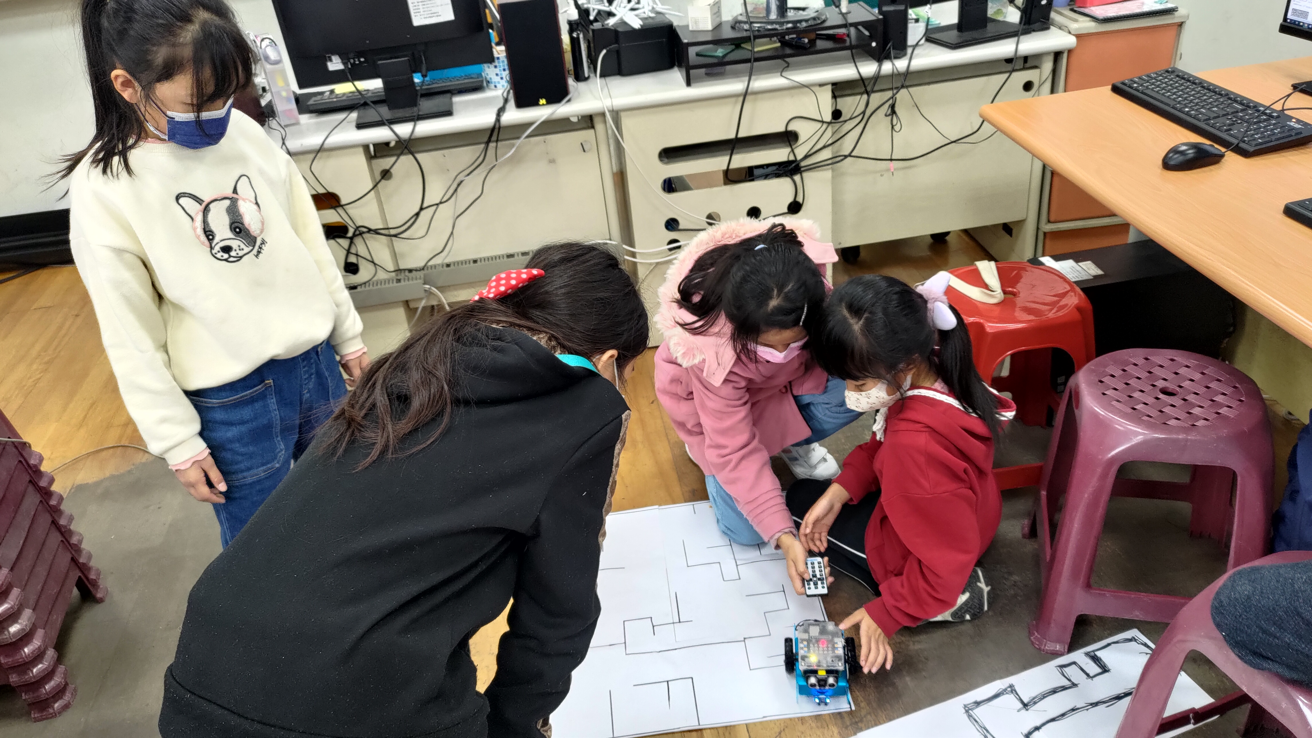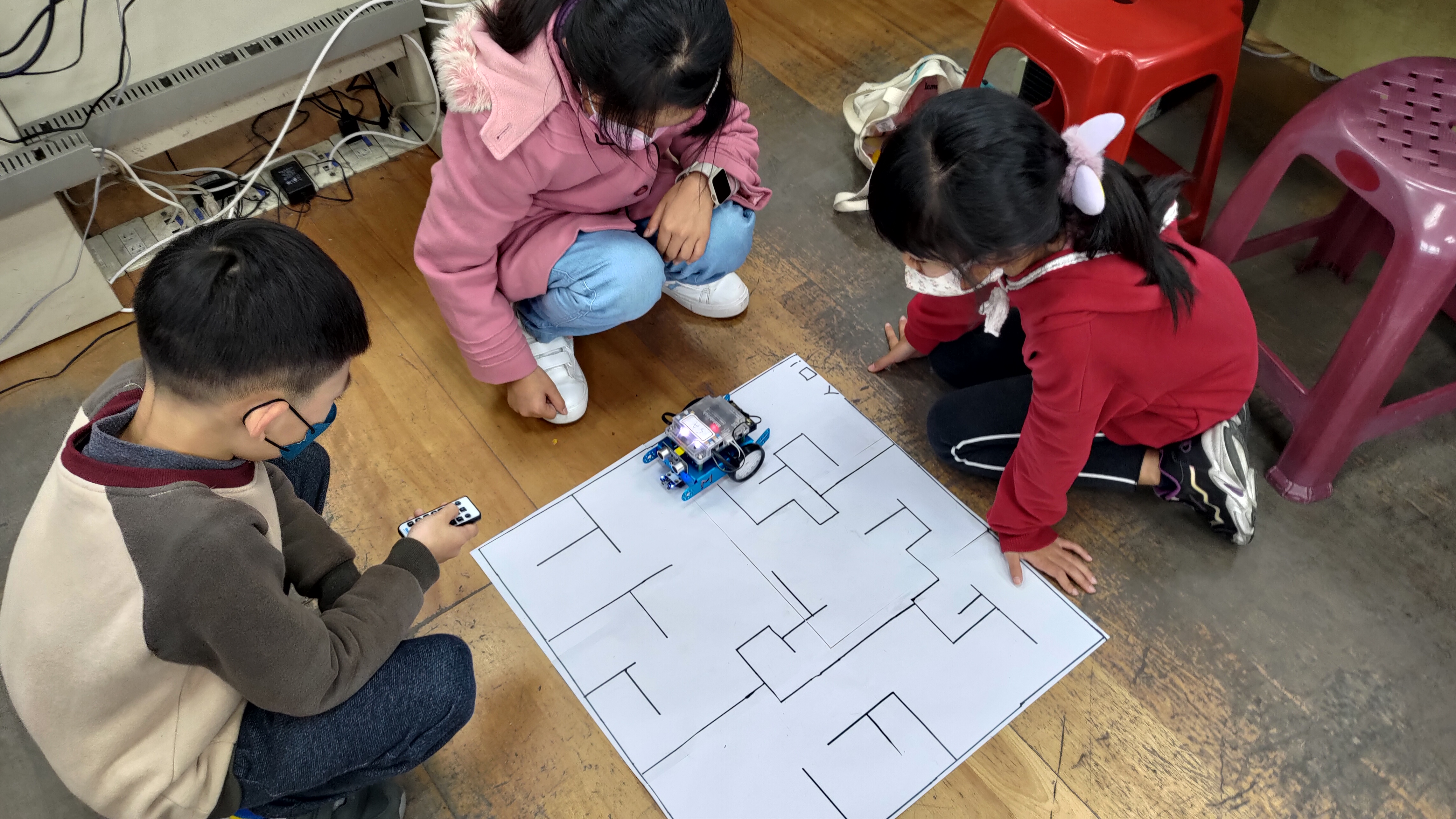 從操作中學習,讓寒假來的孩子們體驗電動車的組裝、測試、畫地圖,即使是中年級,透過老師指導,孩子也能將複雜結構的電動車輕易組裝起來,搭配紅外線遙控器,操作電動車在自製的地圖上奔跑、測試電動車的循黑線模式和避障模式。