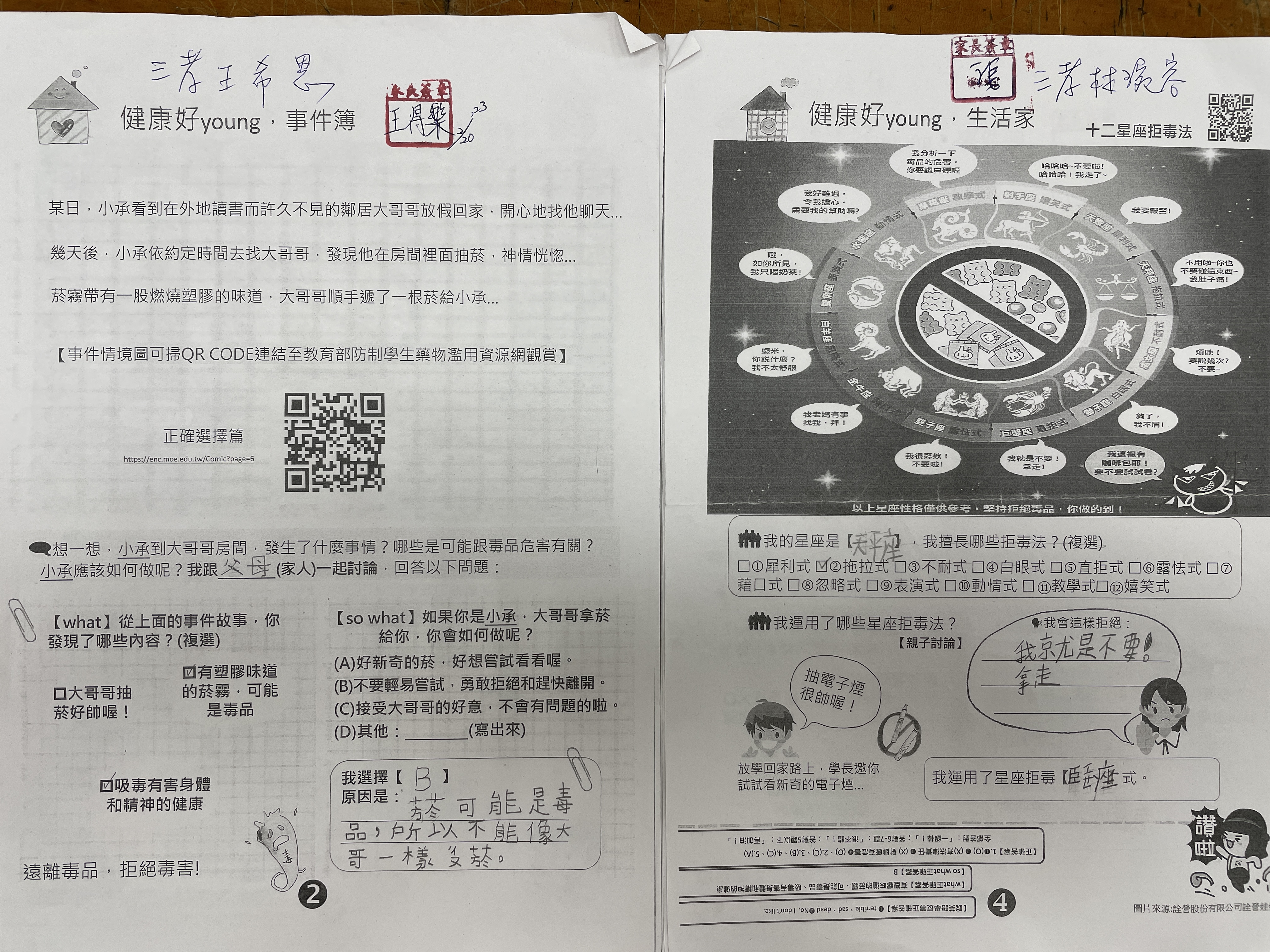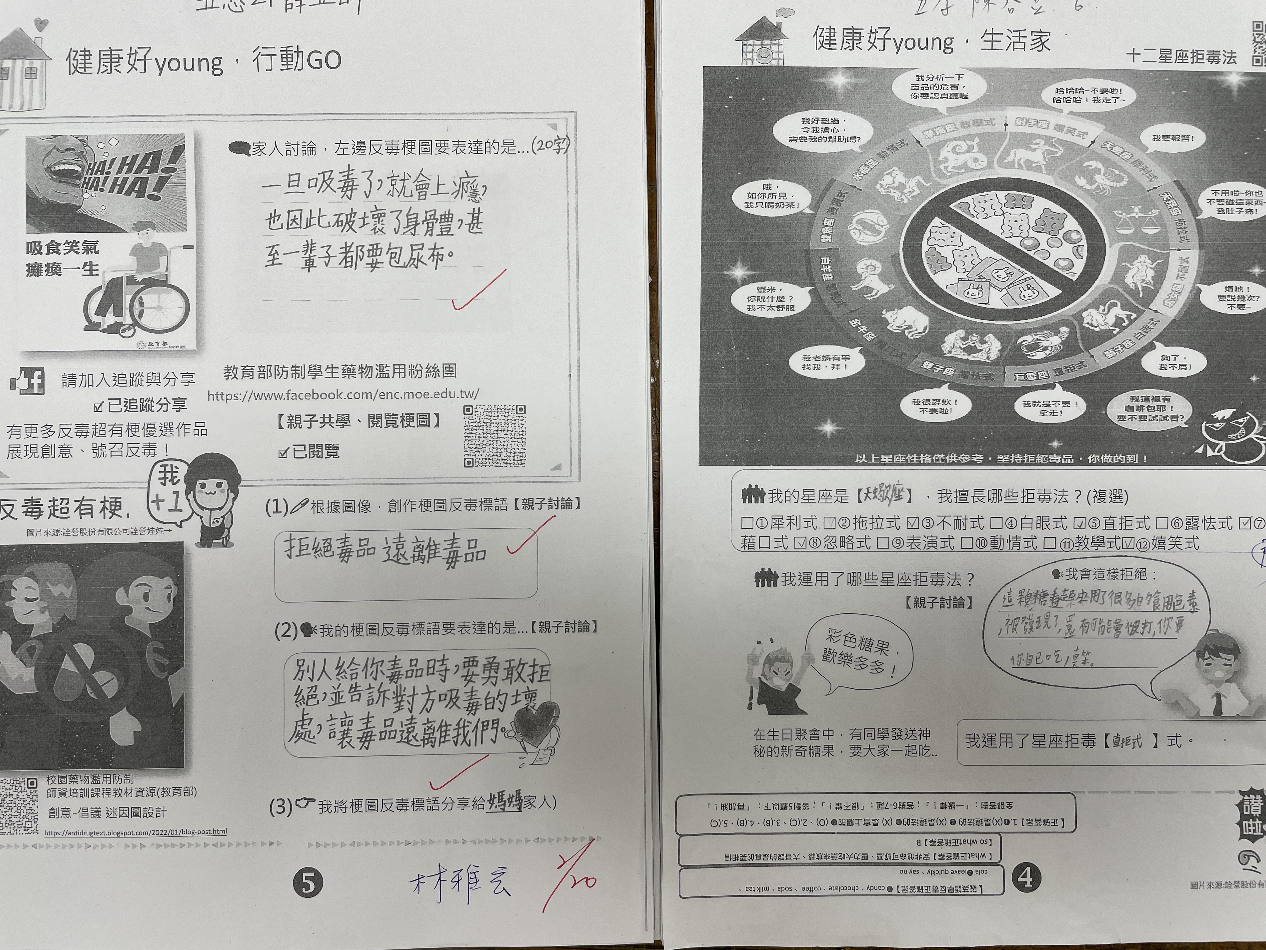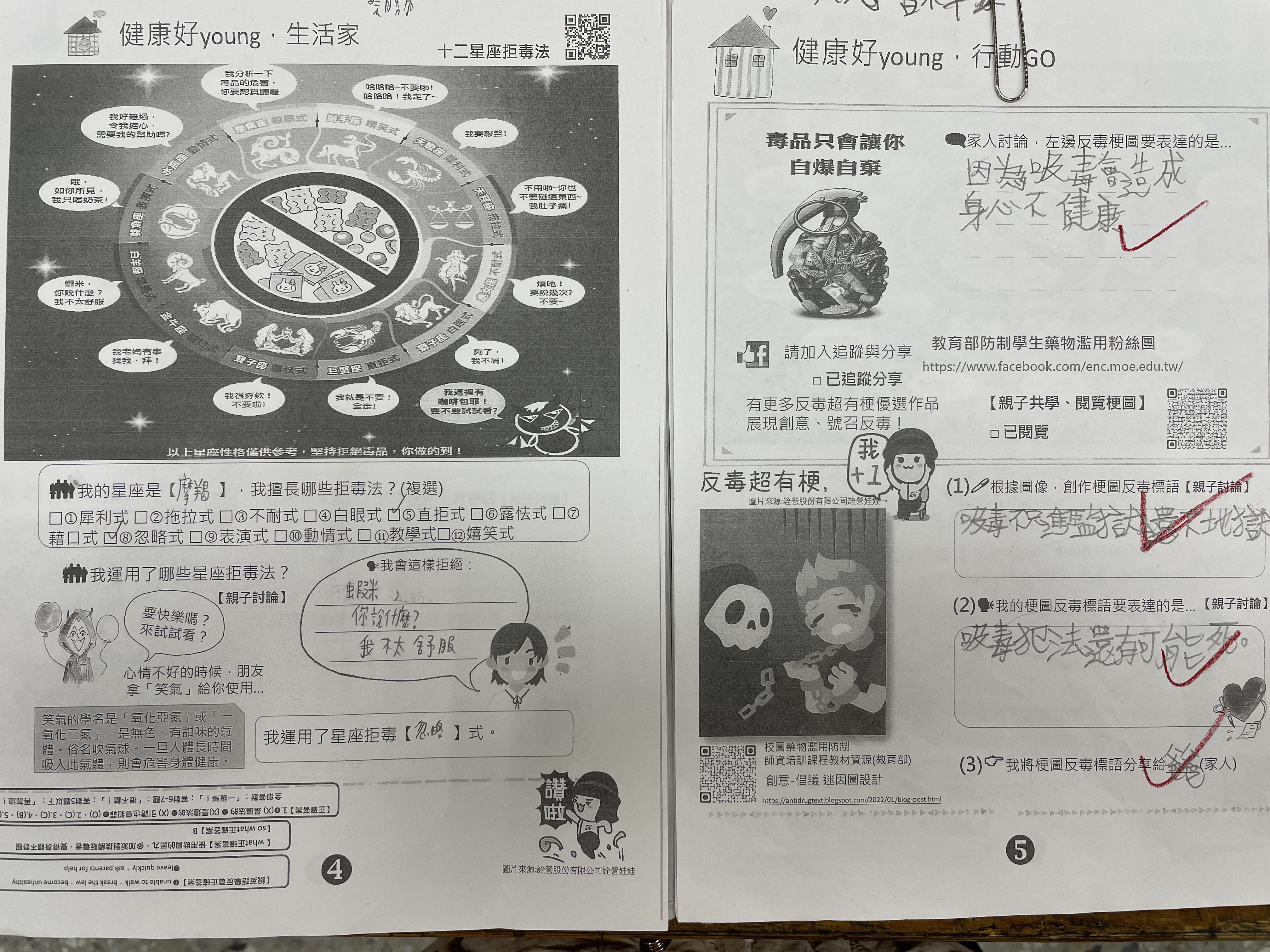 學期初發下反毒學習單,讓孩子回家與家長共同完成,了解毒品的危險性,也要清楚知道如何拒絕毒品!