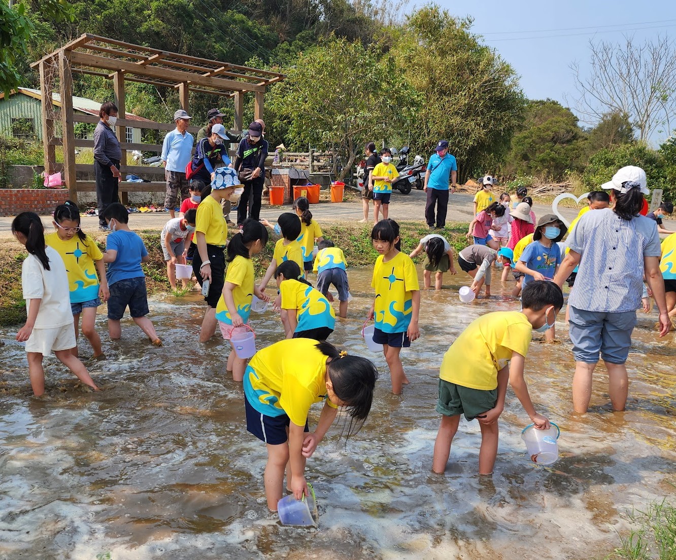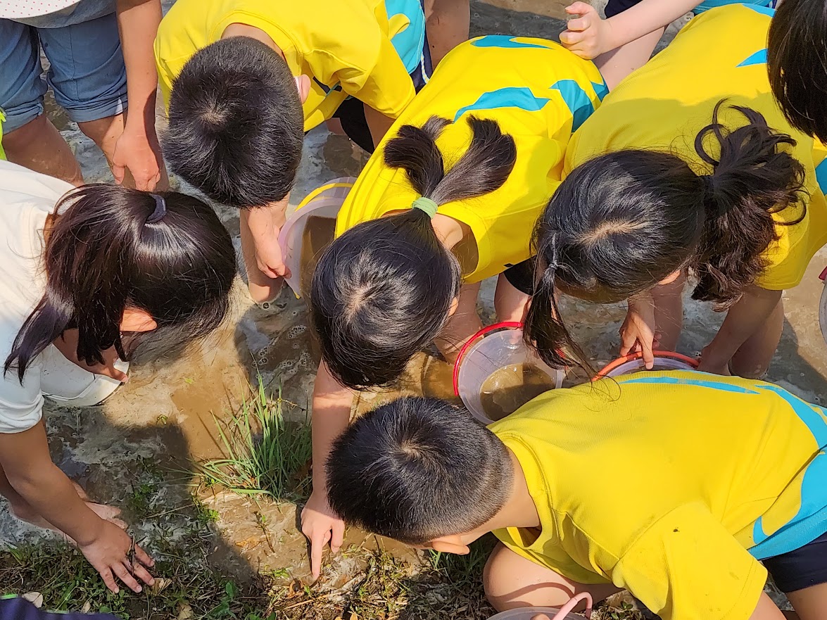 捉泥鰍是農家子弟兒時生活的小確幸,對出生於「滑世代」的孩子們來說,是新奇有趣的體驗!捲起衣袖褲管走進池塘,拿著小水桶,仔細尋找泥鰍小魚的蹤跡,原來泥鰍這麼滑、原來泥鰍喜歡躲在池邊草叢裡、原來用手是抓不到魚和泥鰍的……, 孩子們七嘴八舌分享著經驗,興奮地拿著撈到的泥鰍小魚和陽光媽媽分享,臉上的笑容很陽光!