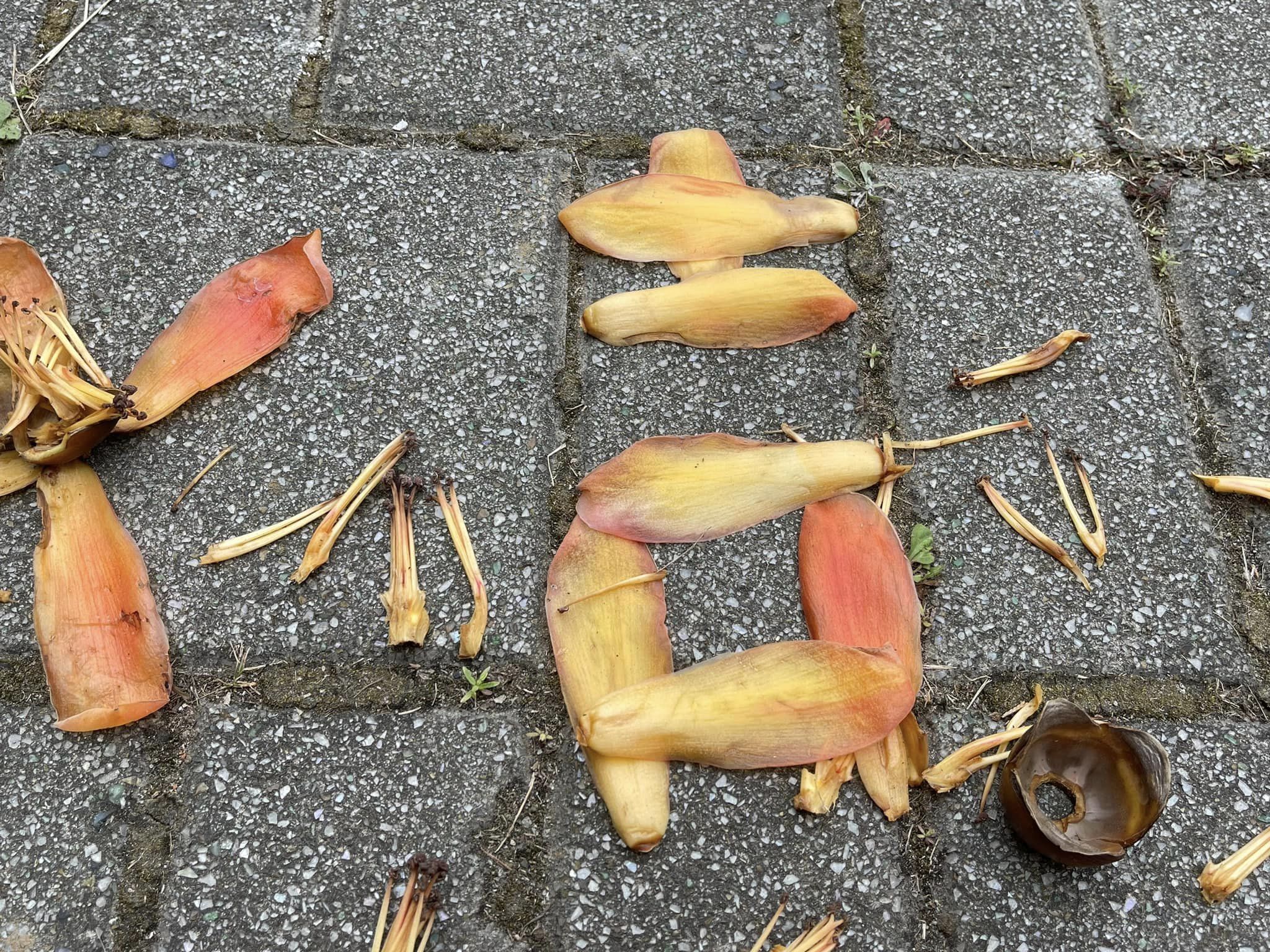一片接著一片的木棉花瓣下面,幼兒告訴我,裡面住著一隻蟲。昨天明明天氣炎熱,幼兒卻跟我說,因為天氣很冷,所以,蟲蟲躲在裡面。嘴巴說天氣冷,幼兒卻又說,他在木棉花瓣外面幫蟲蟲準備食物,要是牠肚子餓了,牠可以爬出來吃……。