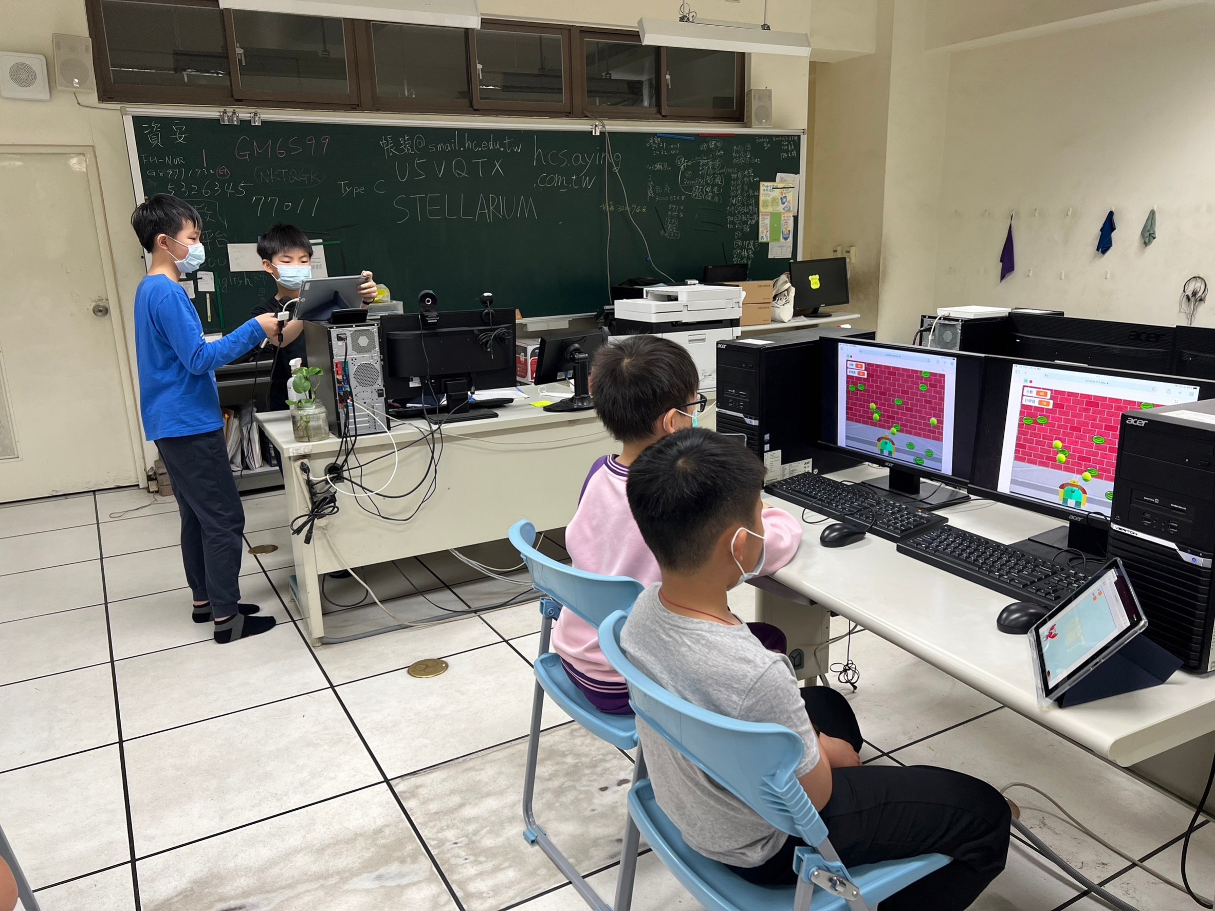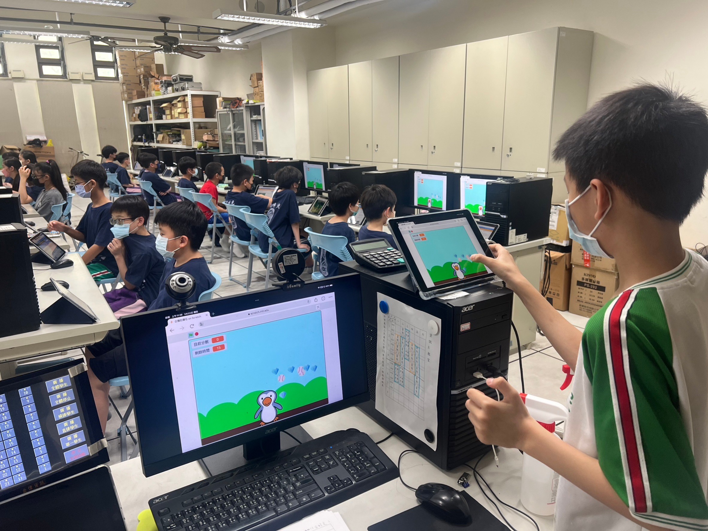 平時我們用電腦登入scratch網頁版,每一次的作業都會儲存在網頁上。在作業分享日的這天,大家使用平板登入scratch網頁,先試玩自己的遊戲,確認沒問題以後,就開始帶著平板到教室前面透過HDMI轉接頭,將自己的遊戲畫面分享到每一台電腦,然後操作自己的遊戲給大家看,學習的過程中,除了老師指導之外,同儕的作品分享也是另一種學習,每個人做出來的作品都有不同的特色,看到別人的作品,大家都覺得很有趣啊!!
