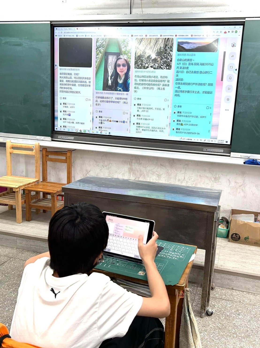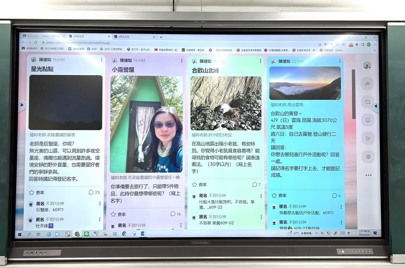 4/21.愛旅行的老師,也特別喜歡安排旅行課程讓學生們自主學習。這次以老師的高山露營行旅圖文分享,討論並記錄四個話題。即時回應並且能全體參與者互相觀摩,「Padlet」互動性高且簡易方便使用,搭配優良「觸控大屏」,讓師生們非常喜歡進行數位課程,輕鬆高效喲!
