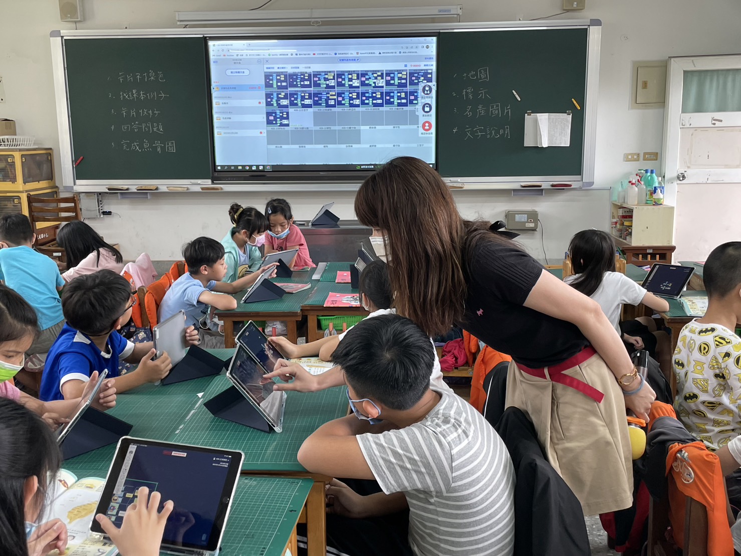 組長把答案投在大屏上後立刻發現有兩個組一樣,教師立刻直接進行更換縣市,接著教學生在LOILONOTE裡直接進行搜尋,使用拖曳圖片的功能,把小組任務完成。任務裡要有「台灣地圖中這個縣市的位置」,還要「查出特產圖片做文字說明」,在小組討論的時候,教師開啟學生互相傳送訊息的功能,組員可以分工搜尋圖片,傳遞給組長,由組長彙整,再上傳繳交給老師。