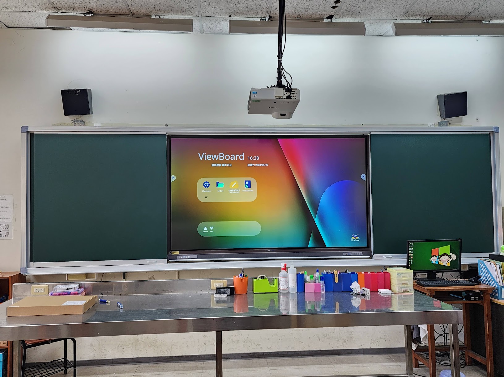 感謝市府核定7片鑲嵌式86吋大型觸控式互動顯示器及配合觸屏尺寸的黑板,5/27分別安裝於6間六年級教室以及1間自然專科教室。「大型觸控式顯示器」集合了單槍投影機、傳統互動電子白板、液晶電視、音響等教學設備功能,亦能安裝不同教育學習軟體,配合平板、增加學習互動及提升學習效果。在數位科技的時代,期盼資訊設備的更新,創新教學模式,翻轉孩子學習方式,改變課堂學習風景,打開孩子學習之眼、通往世界之窗,讓「學習」變有趣、「教學」更有效。