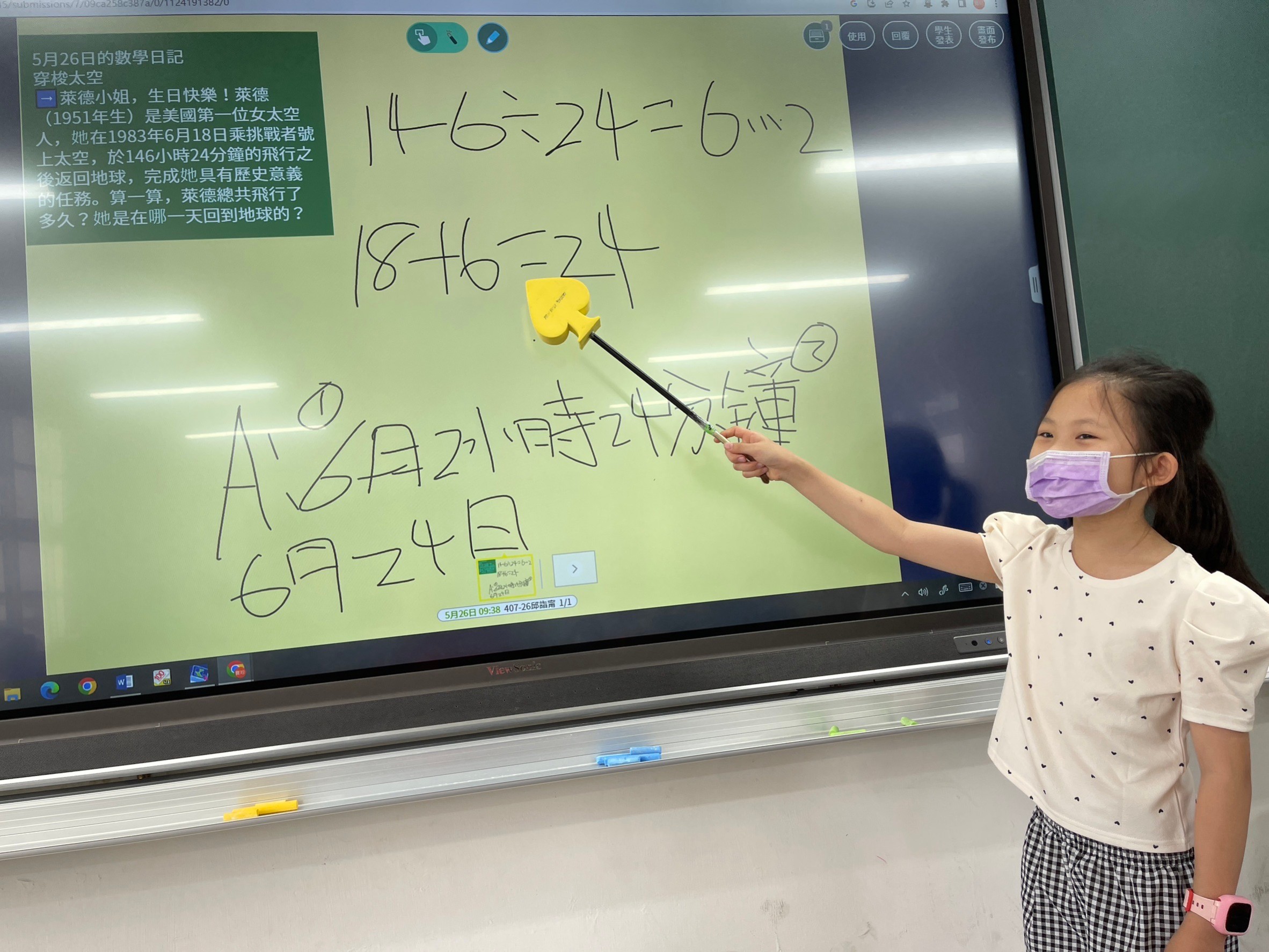 407的寶珍老師使用Loilonote搭配平板進行第九單元「時間的計算」課後複習及第十單元「規律」的教學。在課後練習部分,老師透過題目卡片的派送,每生都認真的在自己的平板上作答,將思考歷程記錄下來,還能即時將學生的畫面在大屏上顯示,學生上台跟大家說明自己的思考模式,非常的方便且清楚,全班一起透過討論,將數學的概念釐清得更好,學習更有效率。