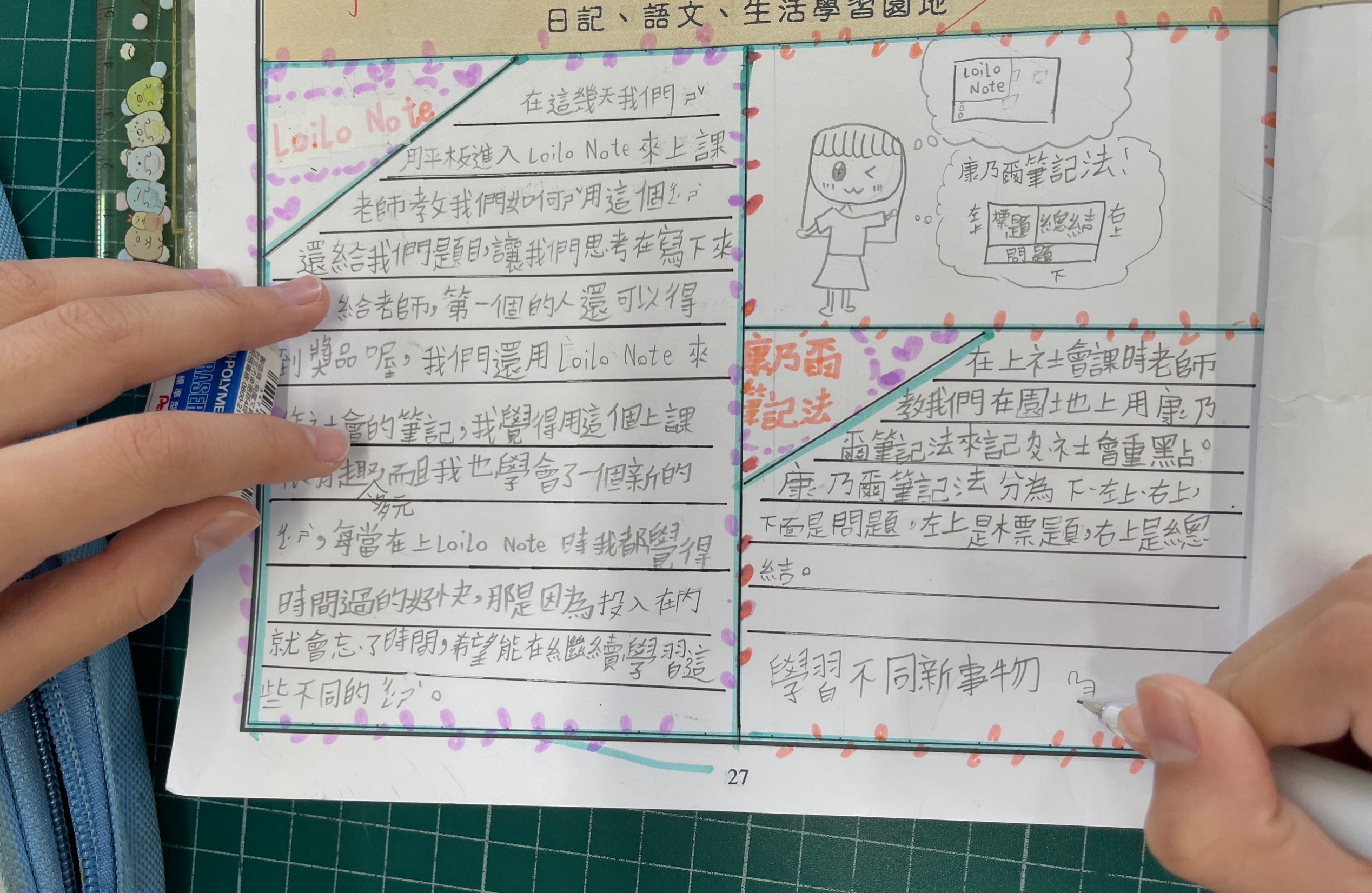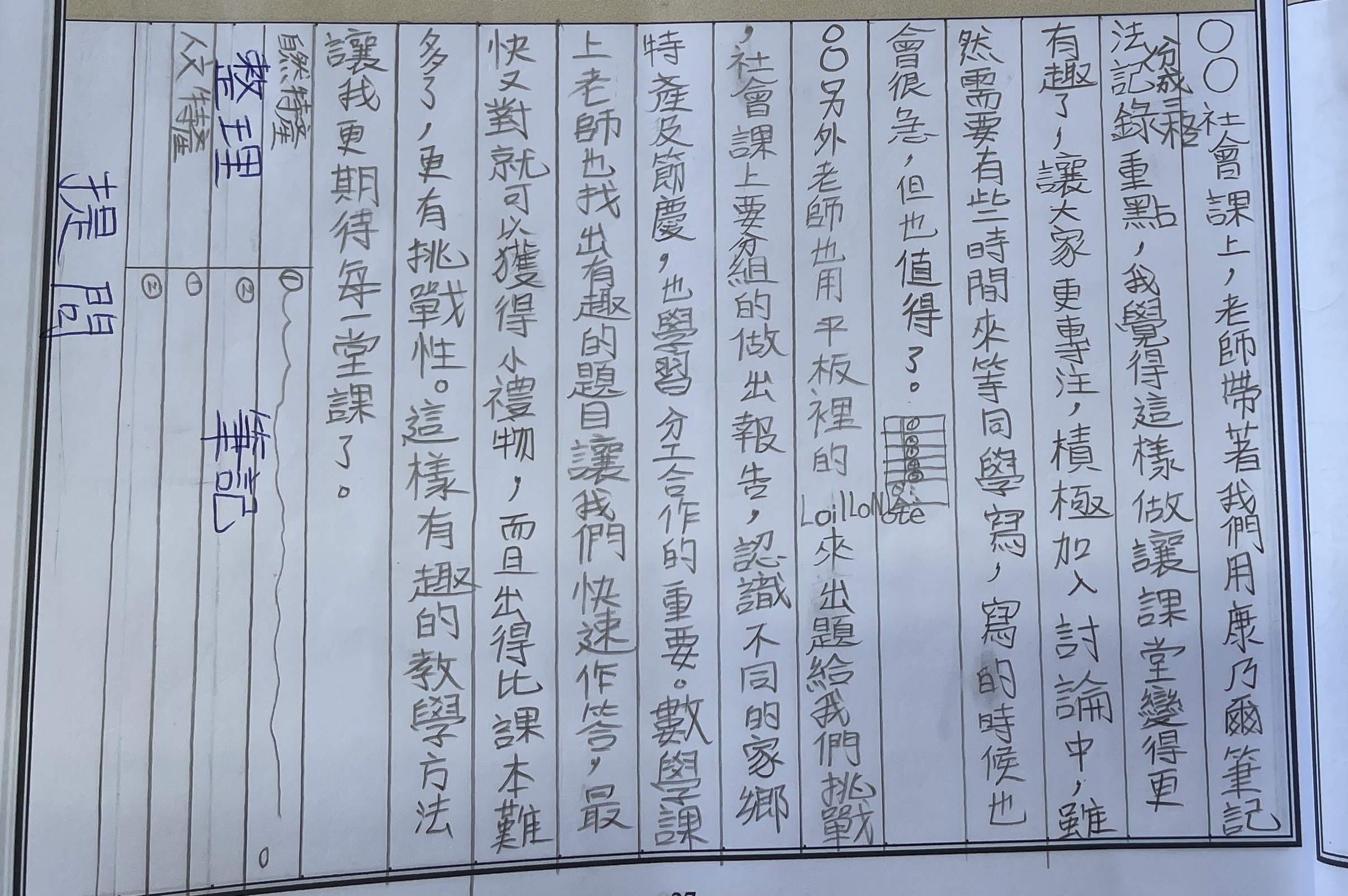 407的寶珍老師透過Loilonote來進行社會課的教學,今天的課程內容要完成上次教學的分組報告,學生透過Loilonote學習後,分組報告也透過網路搜尋相關資訊,來完成家鄉的報告。接著在「走讀書海」這堂課,讓學生延續學習的積極態度,驗收他們的學習成效和感受,讓學生做課後的省思,請他們在聯絡簿上做紀錄,讓課程有一個完整的歷程。老師也跟學校行政端分享,數位時代,教室裡有平板根大屏真好用,對於教與學非常的有幫助。