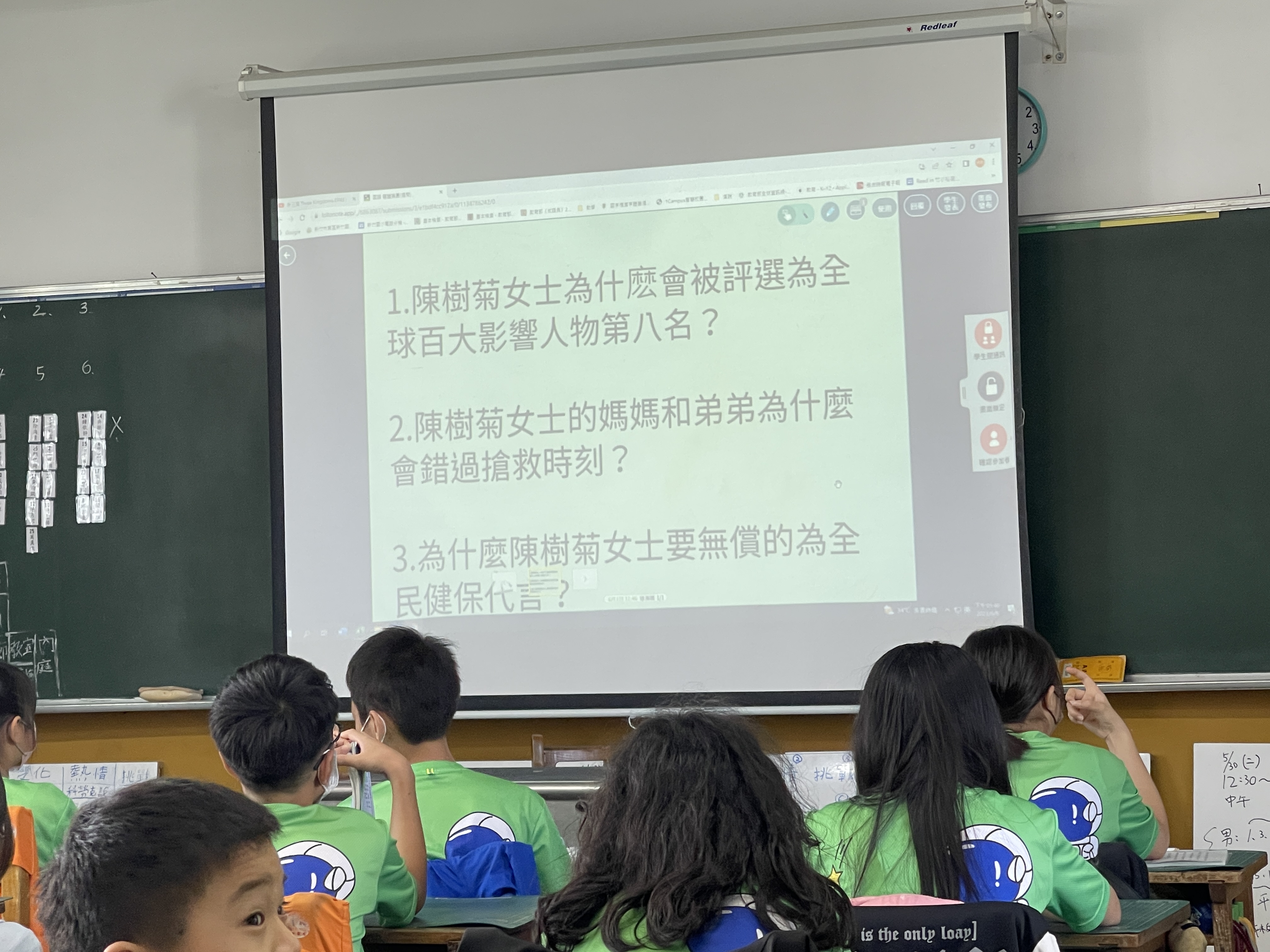 學生閱讀完陳樹菊的故事後,深入分析文章,經由提問、討論,增進理解能力,將所提問的內容發表在LoiLoNote,每位學生使用平板,皆可以看到彼此想法,激發學生思考力,提高閱讀理解和語言運用能力。老師也可以即時查看學生在平台上的註記、提問和回答,從中了解學生的理解程度和學習需求,並且針對性地給予指導和回饋。