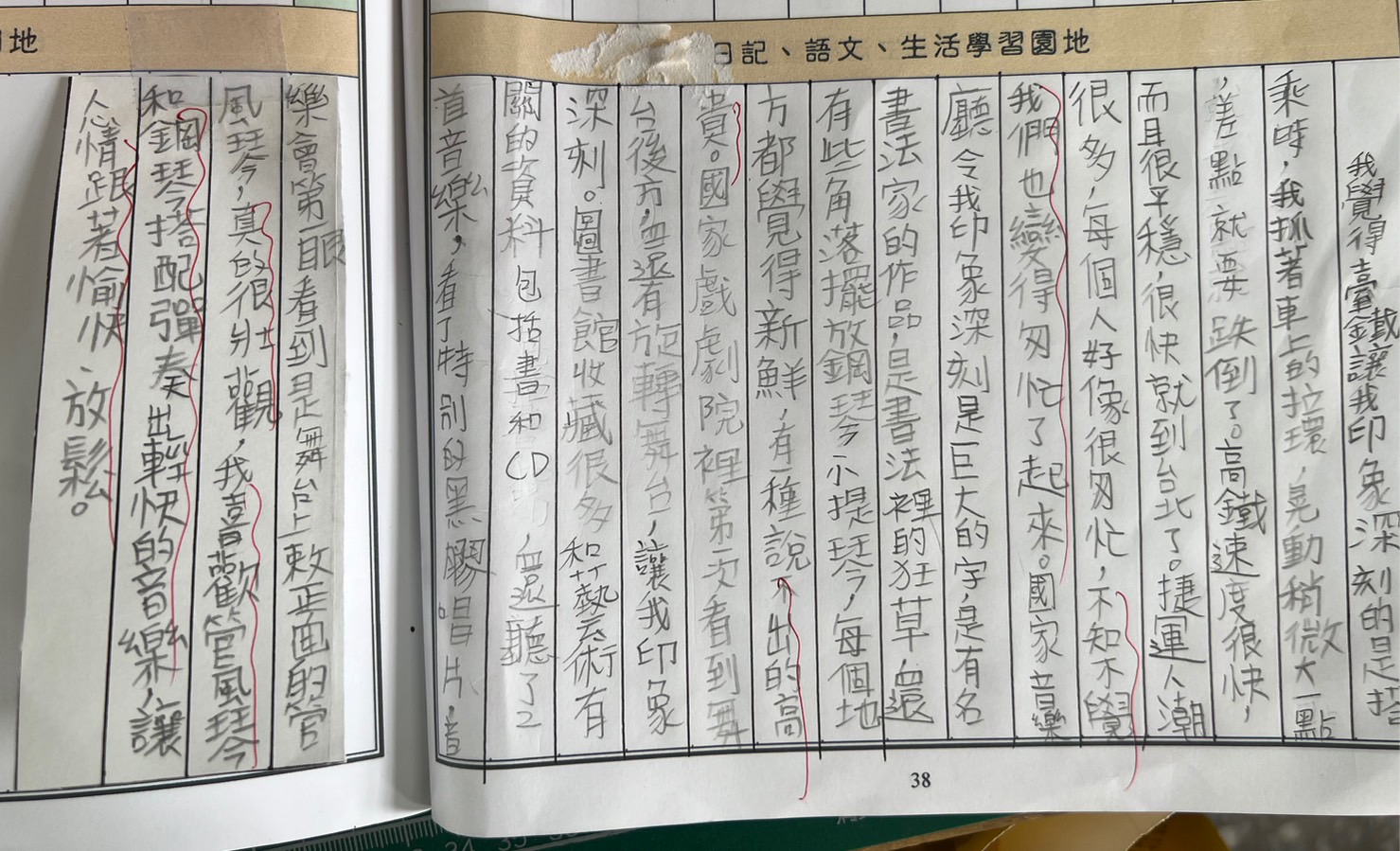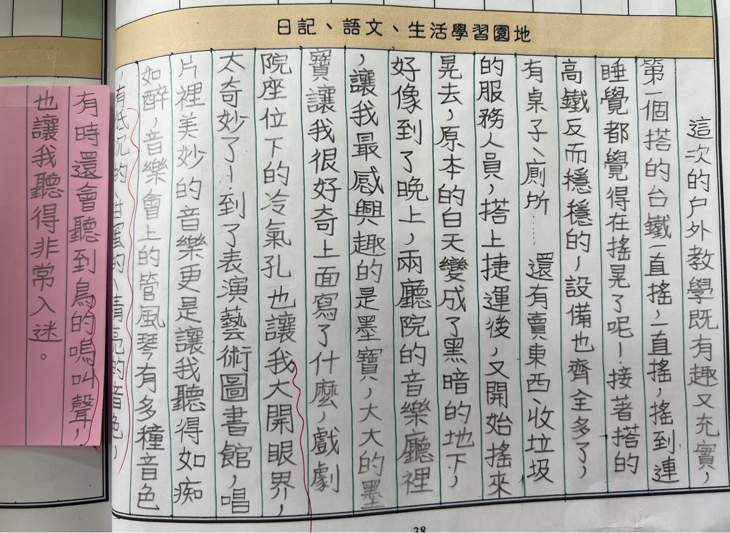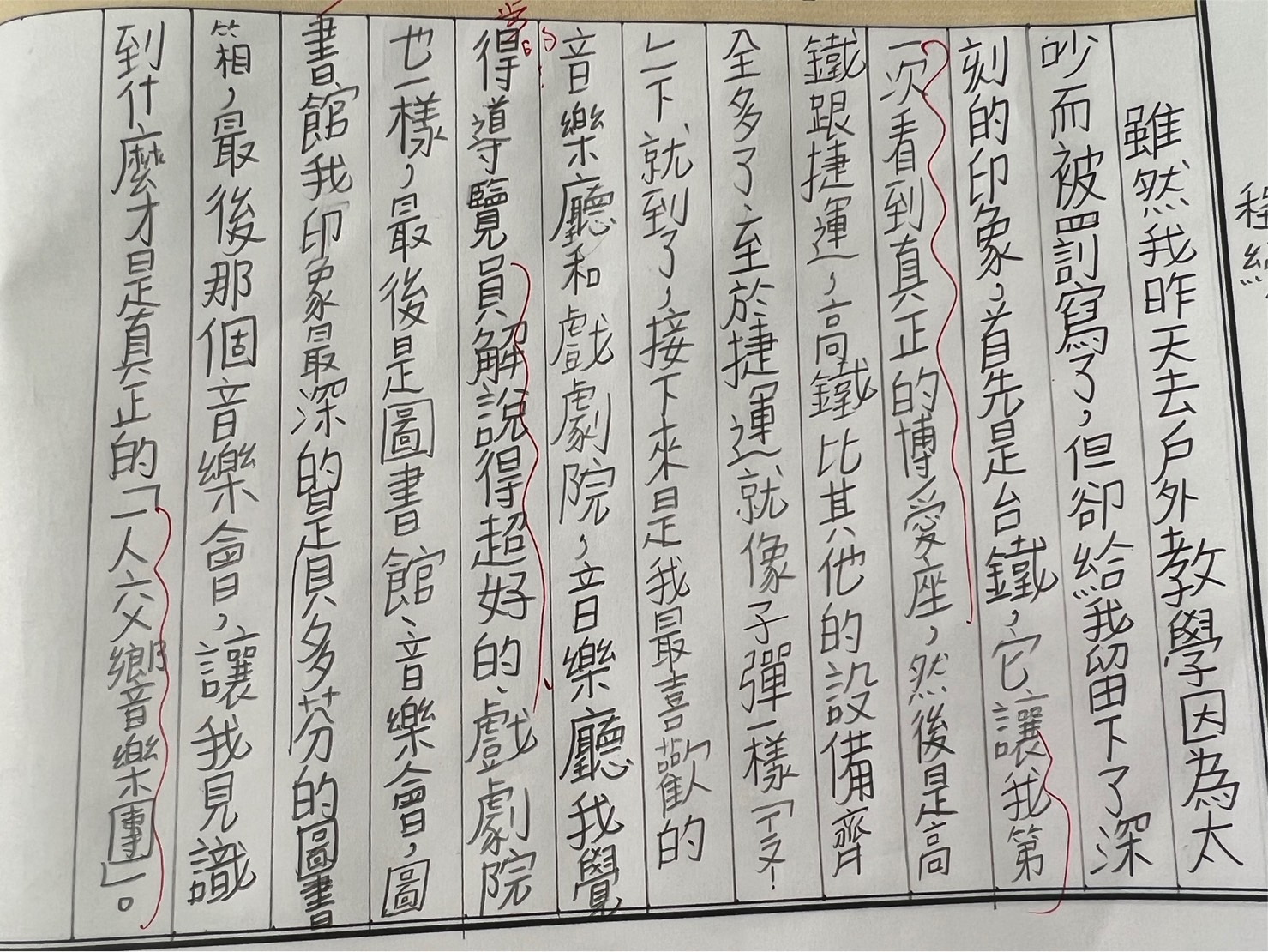 408佳鷺老師在安排本次的戶外教育這堂課,是透過國語文課程「參觀OO的心得」開始發想,和407的寶珍老師帶著二班孩子共同安排規畫,從事前的國語文、社會科課程開始進行,透過數位生生用平板協助課程教學,在參觀完兩廳院後,不忘再回扣到一開始的出發點「參觀OO的心得」。孩子在進行一連串的課程後,戶外教育的學習效果也出奇的好,在聆聽講解時學生主動作起了筆記,疑?老師沒有交代耶!!!但學生卻自動自發的為自己進行了這個記錄的工作,讓老師看了好欣慰阿~回家後,大家在聯絡簿上寫下這次的心得,為這段美好的學習做了最美的完結。學習的美好在於孩子喜歡,並能投入其中,擁有學習的動機與慾望,並且為自己好好地做紀錄,所以這堂課,學生學習到的不僅僅是這節課的內容,而是他培養了一生學習應有的態度與習慣。