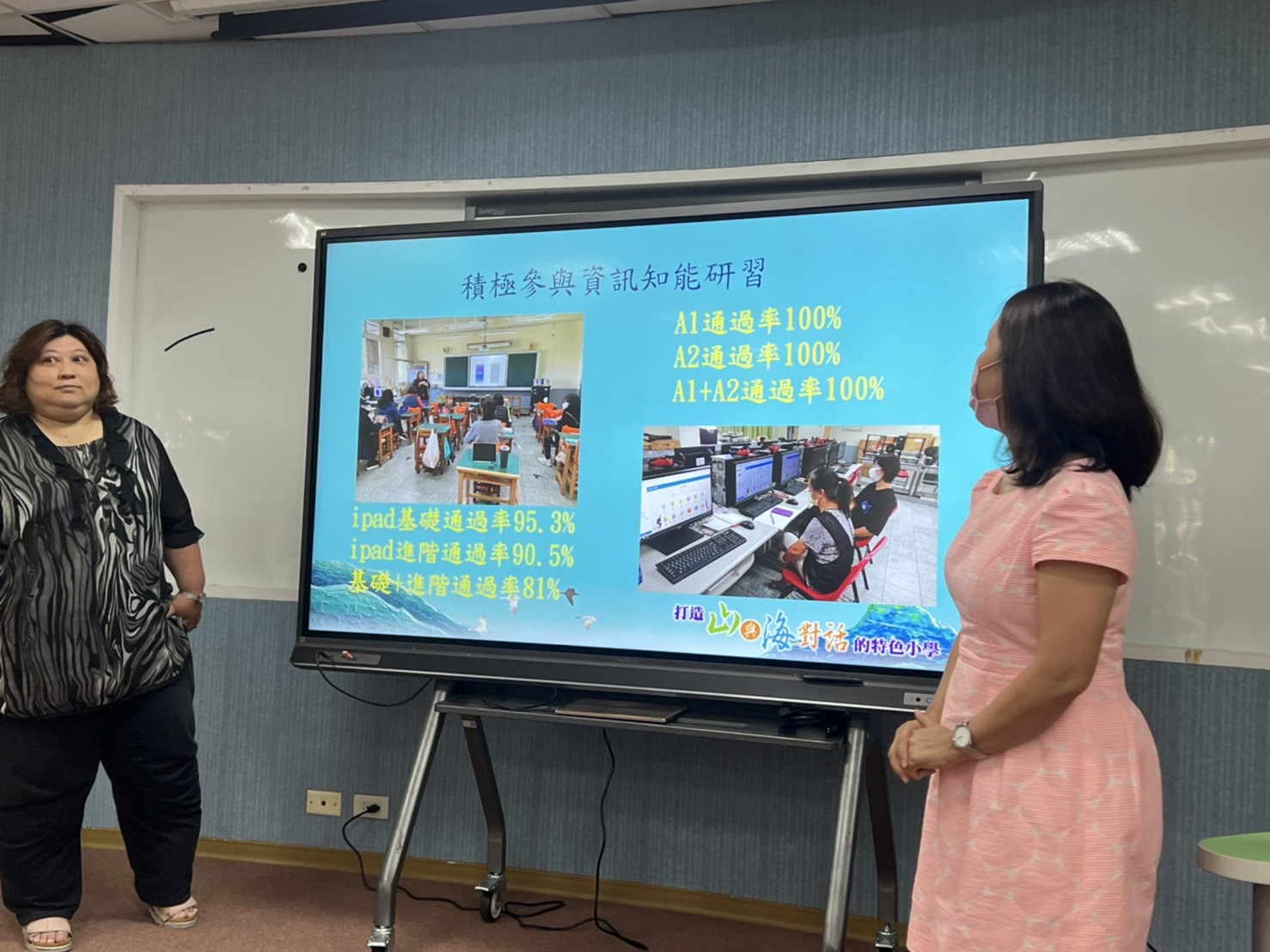 112年6月28日(三)下午,朝山國小校長和楊佳芳老師一起前往教師研習中心進行112-114年度推動中小學數位學習補助觸控式螢幕暨一師一載具實施計畫簡報。去年(111年)佳芳老師撰寫計畫為中年級四個班級爭取觸控式螢幕,今年五月安裝完成,老師使用後反應良好,對學生學習有正面的幫助。今年佳芳老師繼續爭取學校教學設備努力撰寫計畫並製作簡報,希望給孩子更好的學習環境。