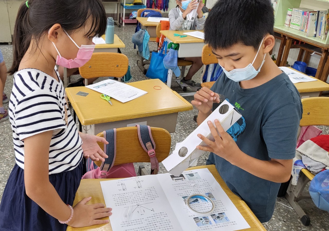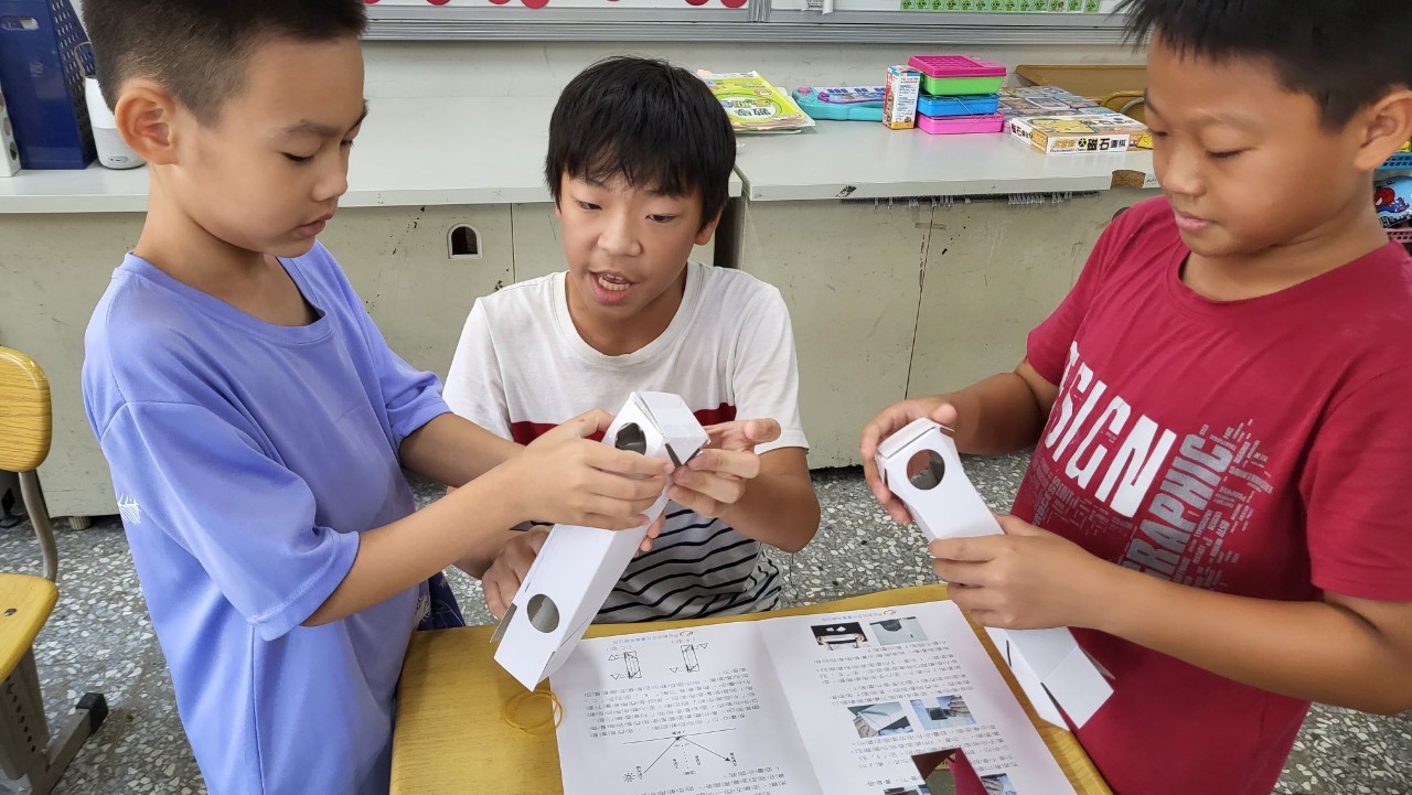 製作活動,讓孩子們先藉由影片來了解原理,緊接著,讓孩子們動手製作。在完成作品後,孩子們開心地帶著自己的潛望鏡,走出教室,在戶外四處探索、觀察學習。