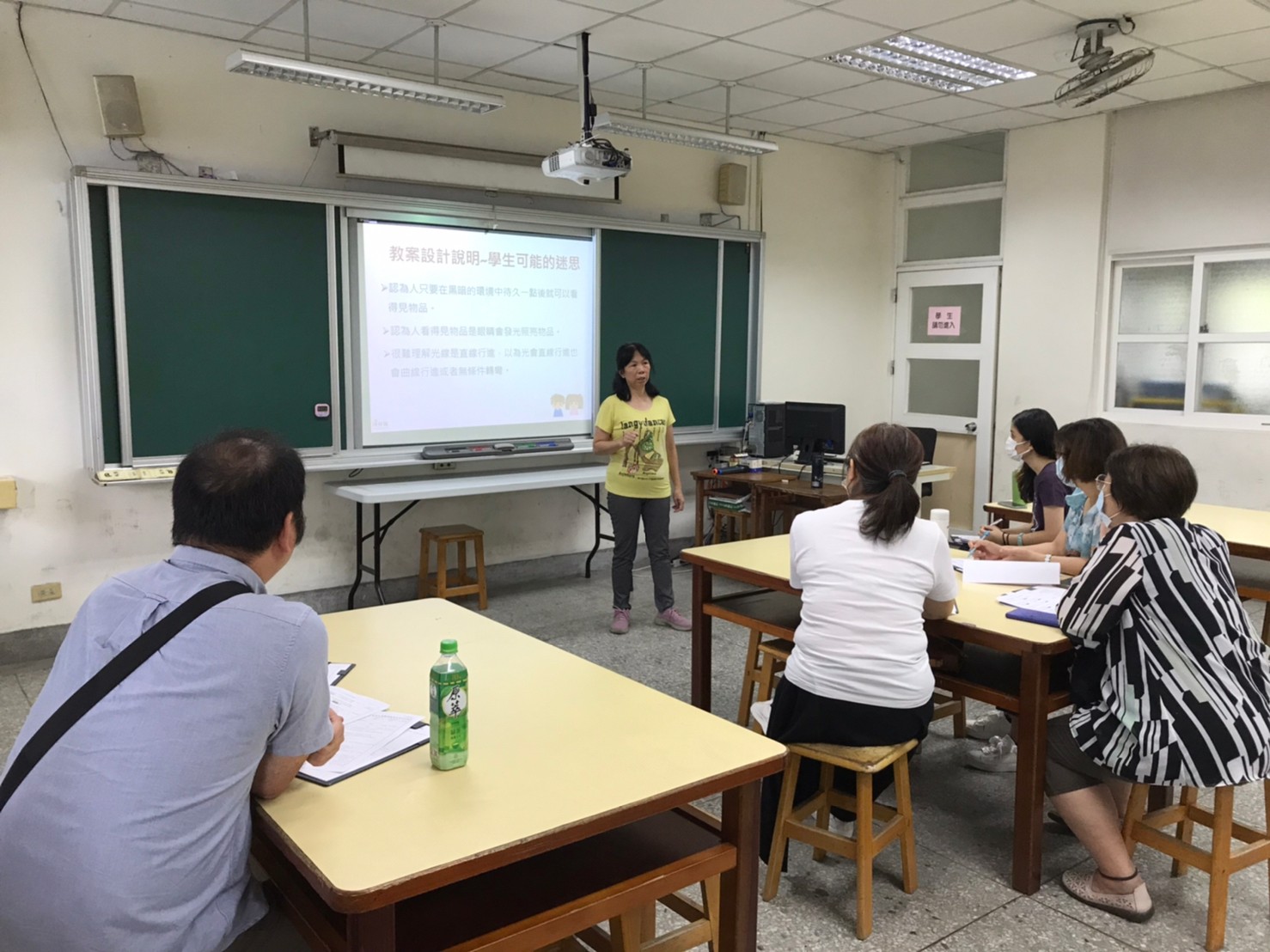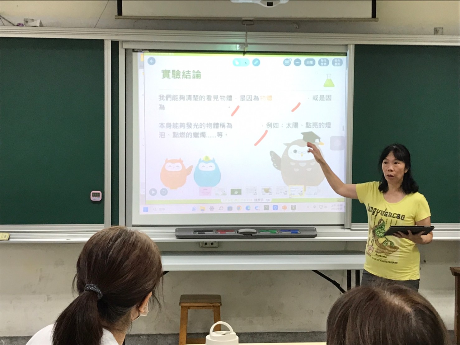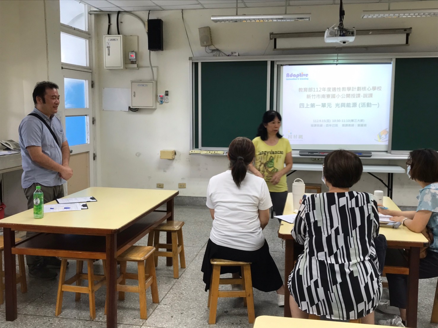 南寮國小教務主任當為表率身先士卒,首先示範在自然領域中如何加入數位學習,讓老師更能掌握每一位孩子的學習歷程,更知道如何協助不同孩子的學習困境。今日課程,以四年級第一單元光與能源中活動一光的行進方向,從學生的迷思開始與孩子討論我們是如何看見物體的?再帶領學生探究找尋答案。這一堂課主要目標是學生將自己的實驗假設實際實驗觀察結果,透過數位平台在課堂上讓各組的結果互相解說釐清想法,得到大家共同認為合理的想法。最後在使用因材網的教學包驗收學習成效。