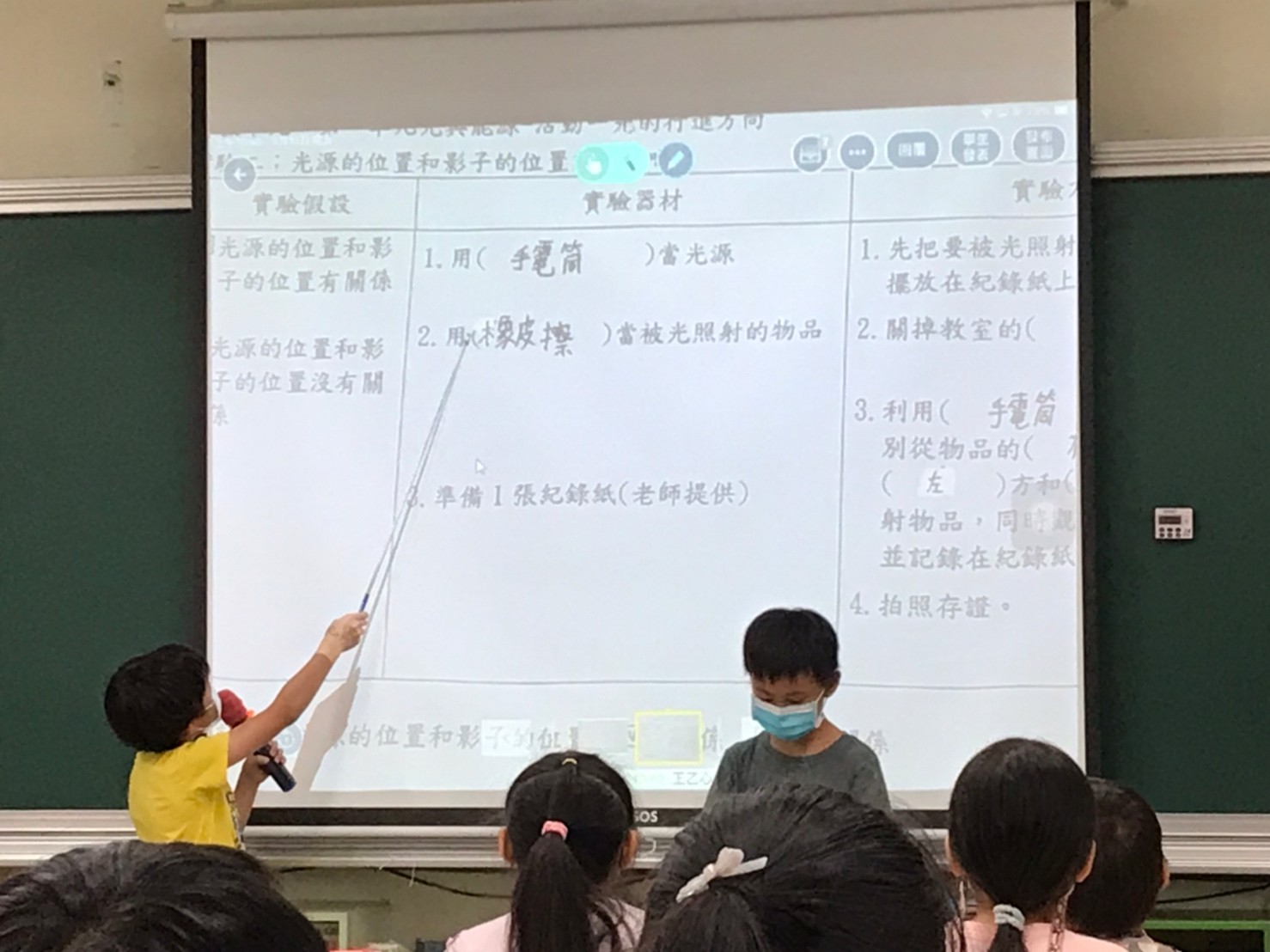 今日上課老師-麗娟主任,上課班級四年己班。本堂課,學生主要學習目標-瞭解光遇到不透明物體時,光會被阻擋而形成影子,還了解影子的方向是在光源的反方向。學生各自完成自己的任務,實驗,完成任務單,紀錄結果以及上台發表。每位孩子從一開始的緊張到最後的穩重自信,整堂課老師與學生皆樂在學習的氛圍中學習,讓觀課老師也浸潤在快樂學習的情境中。
