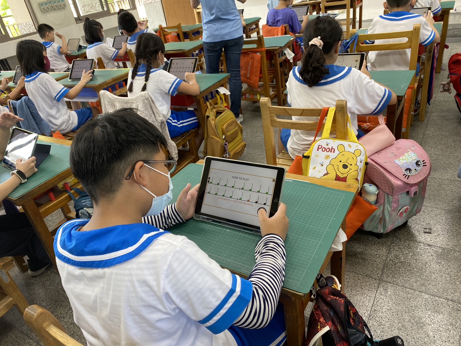 數位科技融入藝文領域音樂教學探討,透過科技載具訓練學生節奏能力及節奏樂理知識。三年級音樂課程中樂理教學目標認識四分音符、二分音符、全音符、四分休止符,學生必須能說出音符正確名稱且能拍出正確節奏外,在音樂課堂當中藉由數位科技融入音樂課程,利用平板電腦當中的Rhythm cat,讓學生結合背景音樂配合音樂的速度來練習節奏,學生看著螢幕上顯示的節奏跟著背景音樂一起拍奏,不同關卡背景音樂不同、音樂速度也不同,學生必須能跟上音樂速度拍練節奏。透過數位科技遊戲式闖關活動檢核學生對拍節奏的認知。在平板電腦上操作時,不同關卡有不同目標,且能立即回饋,讓學生對節奏學習更有興趣。