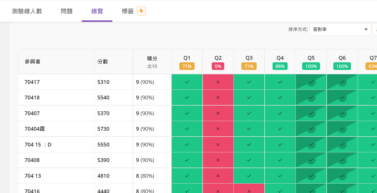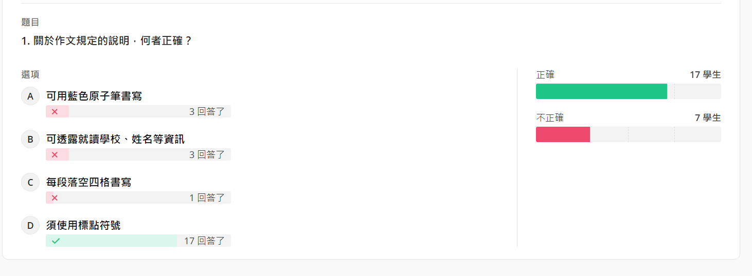 教師利用學生寫作常見問題與病句,透過Quizziz的測驗平臺,以競賽模式刺激學生思考,另外,學生完成測驗後得以即時檢討,透過成績報表得以查看每位學生的作答情況,提供老師針對不同程度的學生進行差異化教學,增進學習成效,有助於學生辨識自己的寫作盲點。