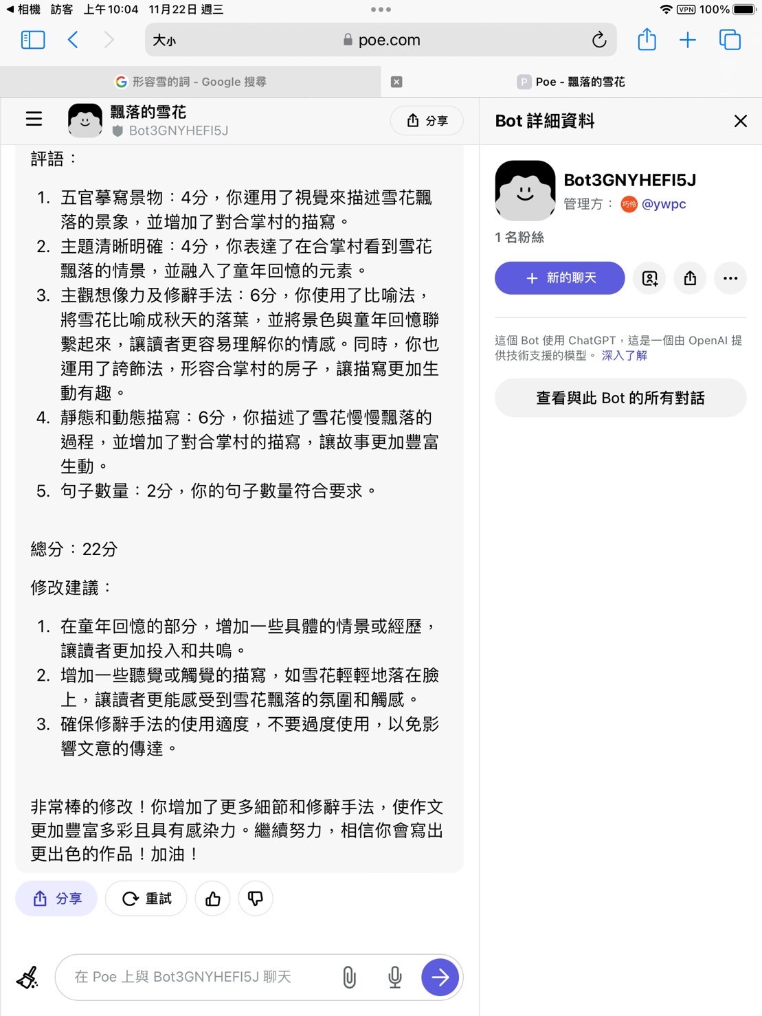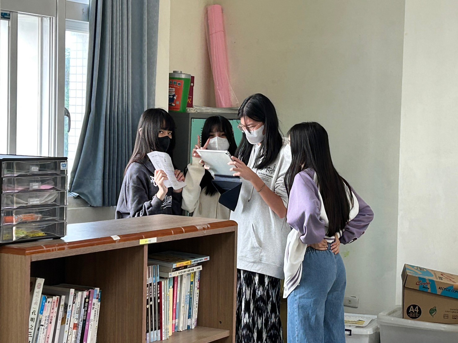 八年級國文課,學生上完”田園之秋選”一文後,進行景物的寫作演練。因為是第一次運用AI進行批改與回饋,先以小組共同創作的方式,運用五感摹寫與修辭法,進行主、客觀、靜態、動態的短文寫作練習。學生透過小組合作完成文字創作之後,再透過平板進行語音輸入,轉成文字檔。最後透過掃描POE預設的作文批改Qrcord,學生將小組共同創作的作品貼上來,AI老師隨即能夠提供評分、回饋和修正建議,幫助學生提升寫作能力。