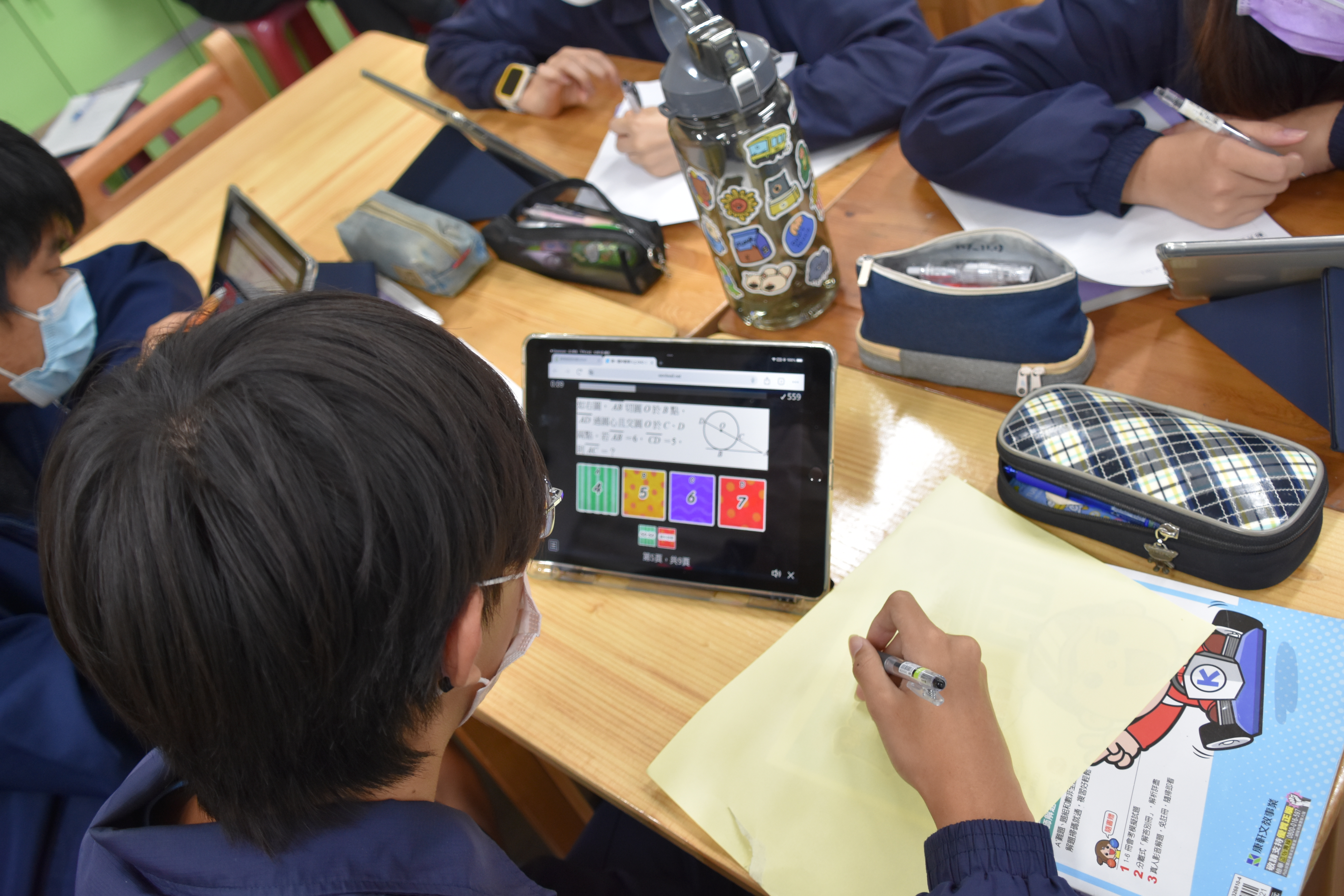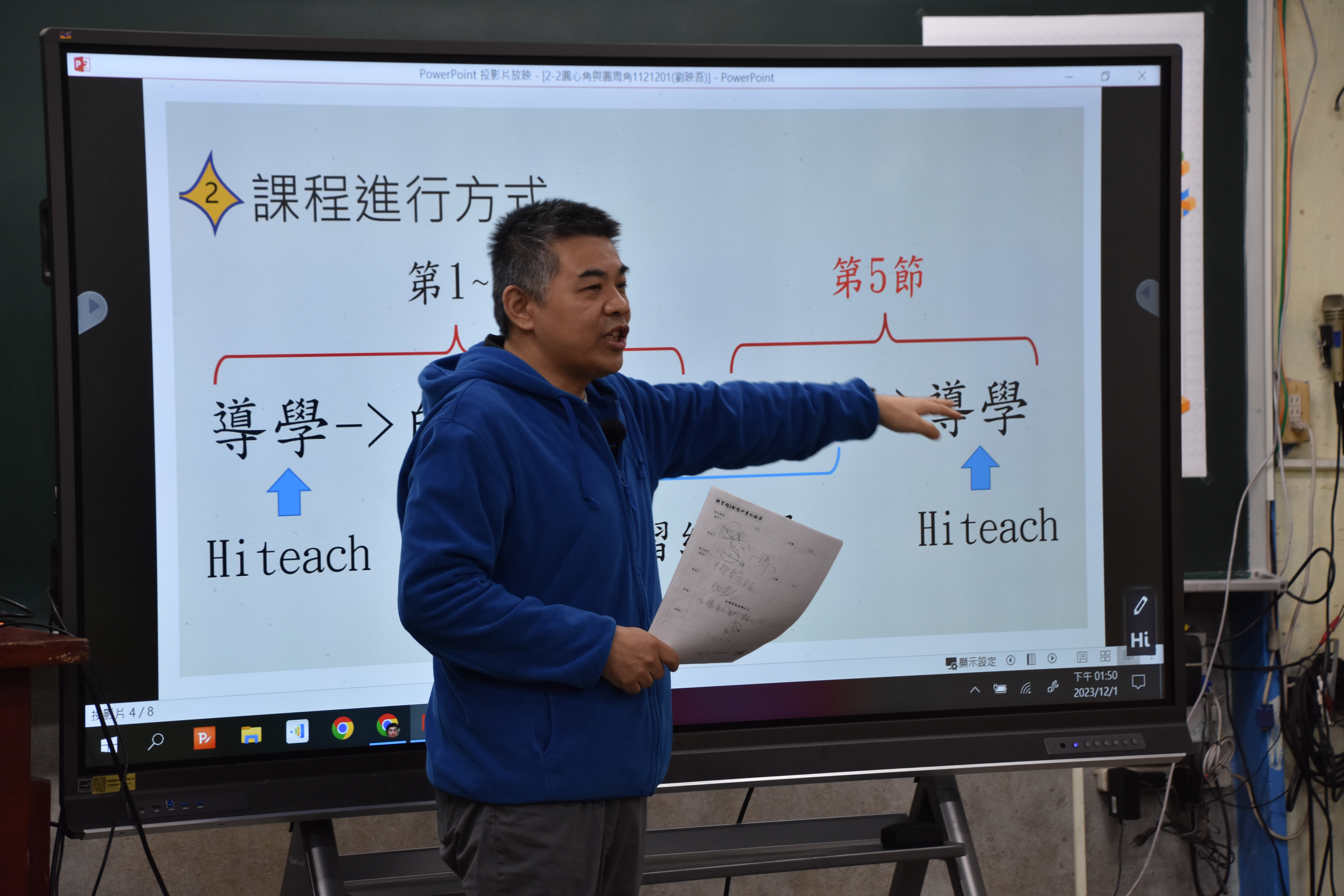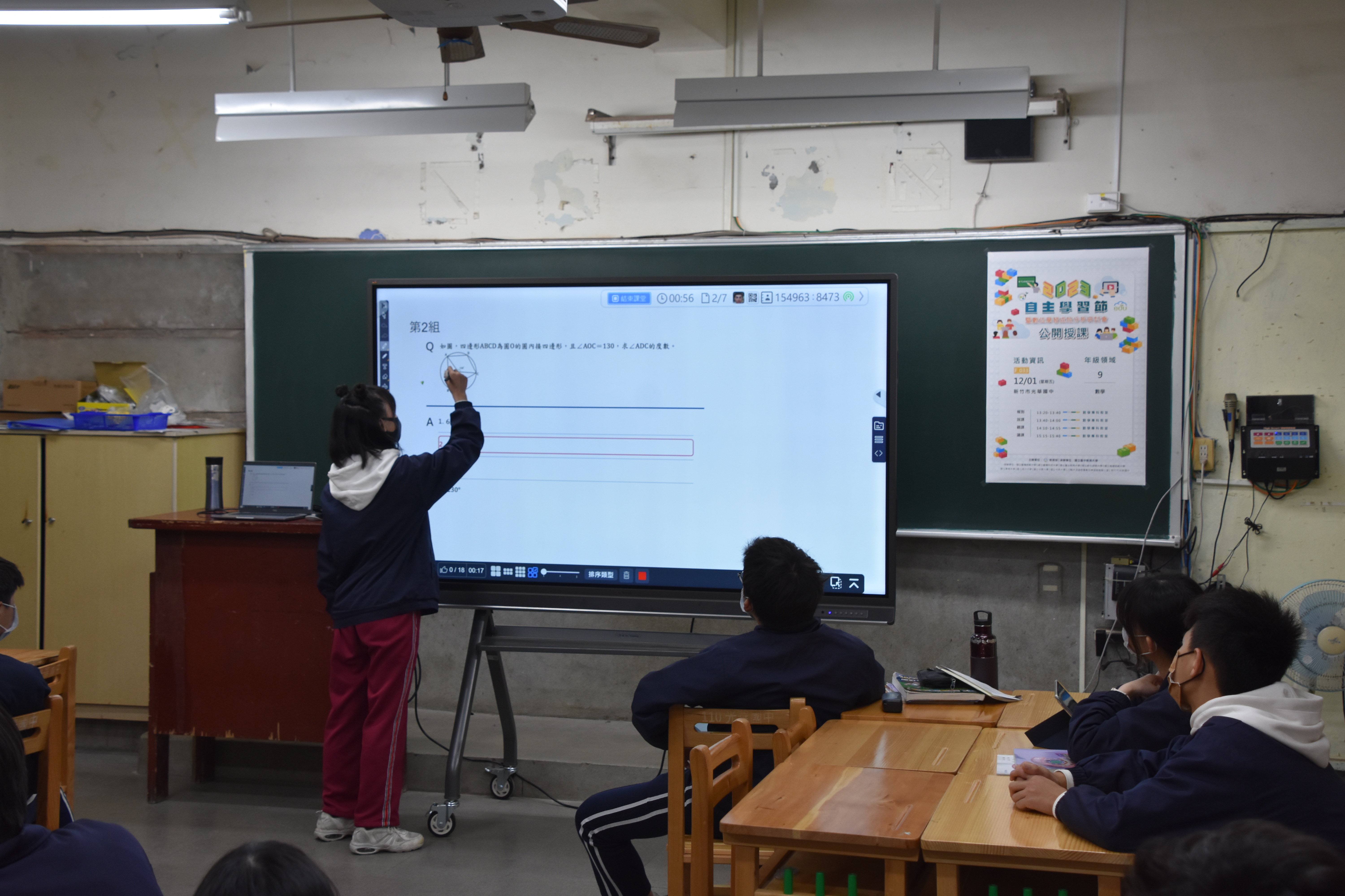 為了符應這樣的教育趨勢,學校的數學科劉映吾老師於12月1日(五)下午進行了一場全國的公開說觀議課,藉此響應「教育部自主學習節」課程。今天的這堂課教授的是數學科九年級的單元2-2圓心角與圓周角。課程前面已經進行了四節課,在第五節課中,映吾老師先透過學生之前的診斷報告進行分組,讓小組夥伴從錯誤的題目中挑選要討論的題目並進行上台報告,過程中映吾老師從旁協助學生操作平臺並觀看學生的學習歷程,藉此了解及掌握學生個別的學習狀態,同時,在各組報告時利用因材網進行組內與組間互評,整合課前、課中與課後的學習活動,提升課堂教與學的雙向互動,然後讓學生填寫後測練習卷,再依據平台診斷報告書各自錯題訂正,最後會運用Wordwall進行課後的評量測驗,利用即時反饋系統建立師生彼此的互動機制,結合數位載具來記錄管理並分析診斷學生學習狀況,如此一來,教師可以有效掌握學生的學習歷程,分析學生學習的因難點,隨時提供學生必要的指導與補救。