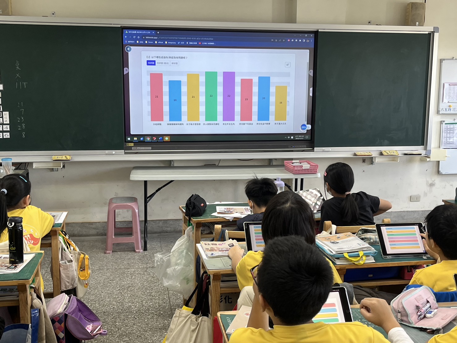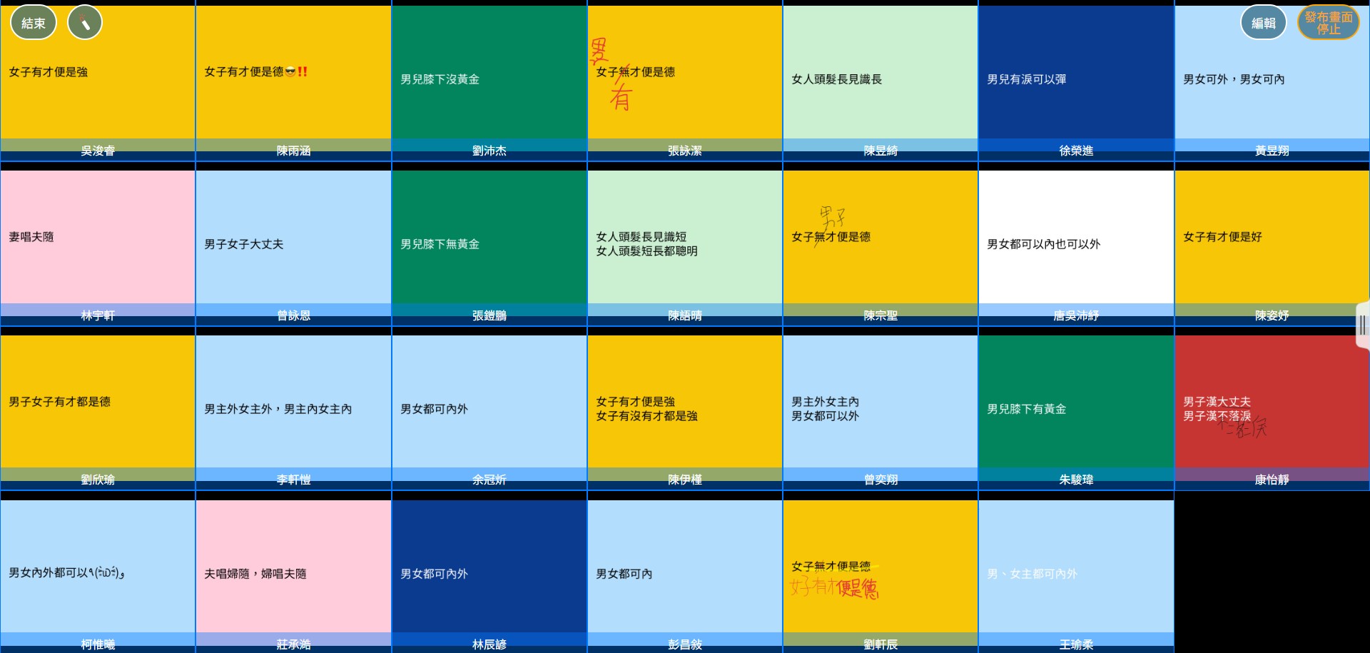 結合南寮國小數位學習精進方案「LoiLoNote School」互動教學系統應用,六年級社會科第五單元家庭性別新關係,安排『性別平權測驗』、『大家來找碴』及『成語大改造』等活動,六甲的孩子透過平板使用LoiLoNote平台進行以學生為主體的雙向互動教學,一起欣賞性別影片,並提出問題,投票選出可能具有性別刻板印象的成語,最後自己挑選一個成語進行改造,利用課間完成作業卡,傳到繳交盒裡的成語大改造作業裡,在下一節課一起欣賞同學們的改造成果,破除性別刻板印象,達到教學相長、學習精進的目的。
