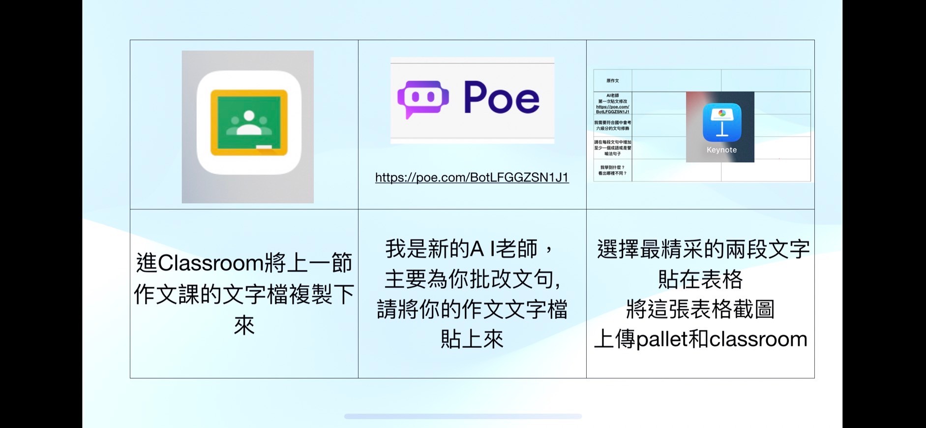為了提升學生作文學習的成效,近期引入批改文章與修飾文章的方法,透過AI並結合Google Classroom的應用,使學生在作文學習中獲得更即時、準確的評語與建議。這次課程活動是學生第一次接觸AI,因此在學習目標上,先以嘗試操作,並觀摩範例為主。以下為具體的教學流程:首先,佈置classroom的作業任務,放上教師課前設計好的POE聯結(教師亦可在課中投影Qrcord)。接著,聯結POE學生一鍵即可看見會考作文四項評分規準內容及分數,並有作文修正建議。最後,學生將POE提供的評語回傳classroom作業繳交。在操作過程中,學生可以同學交互觀看或討論各自的POE評語與分數。