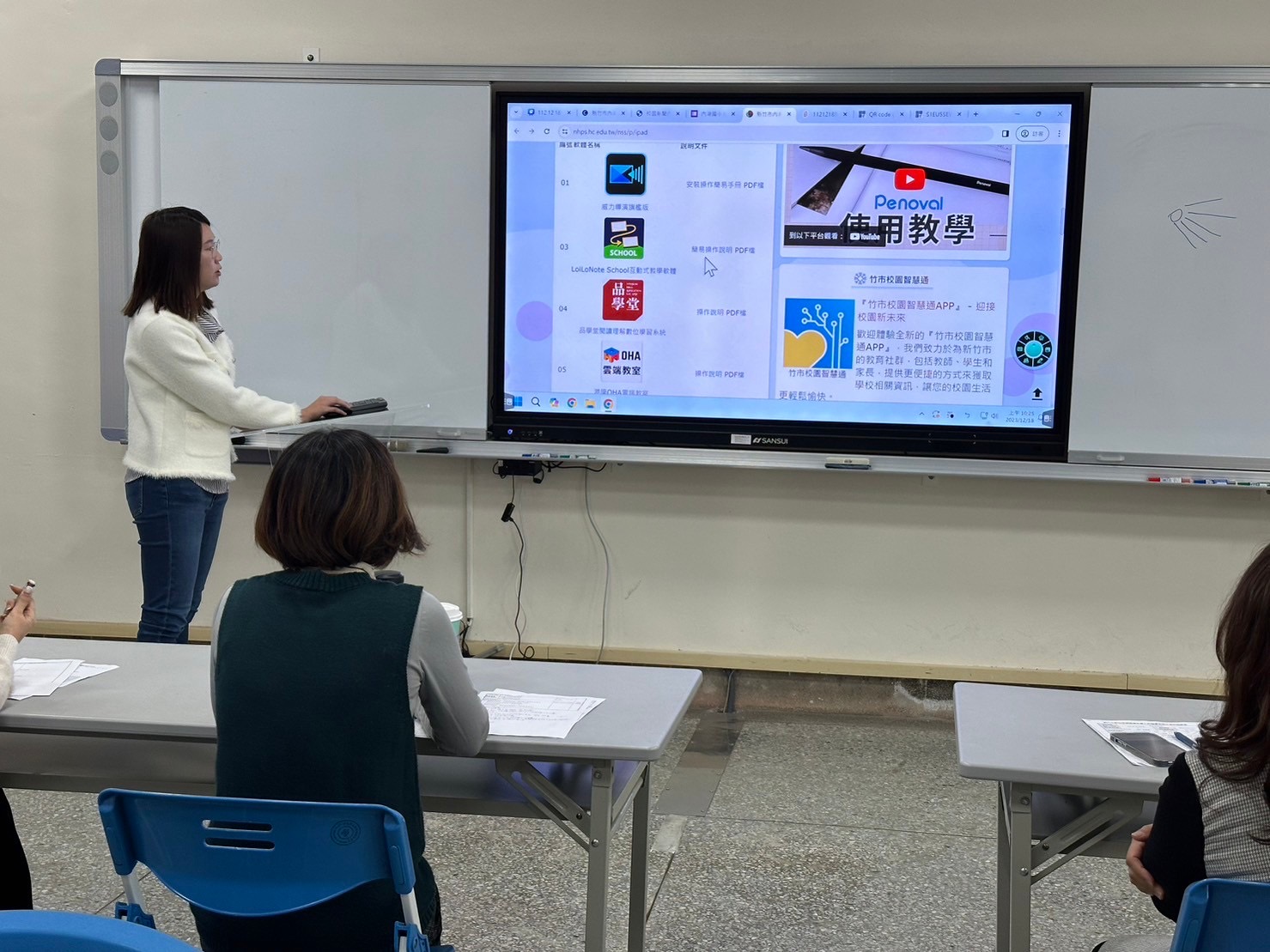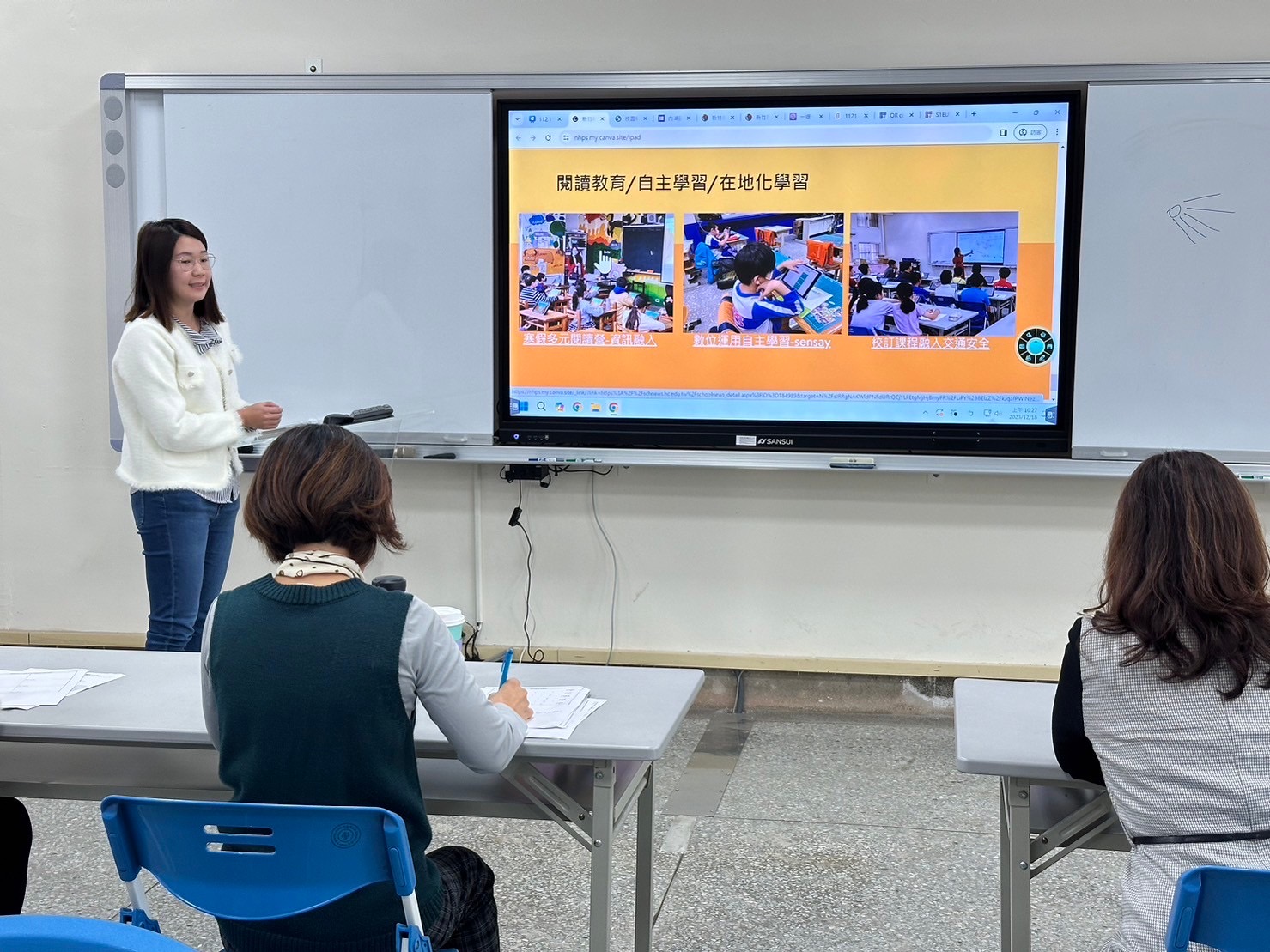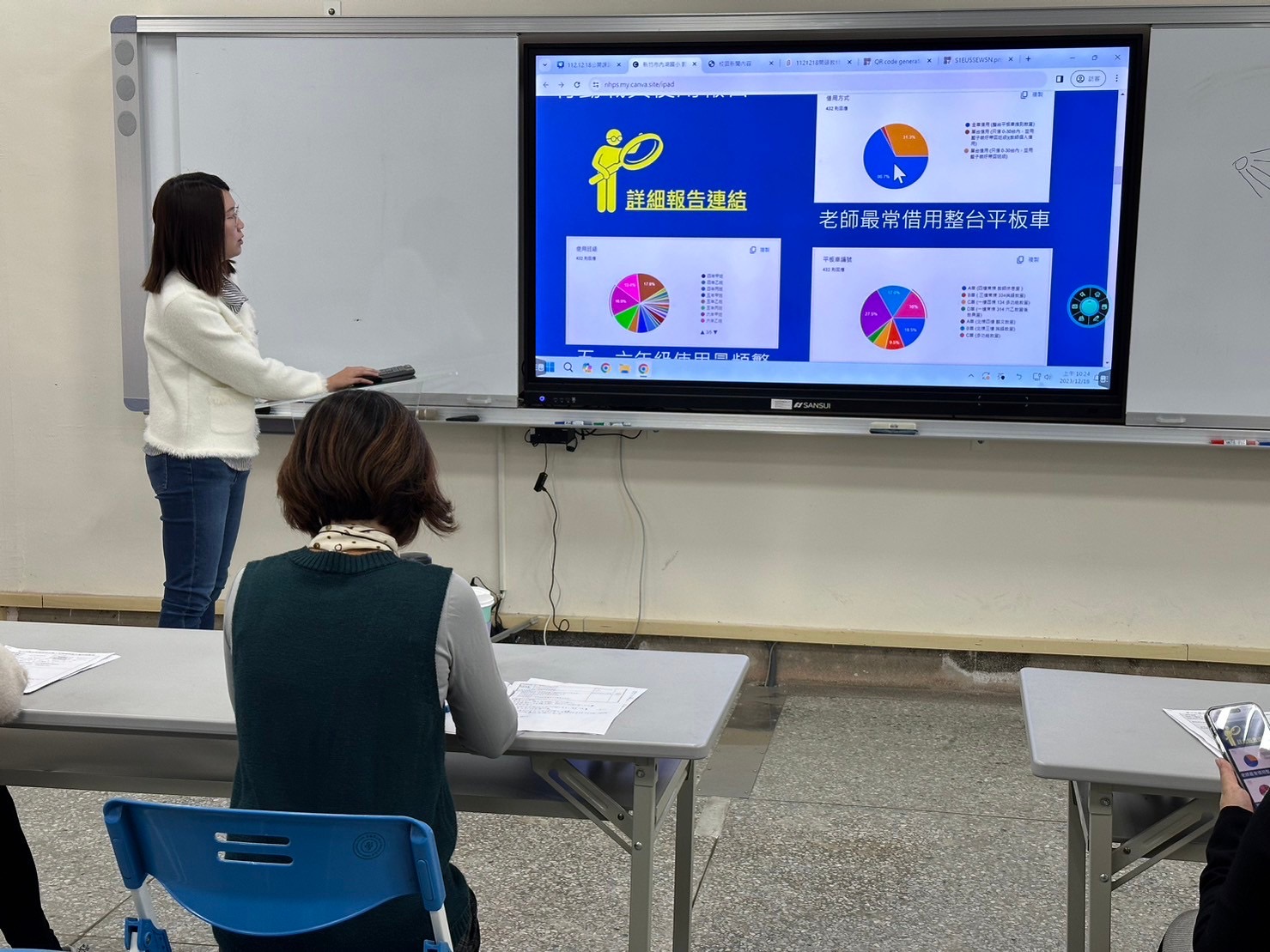 資訊組的欣晏老師進行了本校數位成果的分享,包括自然領域問答的推動、資訊科技與素養課程的實施、校本課程中平板的融入,以及在藝文領域進行平板電腦繪圖教學。這次分享不僅豐富了內湖國小的數位學習實踐經驗,也促進了校際間的交流與學習。