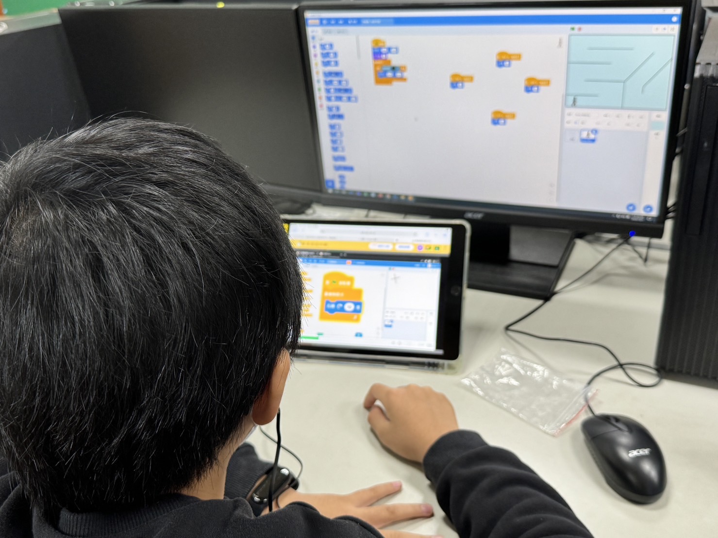 這次課程的主題是~創作一個有趣的迷宮!首先連結之前製作迷宮遊戲的經驗,再請學生發表意見:「要加入哪些因素可以讓迷宮更有趣呢?」學生掃描QR CODE進入Mentimeter介面,key入詞彙後整合為文字雲,可以發現大部分的學生想要加入「陷阱」增加迷宮的難度和趣味,於是使用平板登入因材網觀看自學影片。自學的好處是學生有自己的學習進度,有不懂的地方可以放慢速度看、倒回再重看,再加上兩兩一組互相支援,小組共學商量有伴、支援來得快!
