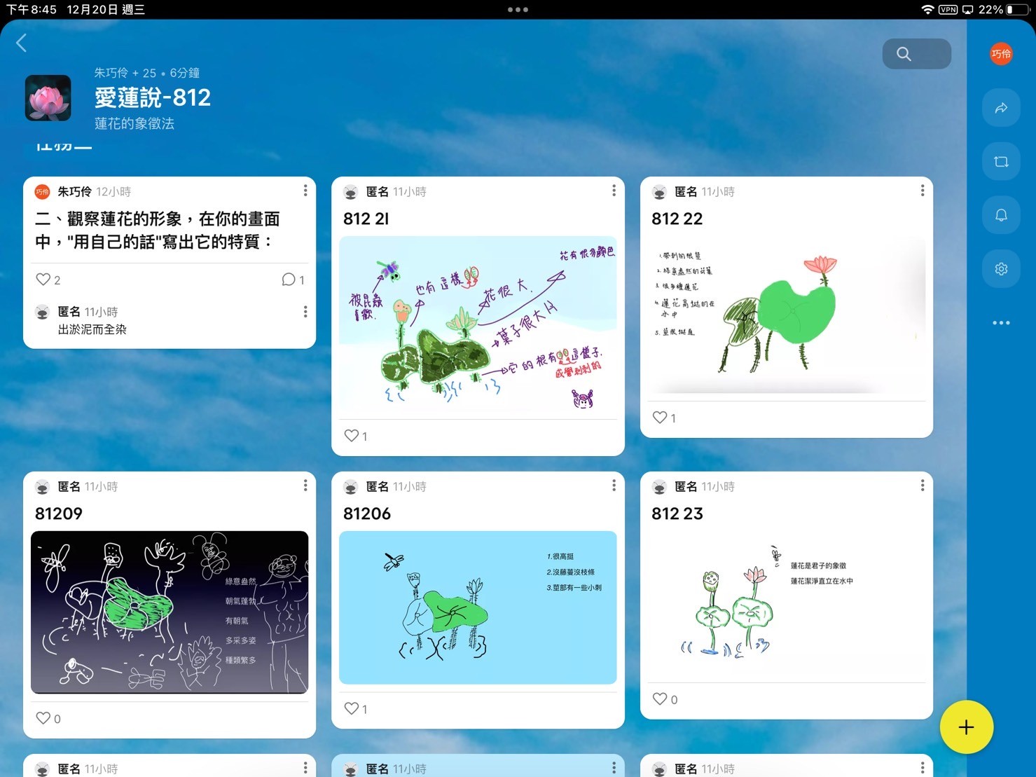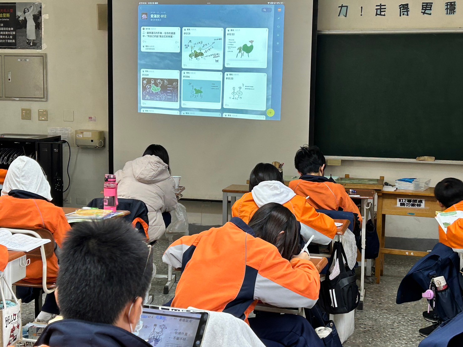 課文的重心是作者賦予蓮花君子的新意,這一節課,老師導學上先說明君子的意義與特質,再請學生思考:君子的特質與蓮花的特質之間,有什麼是相互關聯的地方,讓學生進行思考與整理。學生透過平版airdrop收到的學習單,在平版上書寫出作者所推崇的蓮的特質,並與君子特質做配對,最後上傳padlet進行學生共學,最後由老師點閱講評內容的合理性。