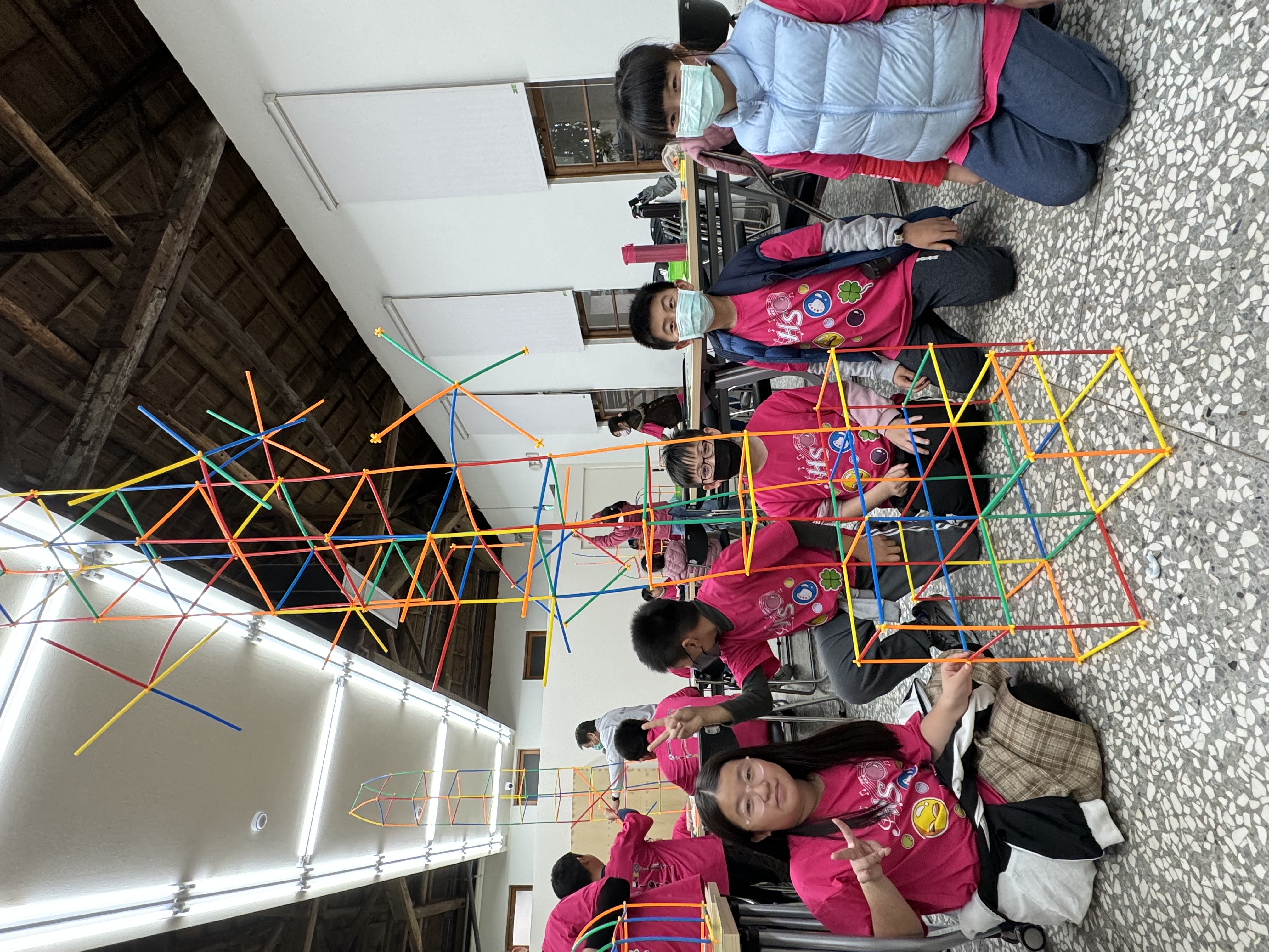 美學館中,抬頭便可見桁架結構的建築,它由短木梁發展成的堅固三角形連結組合而成,此力學穩固了屋舍,導覽老師以特製教具,讓孩子們合力建構自己心中最炫的建築本體,看著一座一座,繽紛絢麗的模型設計,說著一個個有趣的故事,組合著比身高還要巨大的「101大樓」,有趣又充滿知識性的操作,讓孩子們直呼不想下課。