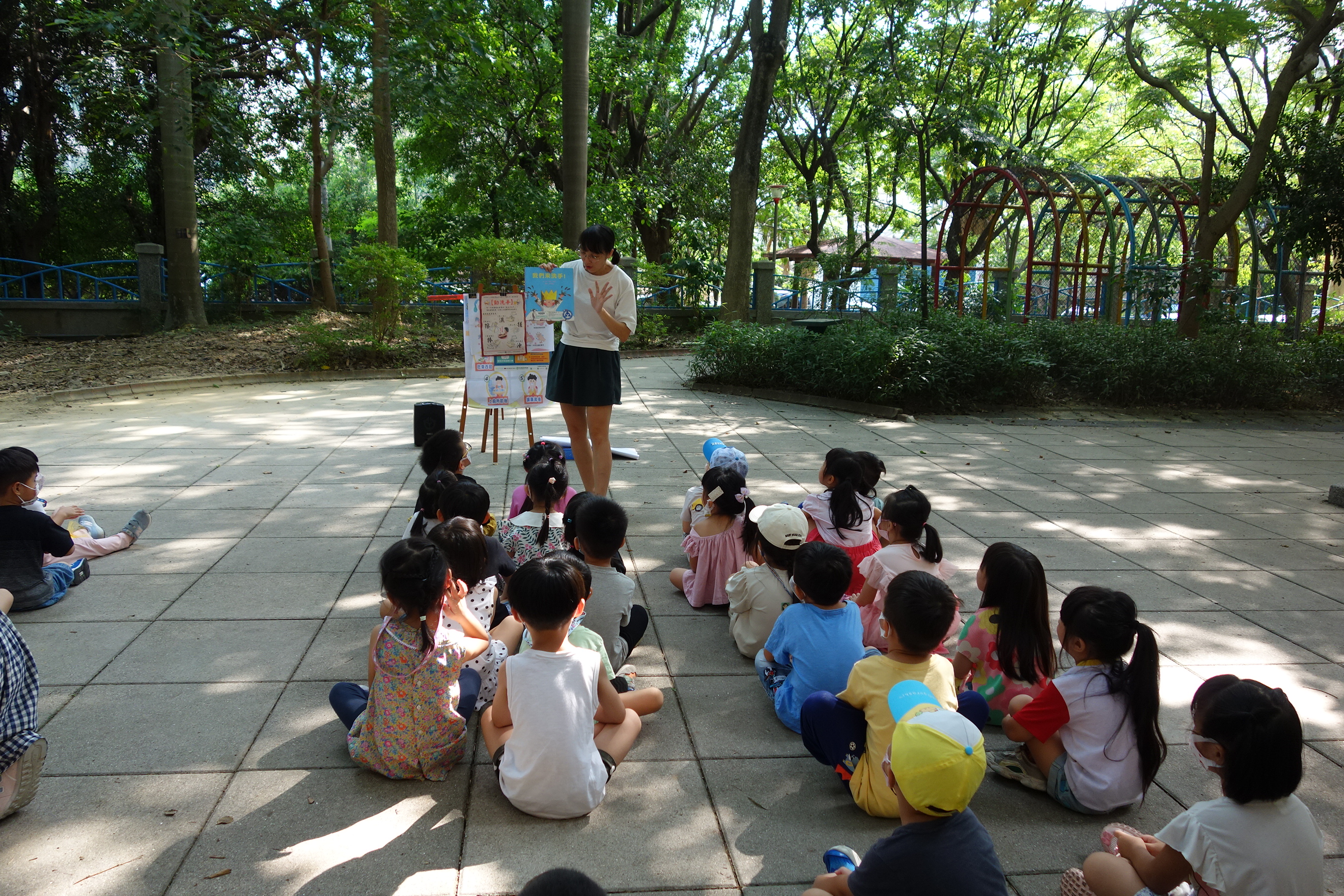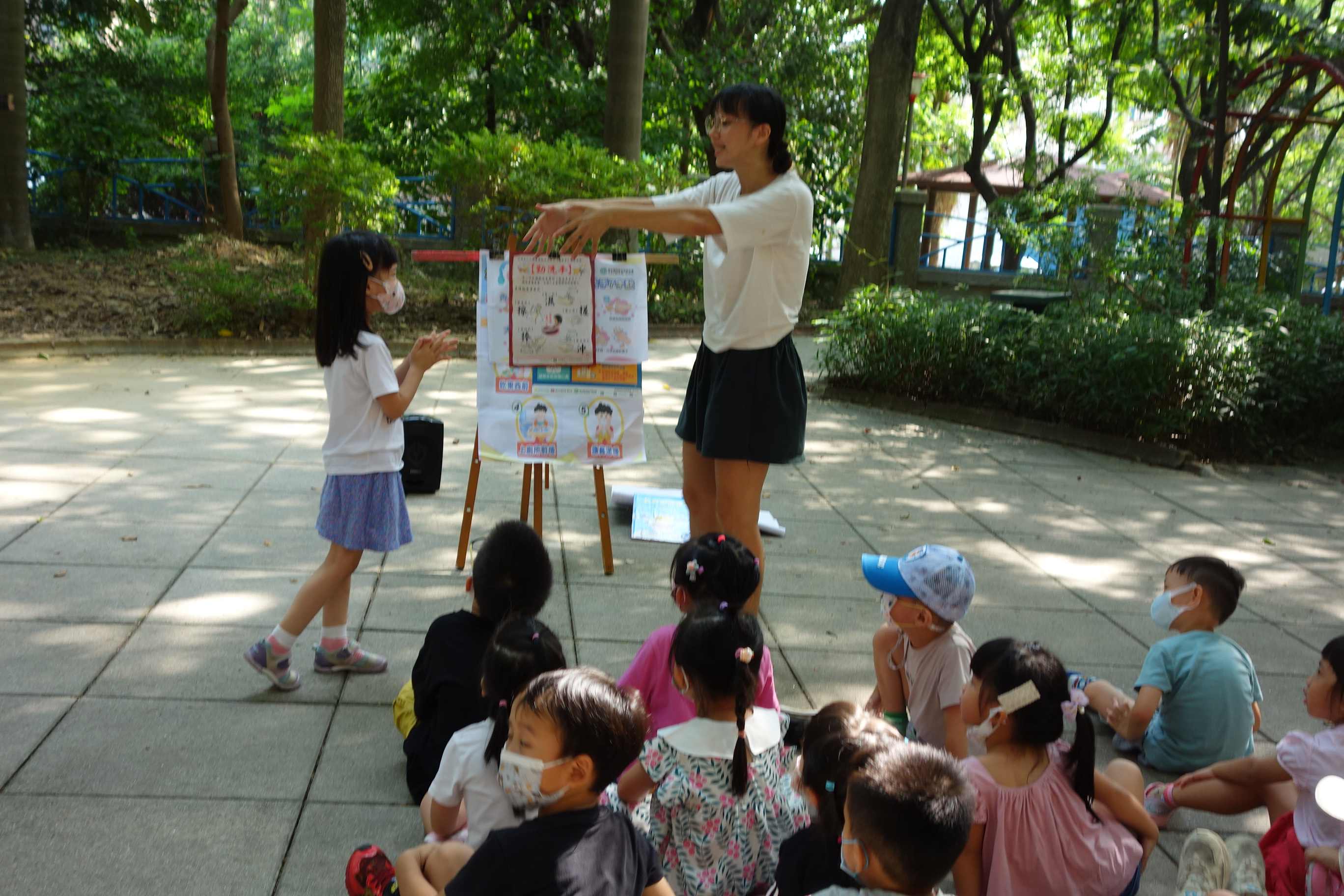 請幾位幼兒上台示範洗手步驟、台下的幼兒幫忙唸兒歌,活動結束回到各班,觀察孩子們洗手的正確方式給予引導及鼓勵,並提醒幼兒不要玩水,節約用水的觀念。
