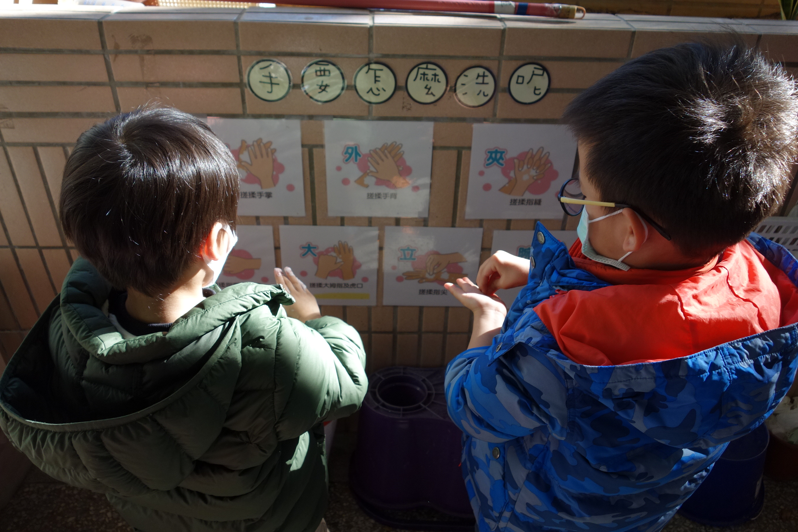 晨光活動宣導勤洗手的重要性,邊示範邊唸兒歌,幼兒在台下邊學兒歌邊練習洗手方法,並在做每個動作時將洗手七式帶入動作。