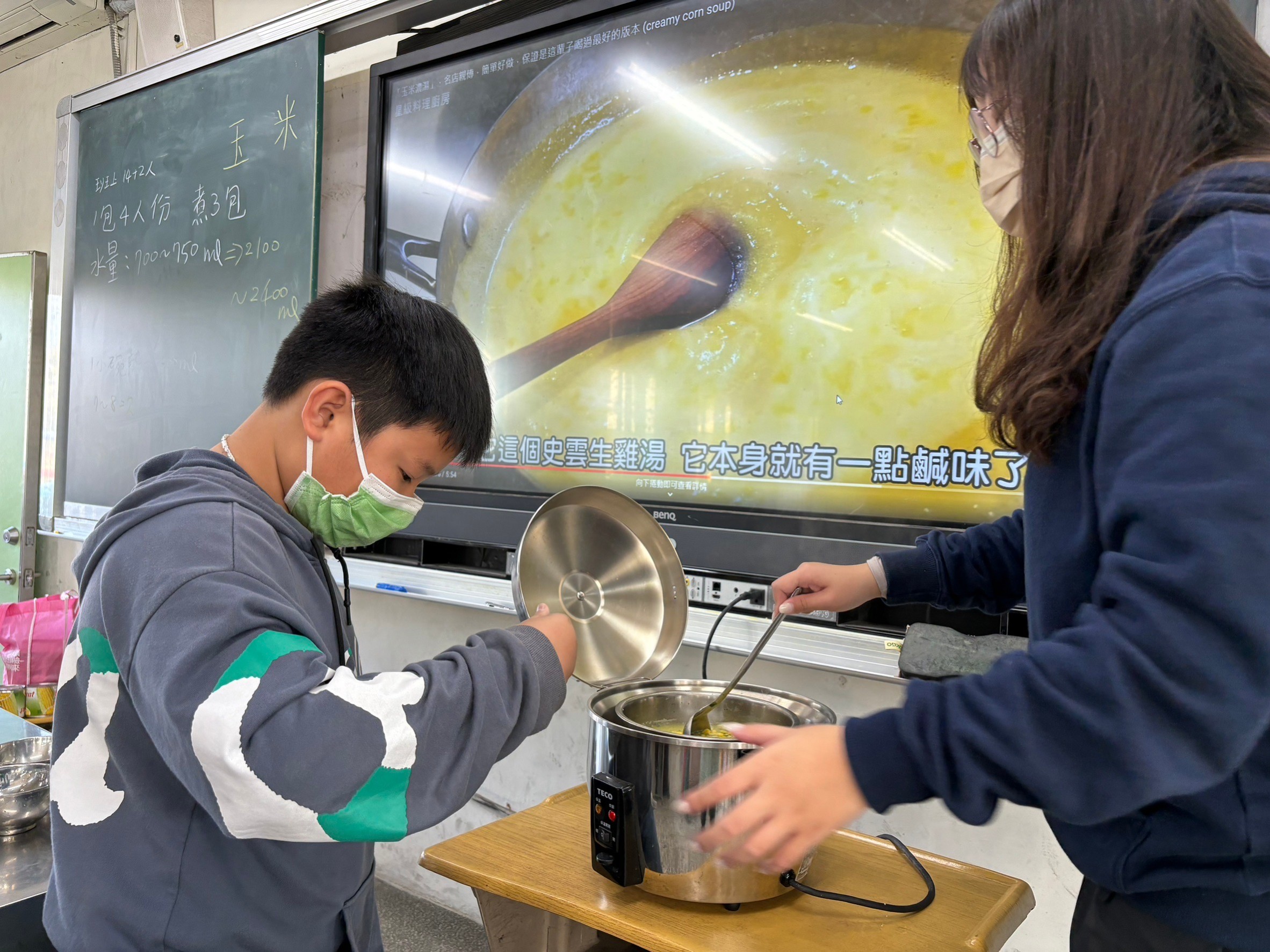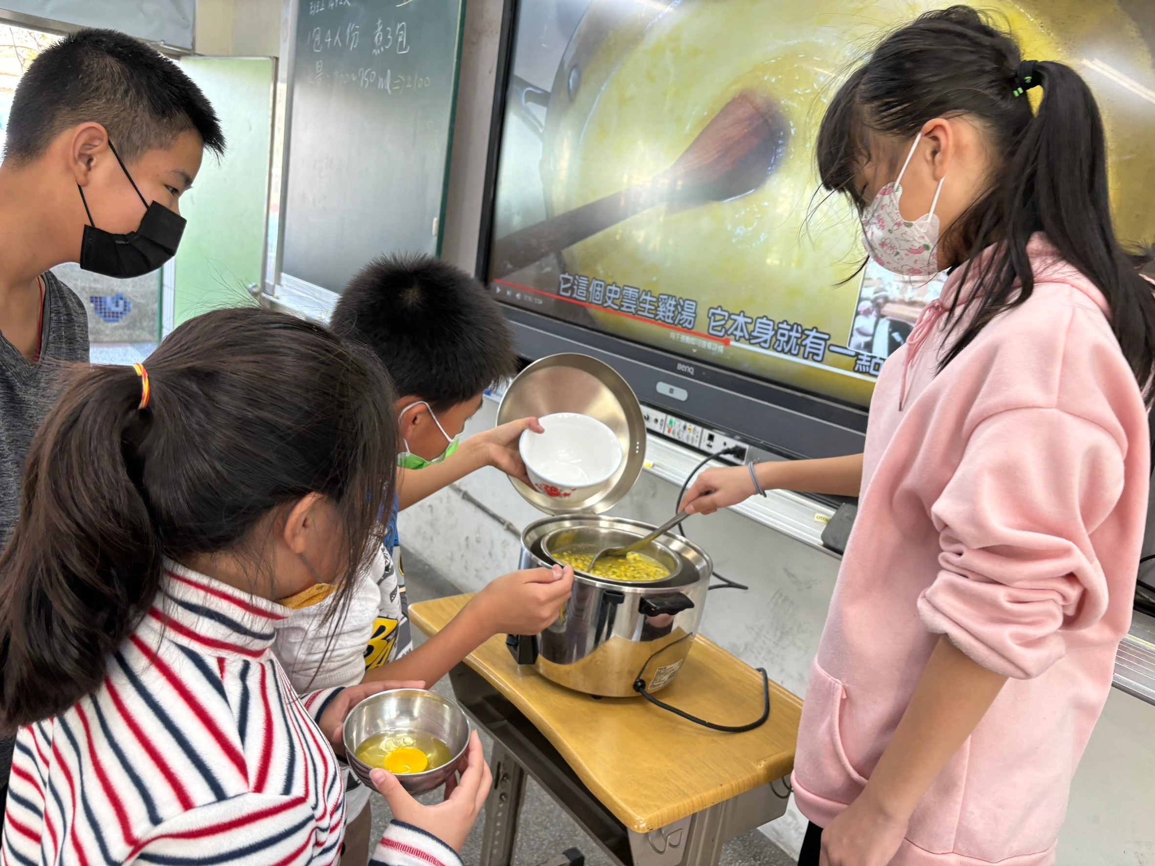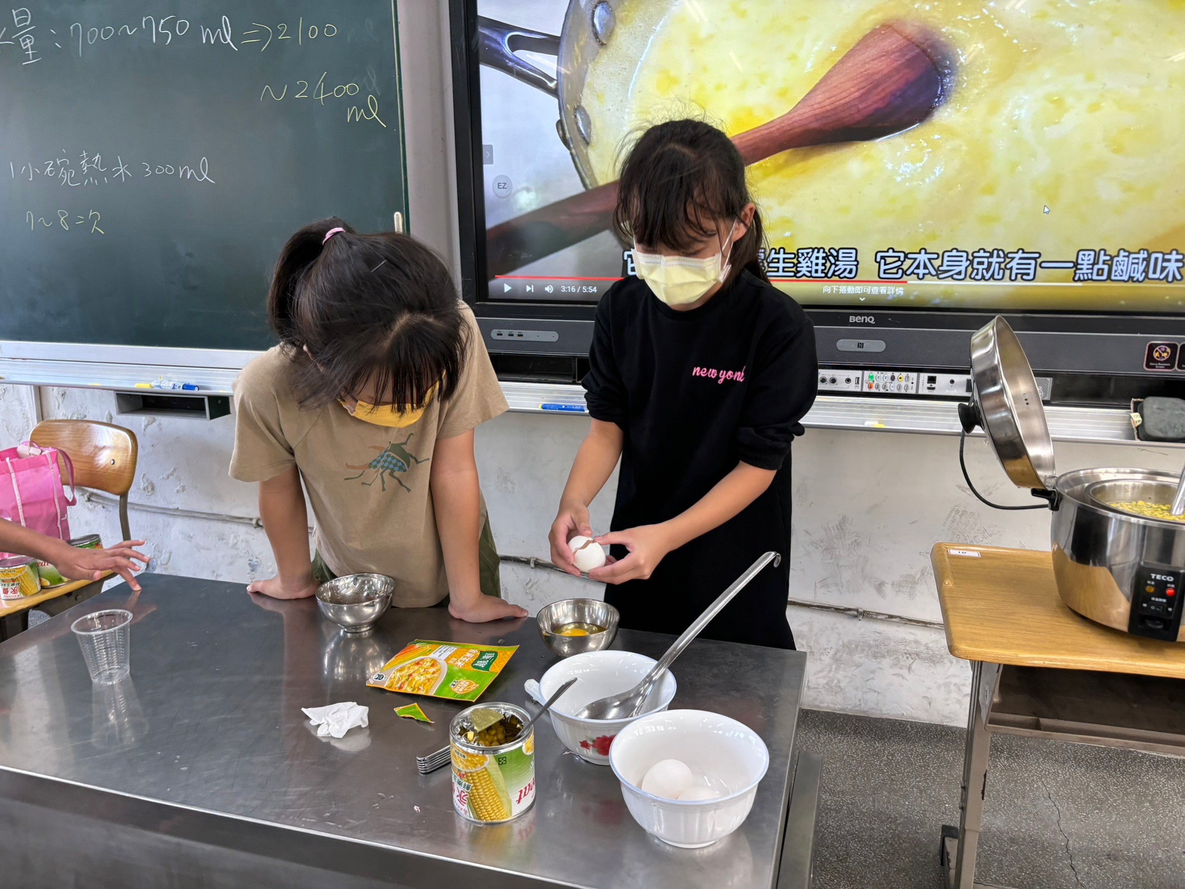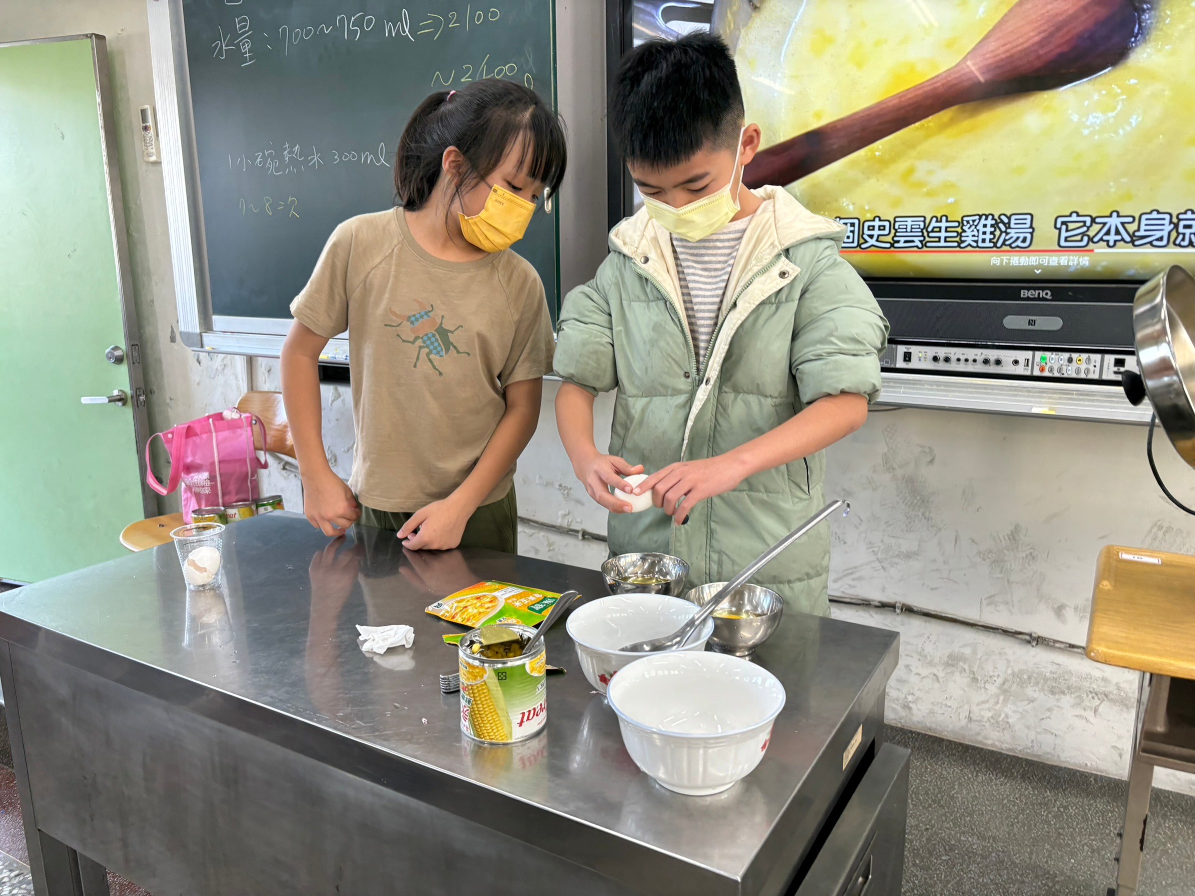 今天課後中高年級班的手作是玉米濃湯,孩子們特別感謝班上熱情家長提供豐富食材,再加上姿婷老師買了很多的雞蛋,每個人都可以為湯盡一份心力,從倒湯包、放入玉米粒、打雞蛋成蛋花到倒入鍋中…,每位孩子都參與到了。