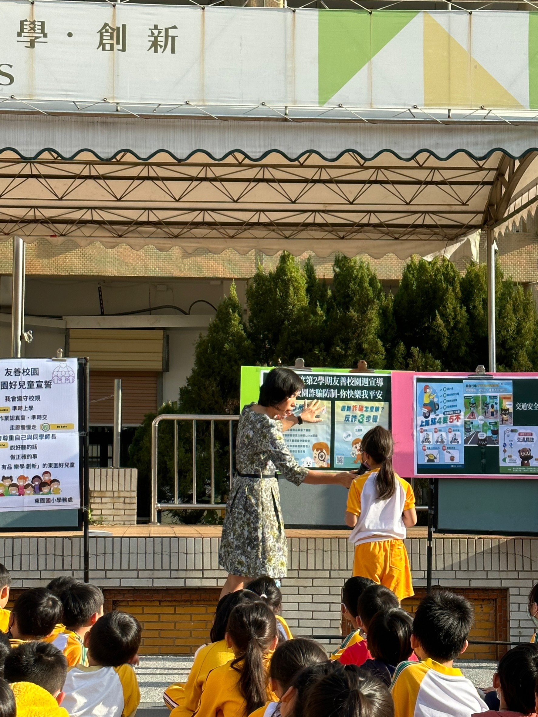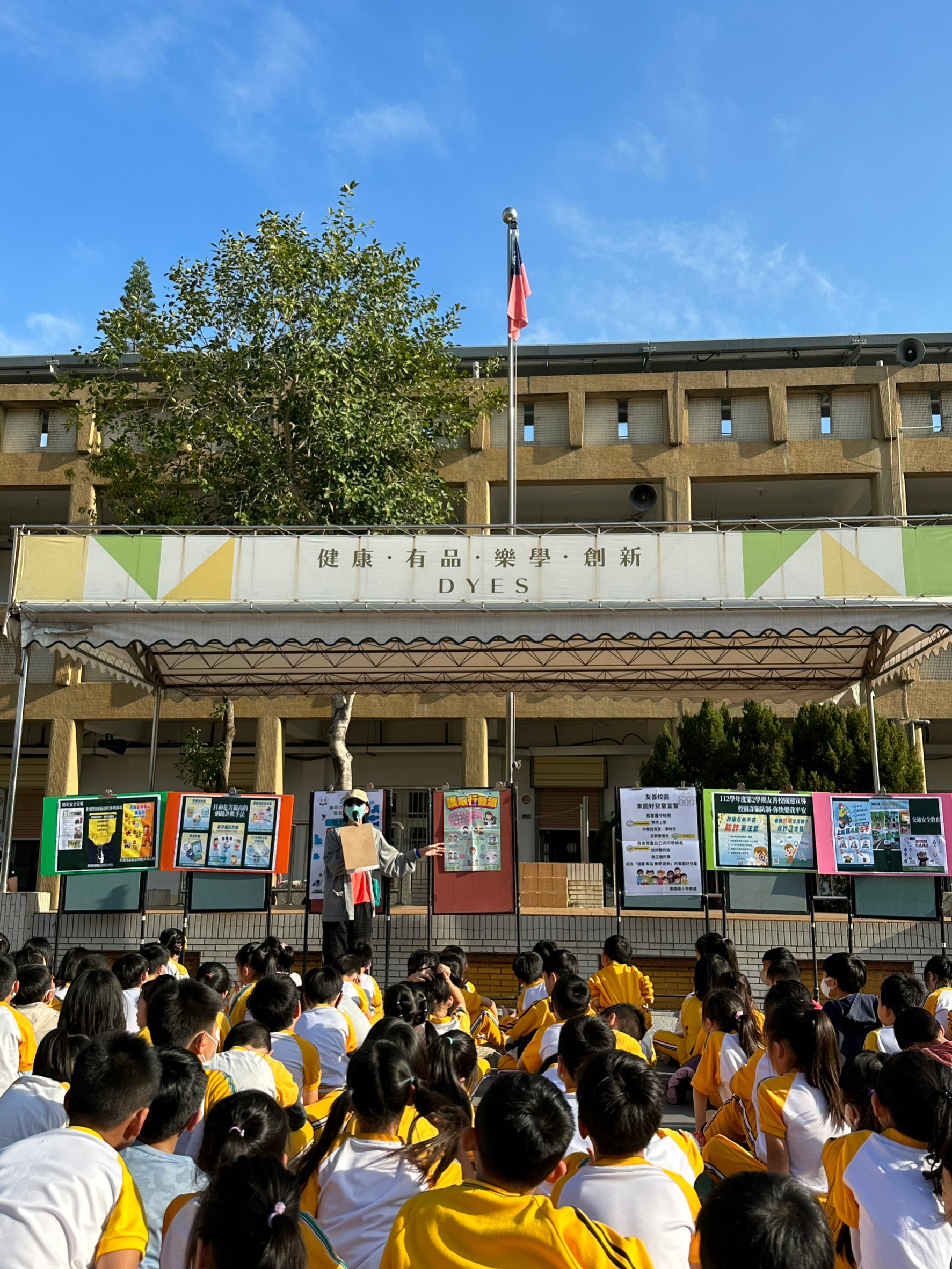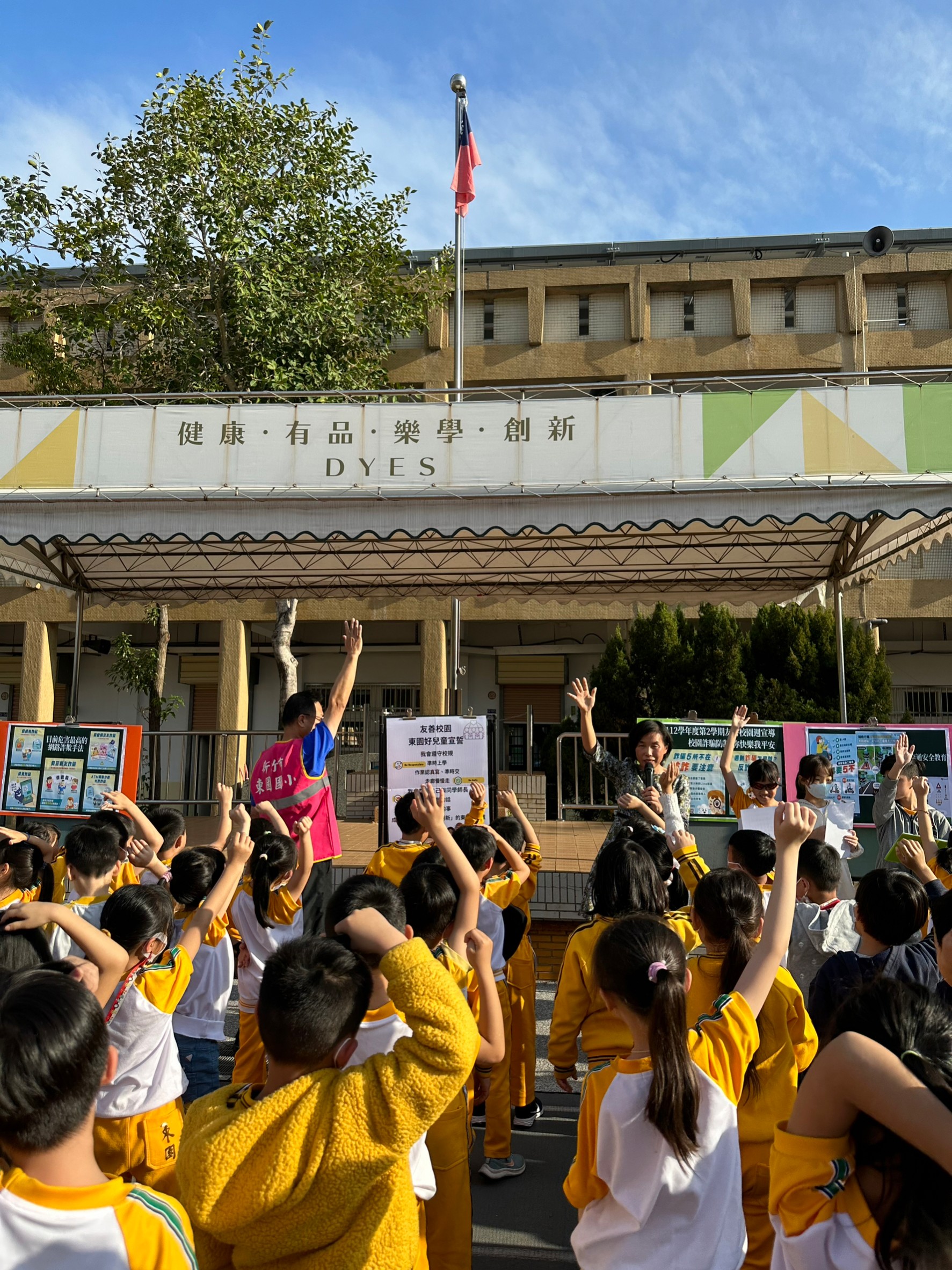 玉蓮校長於開學典禮提醒學童詐騙無所不在,平時要能關注及了解詐騙集團詐騙手法,若遇詐騙應保持冷靜與查證並撥打165防詐專線並帶領全校學童進行「東園好兒童宣誓」,勉勵全校小朋友成為「健康 有品 樂學 創新」的東園好兒童。玉蓮校長還特別邀請寒假赴馬來西亞參訪交流的羽球隊說說他們的觀察,分享交流經驗與心得。學務處仲明主任則進行校園安全、反毒及交通安全教育等議題宣導,提醒學童要能遵守校規,多說好話、尊重自己與他人、關懷與協助同學。環衛組長孟芳老師介紹護眼六招853240原則,全校師生動起來,一同守護健康。