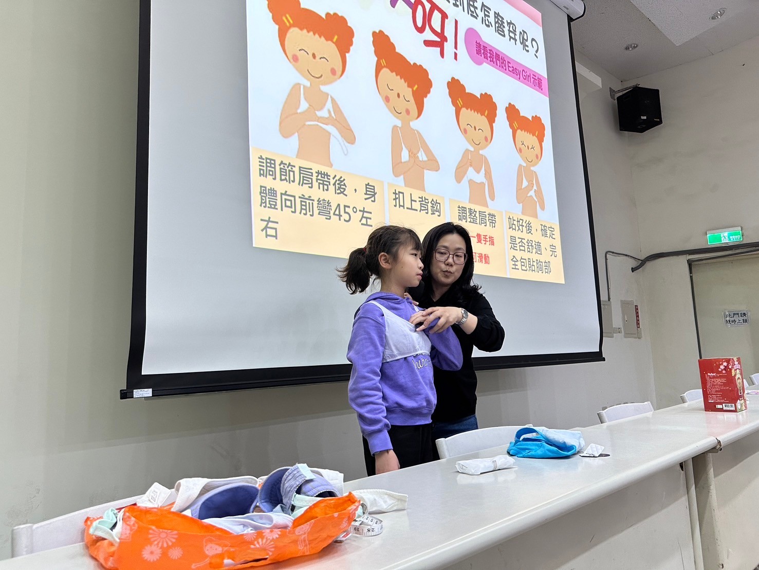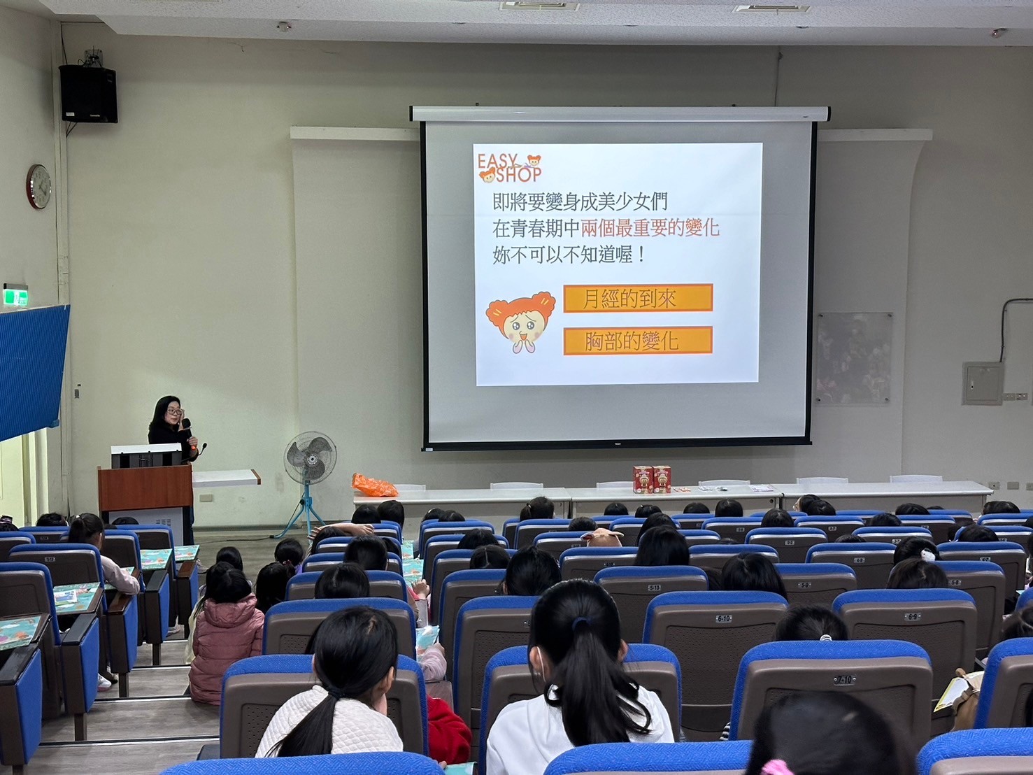 當學生們即將進入青春期,女生第二性徵開始有不一樣的變化,女生胸部發育、月經出現。為了讓學生對基將邁入青春期的自己有更清楚的認識,對自己身體生理變化不致於恐慌害怕,本學期學校邀請到台灣奧黛莉公司成長教育宣導專員-施懿真老師來跟四年級女生進行「生理衛生宣導講座」,讓小朋友們認識青春期第二性徵、乳房成長及生理期的正確處理方式。課程中,施老師講解內衣的選擇、清洗、晾曬、穿戴方式,並教導衛生棉正確使用及保存方法,深入淺出、生動活潑,上課同學驚聲連連,短短課程中專注傾聽,佳評不斷,同學們也從中學到很多關於自己身體的成長與對他人身體的尊重。
