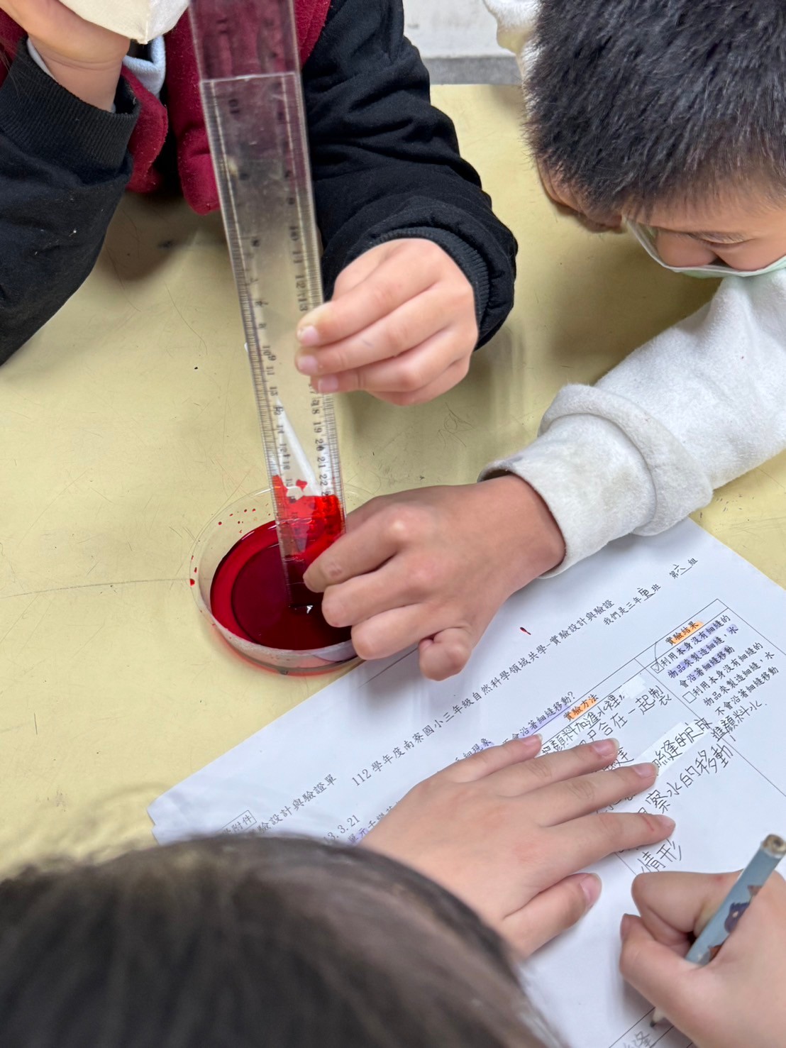 誰說三年級的孩子不能探究設計實驗?今天這場自然融入科技輔助自主學習的三年級自然課,就讓我們刮目相看,令人讚嘆不已。老師從生活經驗的弄溼衣服,與孩子探討為甚麼有些衣服會濕有些不會?讓孩子思考探索其中的奧秘,接著提出假設,試著思考如何用科學證據告訴大家他們的想法是正確的。學生在老師的引導下,透過小組討論分享寫下了實驗過程並找尋器材實驗。今天就用實驗告訴大家實驗結果,壓緊一點…事實上就是縫隙小一點,毛細現象就越明顯。