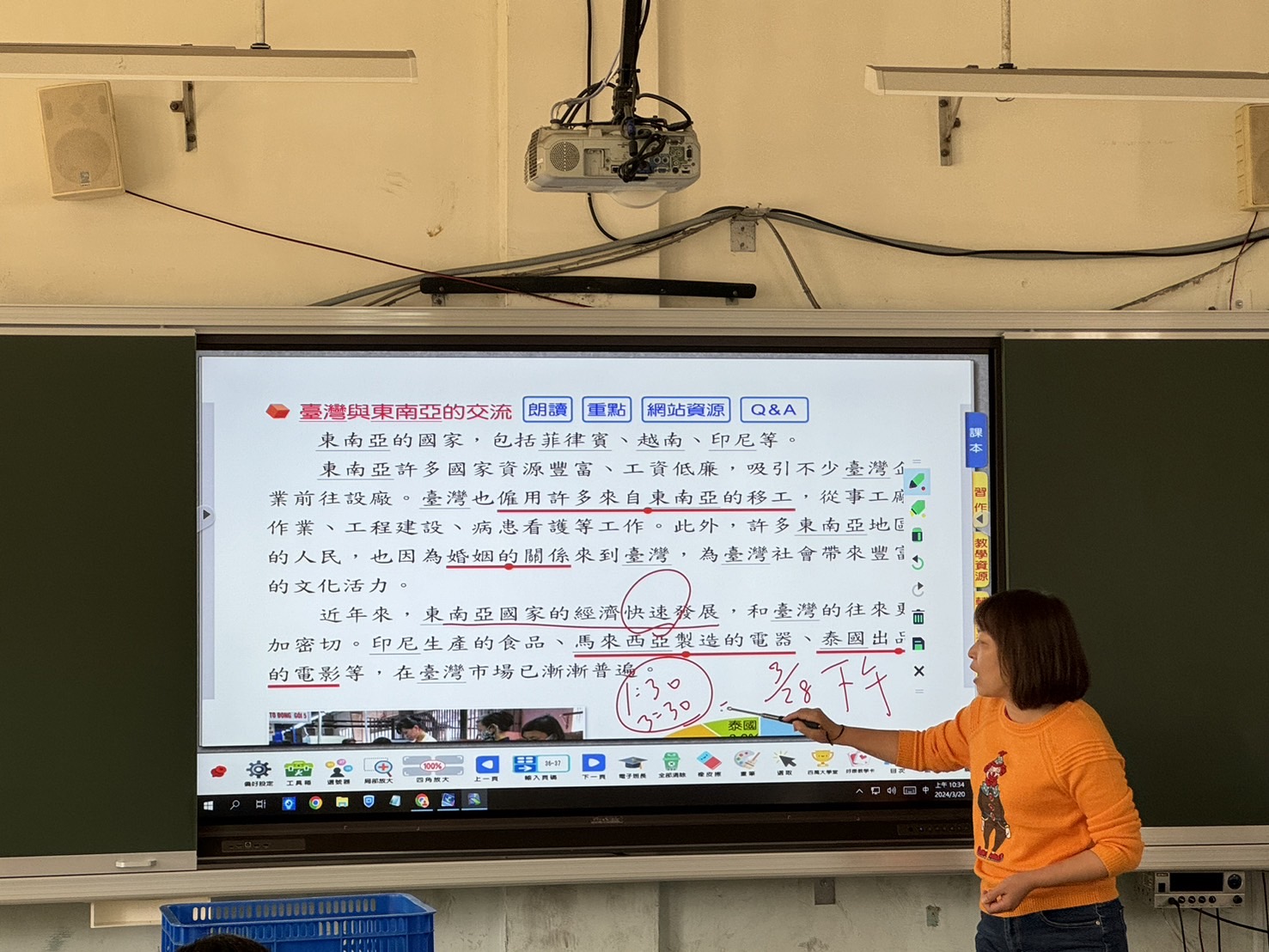 今年本校受市府補助了34台觸控電視及開闔式黑板,於3/17(日)施工人員安裝完成後,3/18(一)學生們一早進教室看見黑板變得不太一樣,還有一台大型電視。