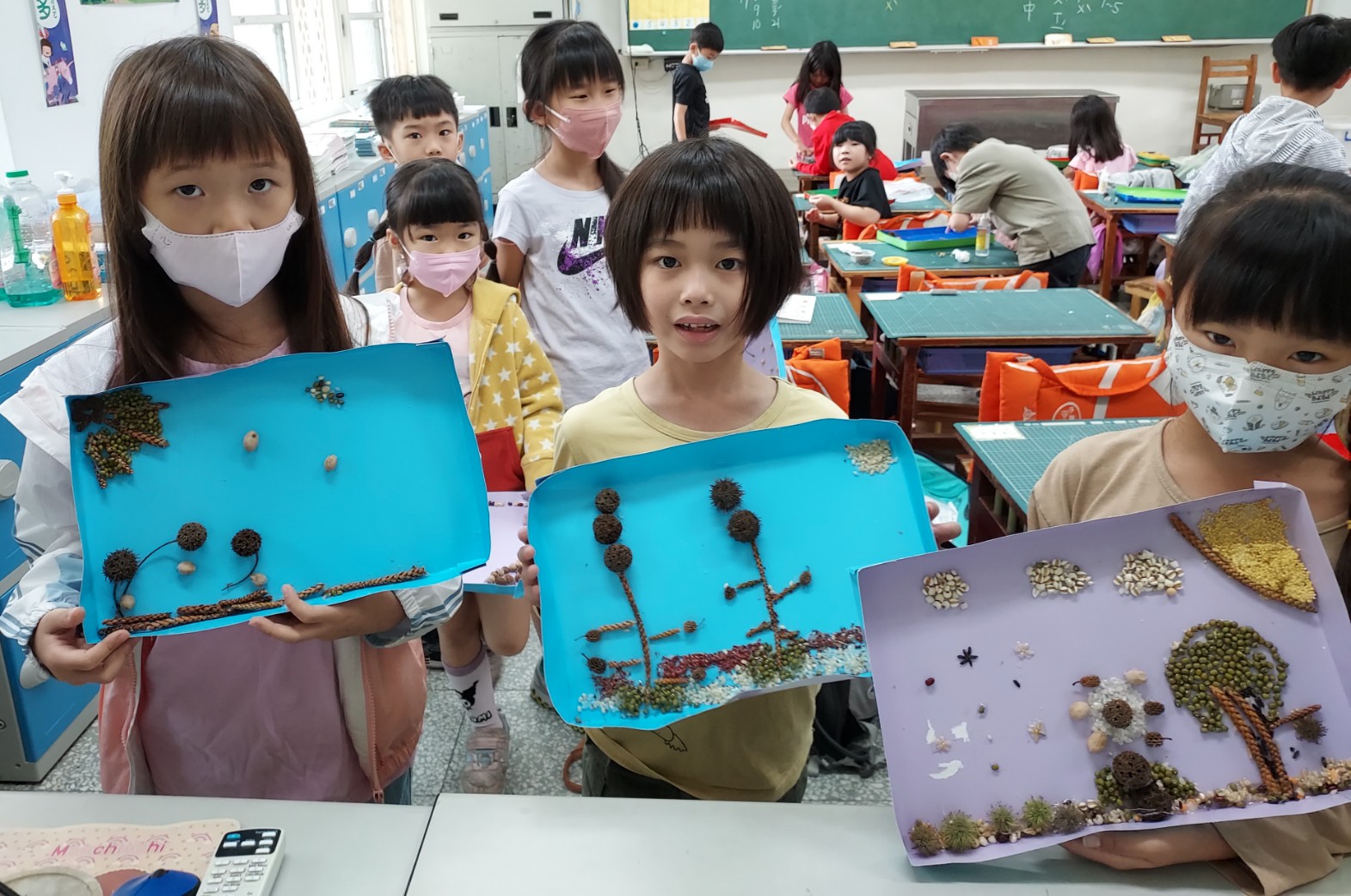 配合一年級的校本課程「園園不絕」藝術軸的「種子魔術師」,小朋友利用下課時間,低著頭好似尋寶般,不亦樂乎地撿拾地上的種子。把校園裡能找到的各式各樣的種子,如:楓香、木麻黃、蒲葵、水黃皮等蒐集起來,準備做一幅種子拼貼畫。