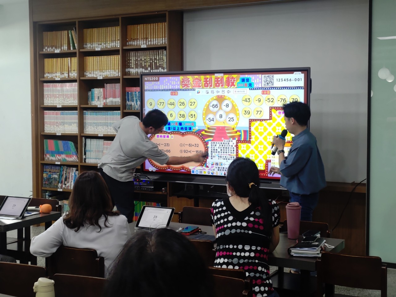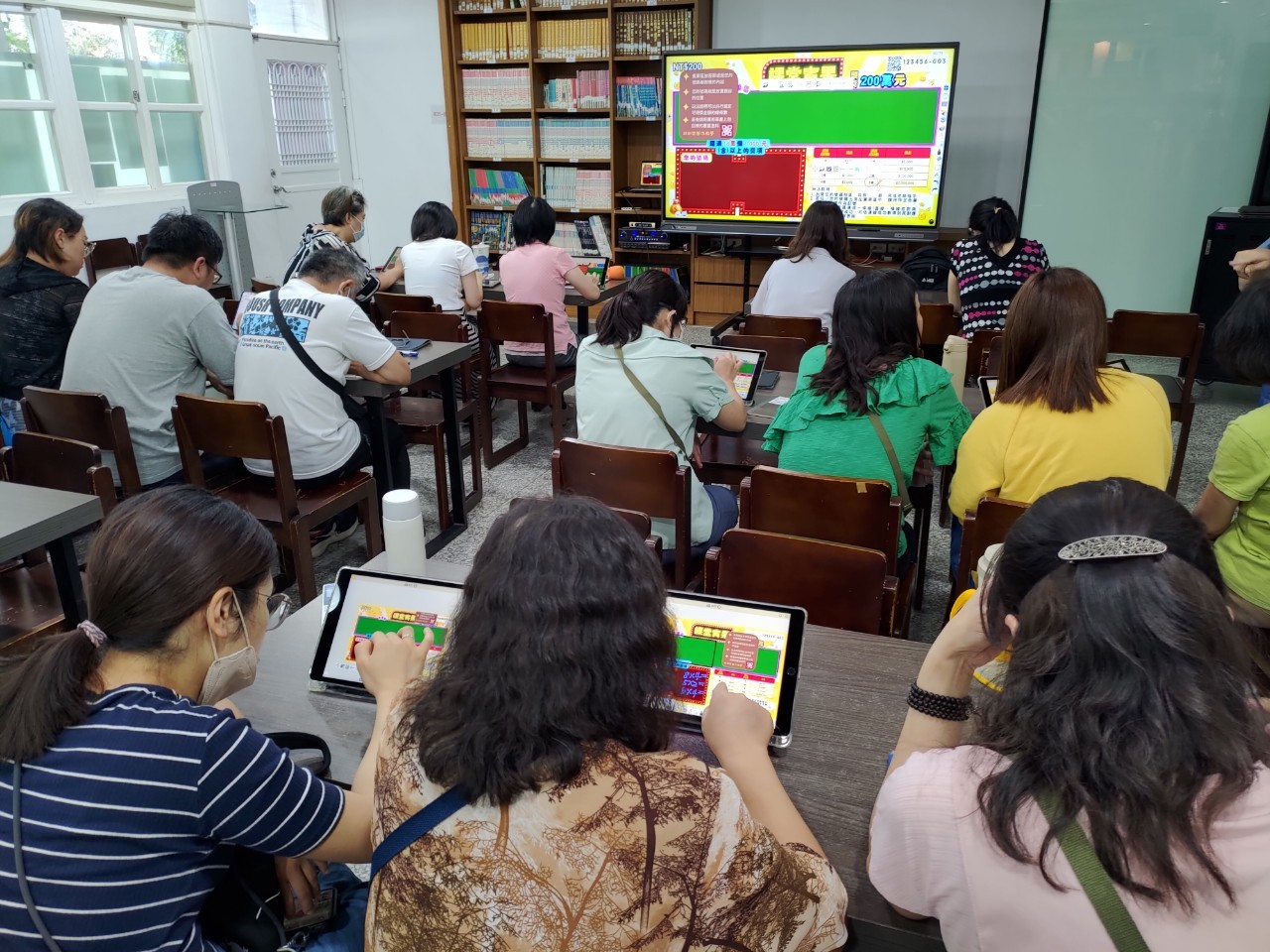 113.5.10一群數位學習跨校社群(南寮群)的教師們聚在南寮國小的圖書館一起學習如何運用myViewboard進行數位互動課堂。