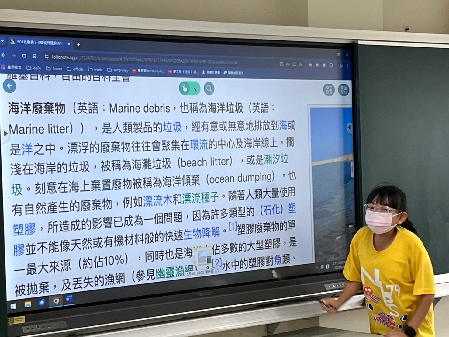 六年級社會領域期末課程重點談到永續經營地球村,進行完教學單元後,讓孩子利用平板製作環境問題的相關報告,提交至LoiLoNote的作業區,再進行全班共學的分享,達到教學相長與妥善應用數位科技的雙重目標,一舉多得。