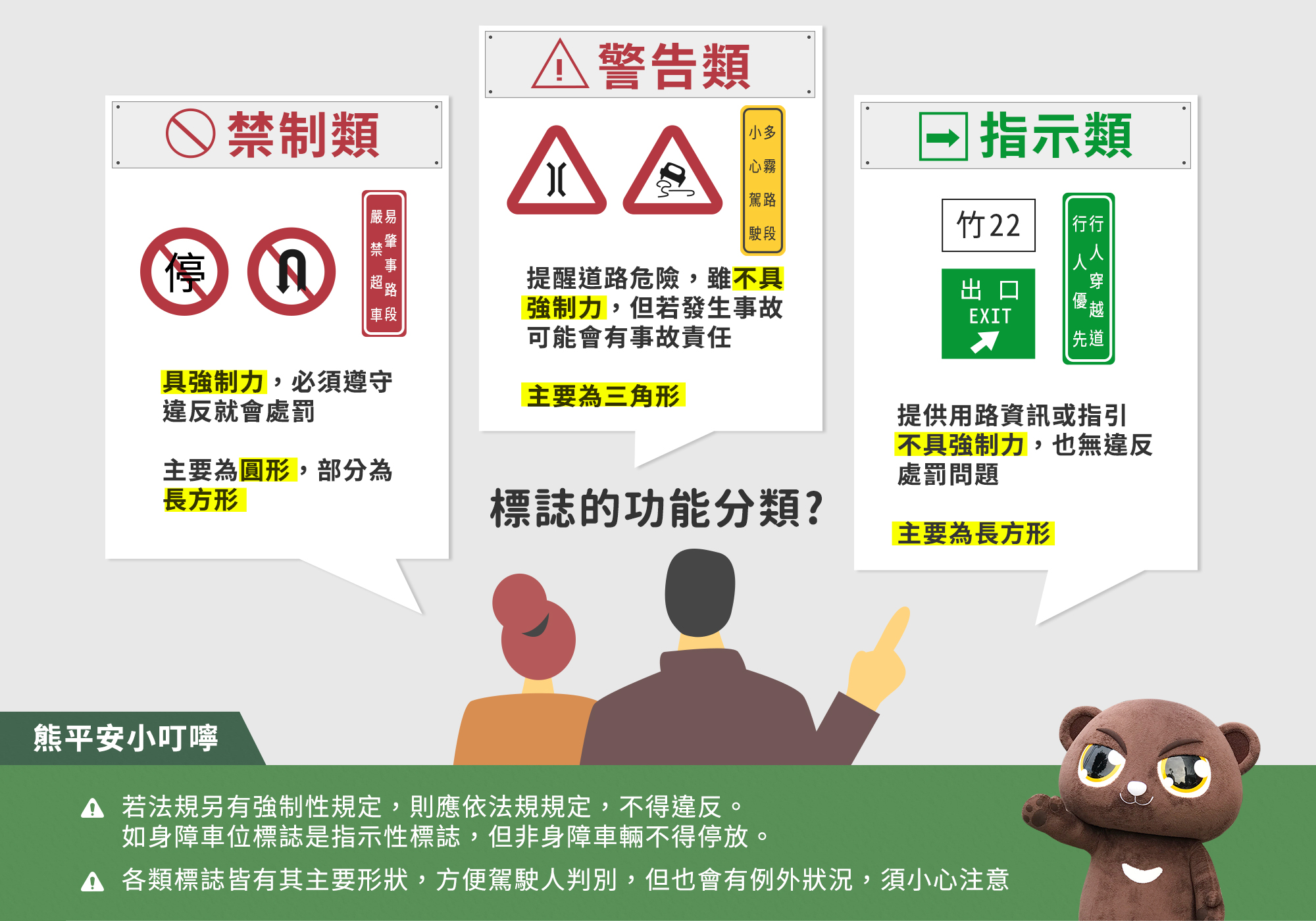 判斷標誌分為兩步驟:看到交通號誌時,先判斷號誌性質,再確定內容,採取正確的行為。而交通標誌有三種基本分類: