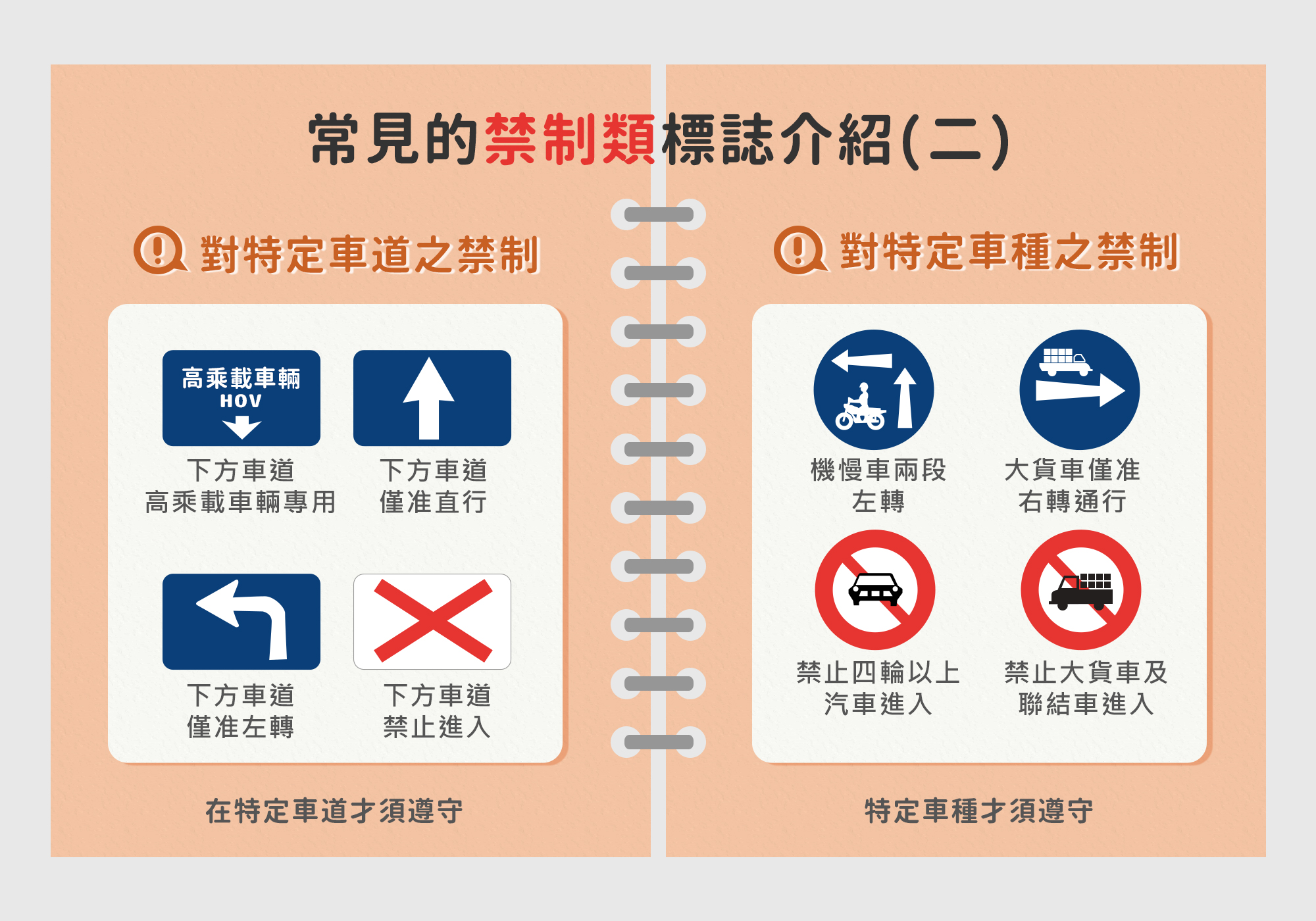 3.禁制類-為紅色圓形或藍色長方形,有強制力,用於禁止危險行為。分為對道路的限制、對一般車道的限制以及對特定車種的限制。