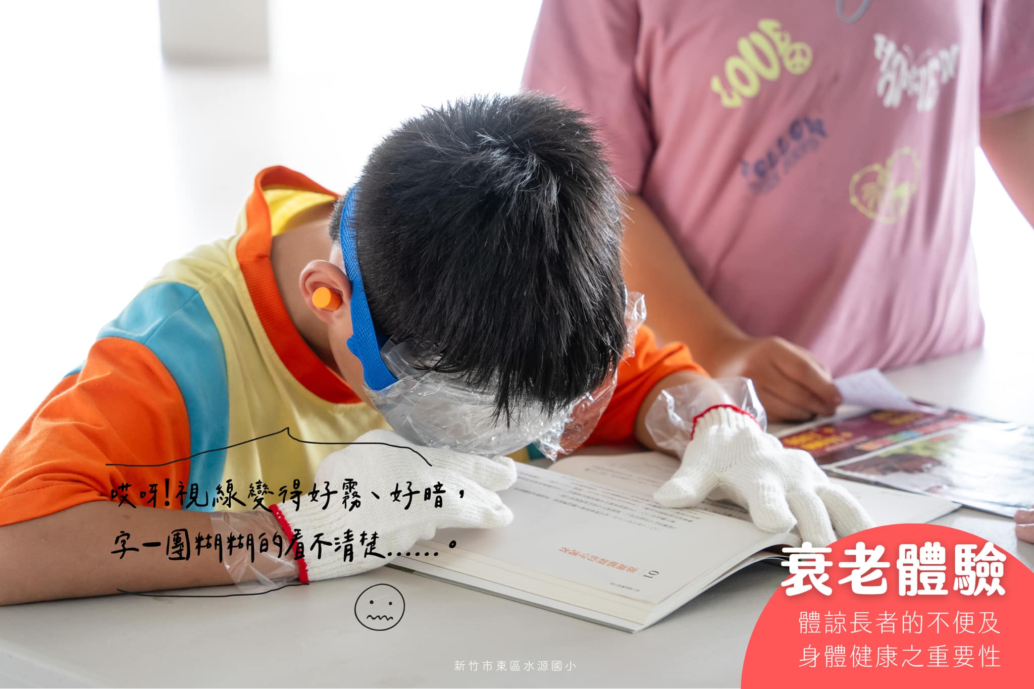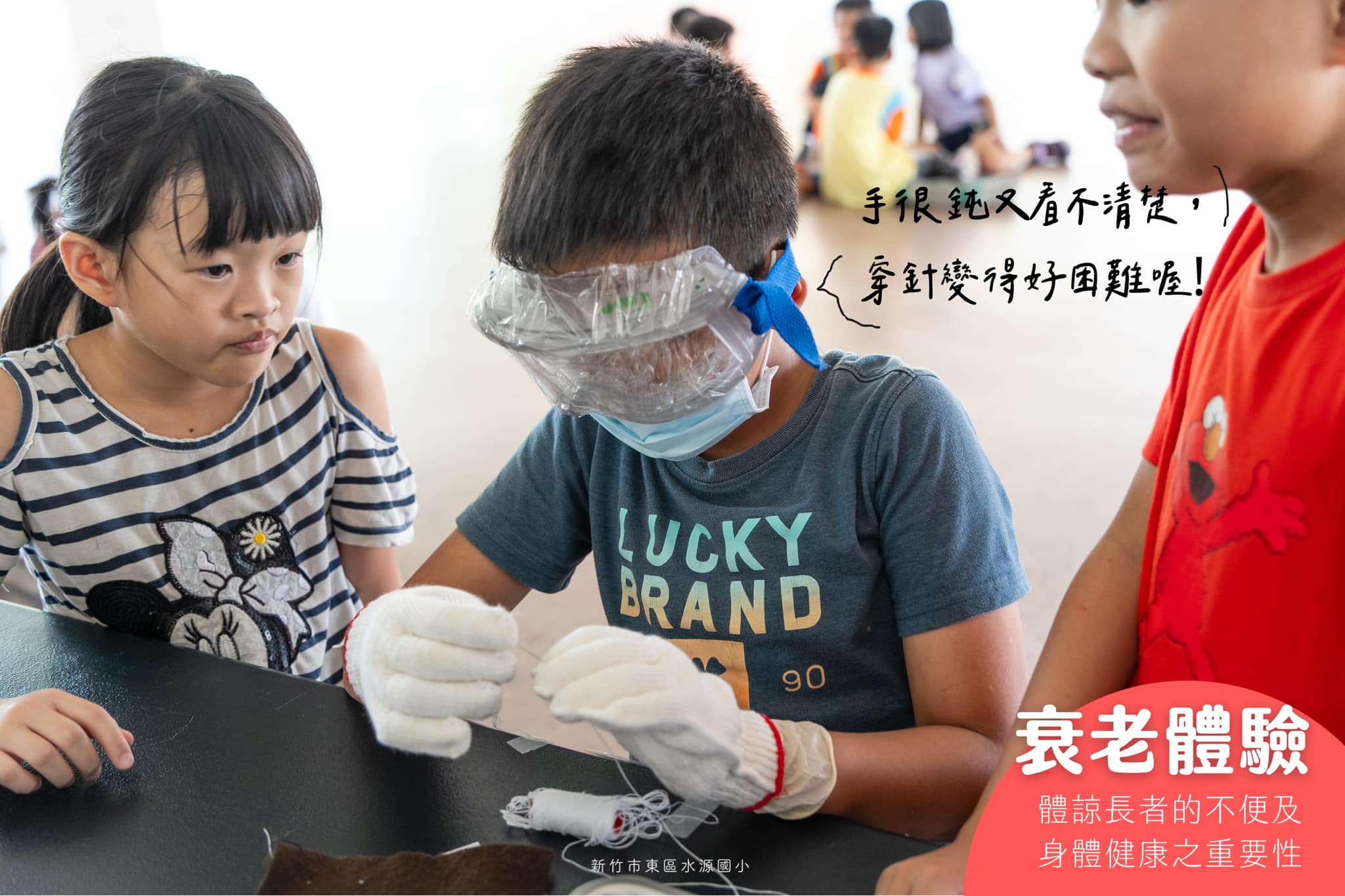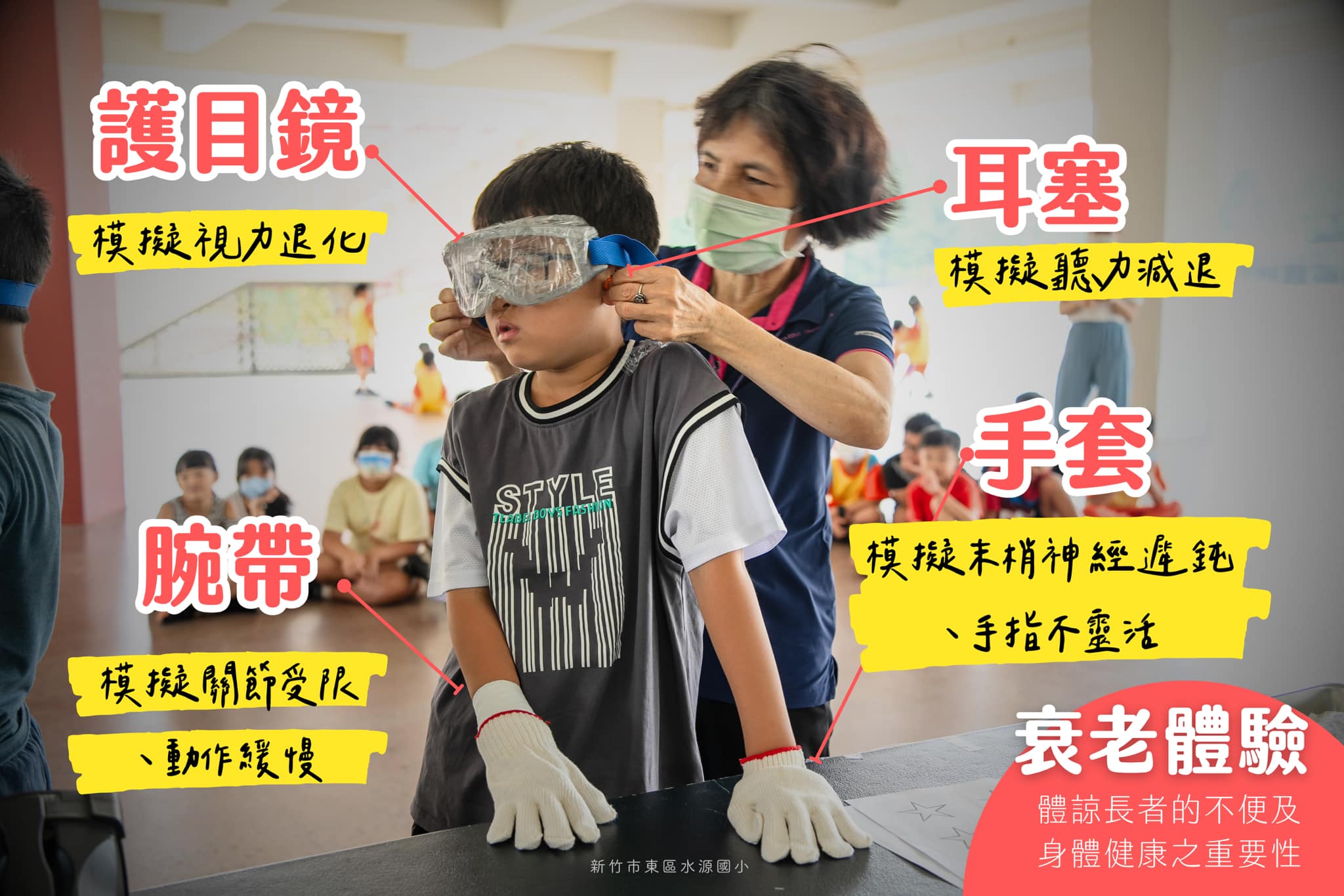 水源國小與東區衛生所合作,舉辦一場結合【健康促進】 及【輔導】 議題的「衰老體驗」活動,讓四年級孩子體驗老化的不便,並感受身體健康的重要性。