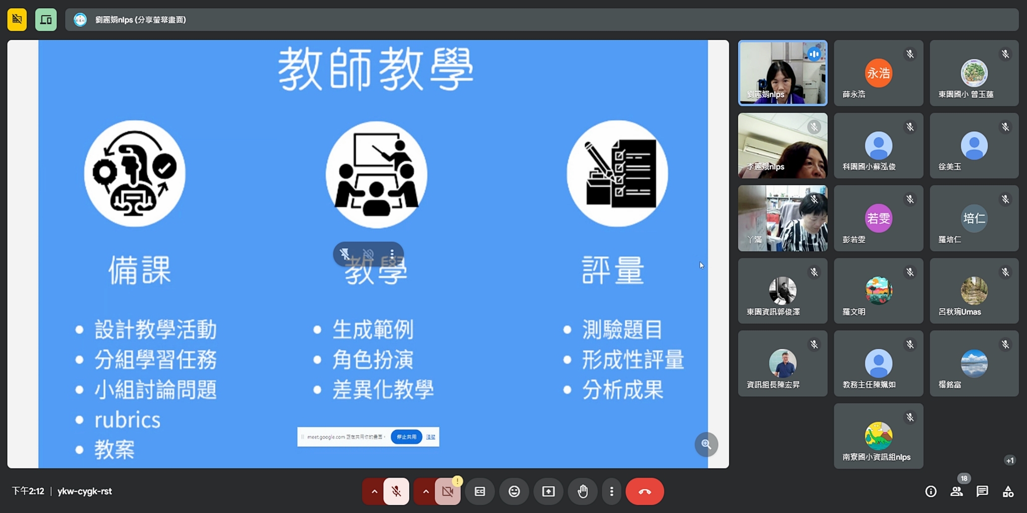 113.10.08新竹市「推動中小學數位學習精進方案」跨校社群(南寮國小群)之專案研討,由南寮國小麗娟主任分享,從數位學習教師角色之課程備課、課堂教學、評量設計,再到學生的不同層次的學習策略,包含設定目標、選擇策略、監控評估和調整修正,說明老師和學生在教與學之間的任務。此外,因材網內如蓉不斷更新提升,尤其加入了生成式AI-e度,可做為學生學習的夥伴或助教,透過不斷地提問,形成「學習鷹架」,引導學生學習,進而達成學習目標。