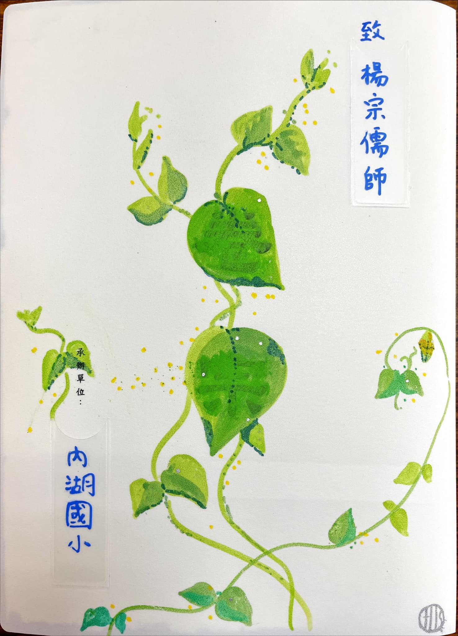感謝總務雯媛主任、六甲班導佳瑜老師一起帶領孩子以文以畫,表達感謝,感謝楊老師活化校園,為內湖親師生營造美好的蝴蝶家園。