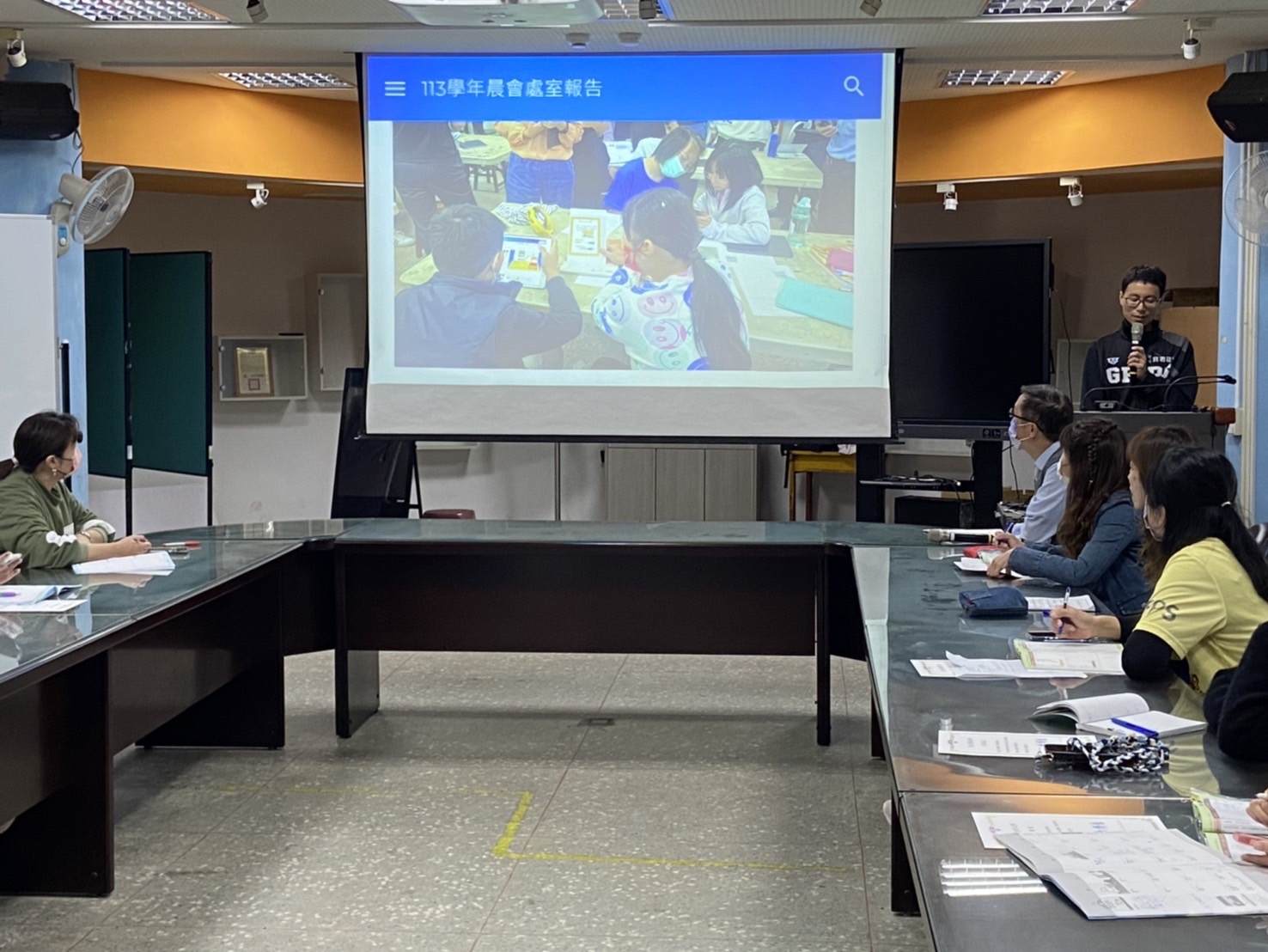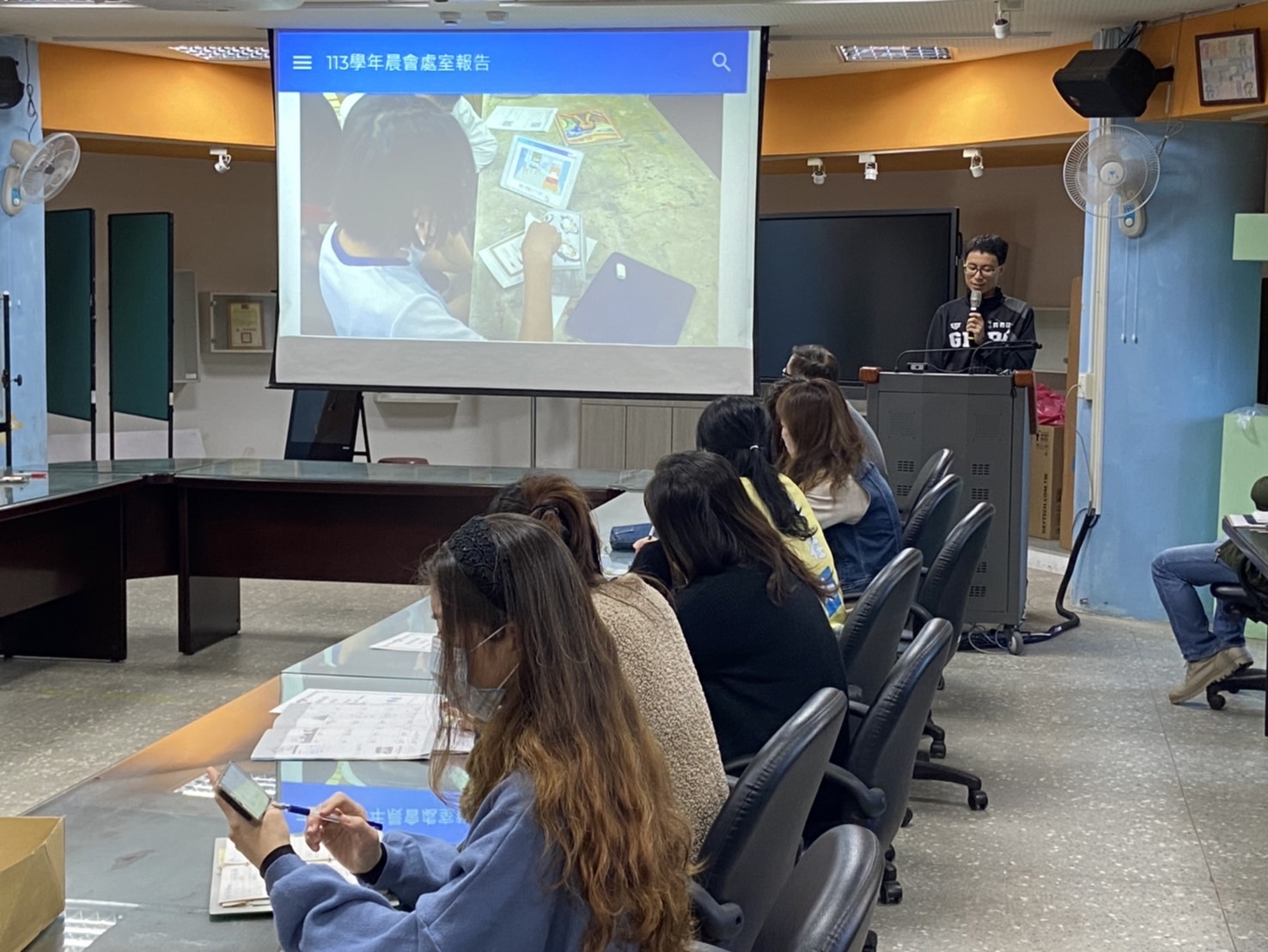 高峰校園日誌:至帆老師在今日教師晨會上向夥伴們分享日前到大湖國小觀課的心得,資訊科技與合作共創、資訊科技與溝通表達是這一次觀課的主軸,目的是給小朋友有基本的操作能力、拍照與文字輸入,團隊同仁互相分享一起進步,有好的湯底加上團隊同仁不斷輸入營養的養料,讓所有高峰囡仔都可以有充分的養分快樂學習、茁壯成長!