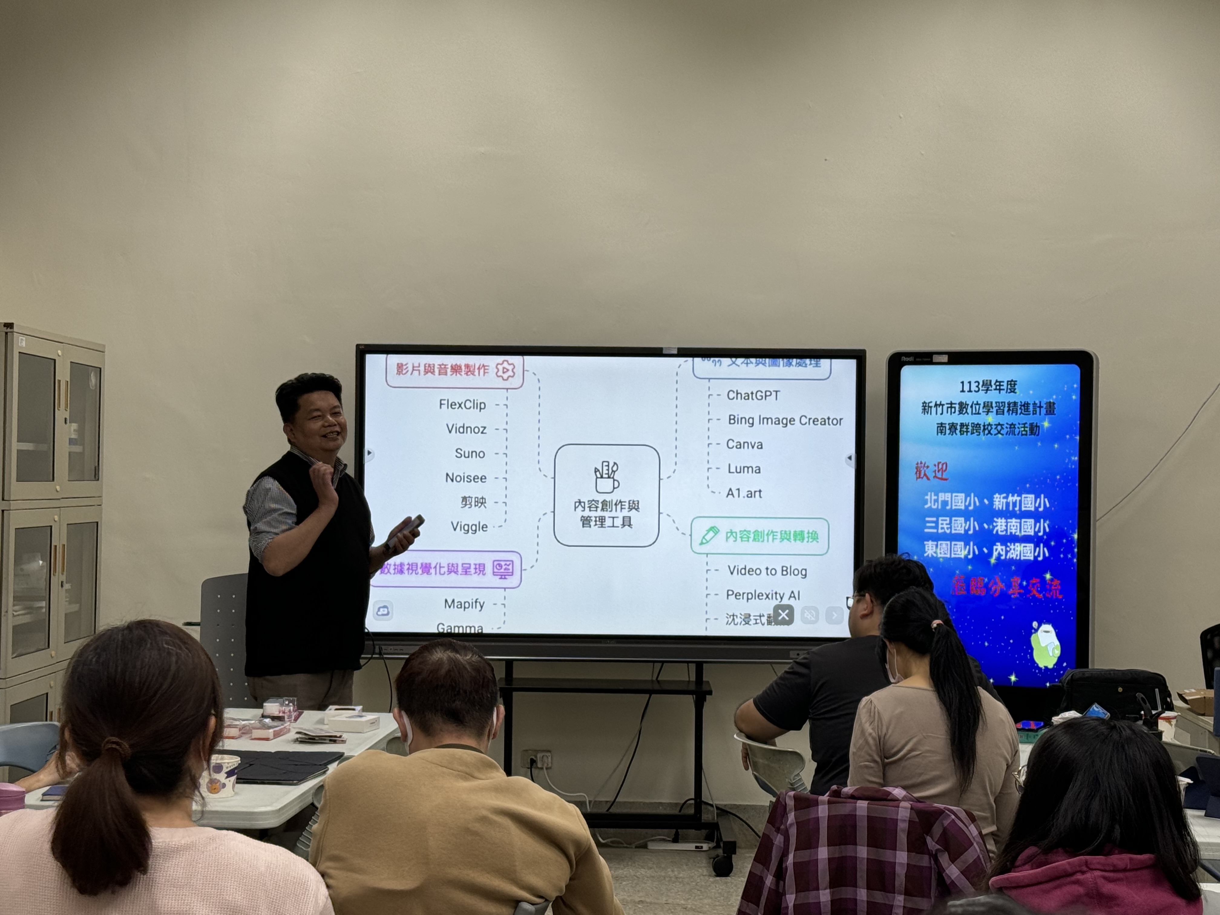 為了提升教師在AI時代的教學能力,今日在南寮國小舉辦「AI時代的備課與教學」跨校交流活動。本次交流邀請到新竹國小彭若雯老師、北門國小張彌香老師、三民國小羅培仁老師、港南國小呂秋琬主任、東園國小許佳綺主任、內湖國小陳宏昇老師共同參與,感謝老師們無私地分享。