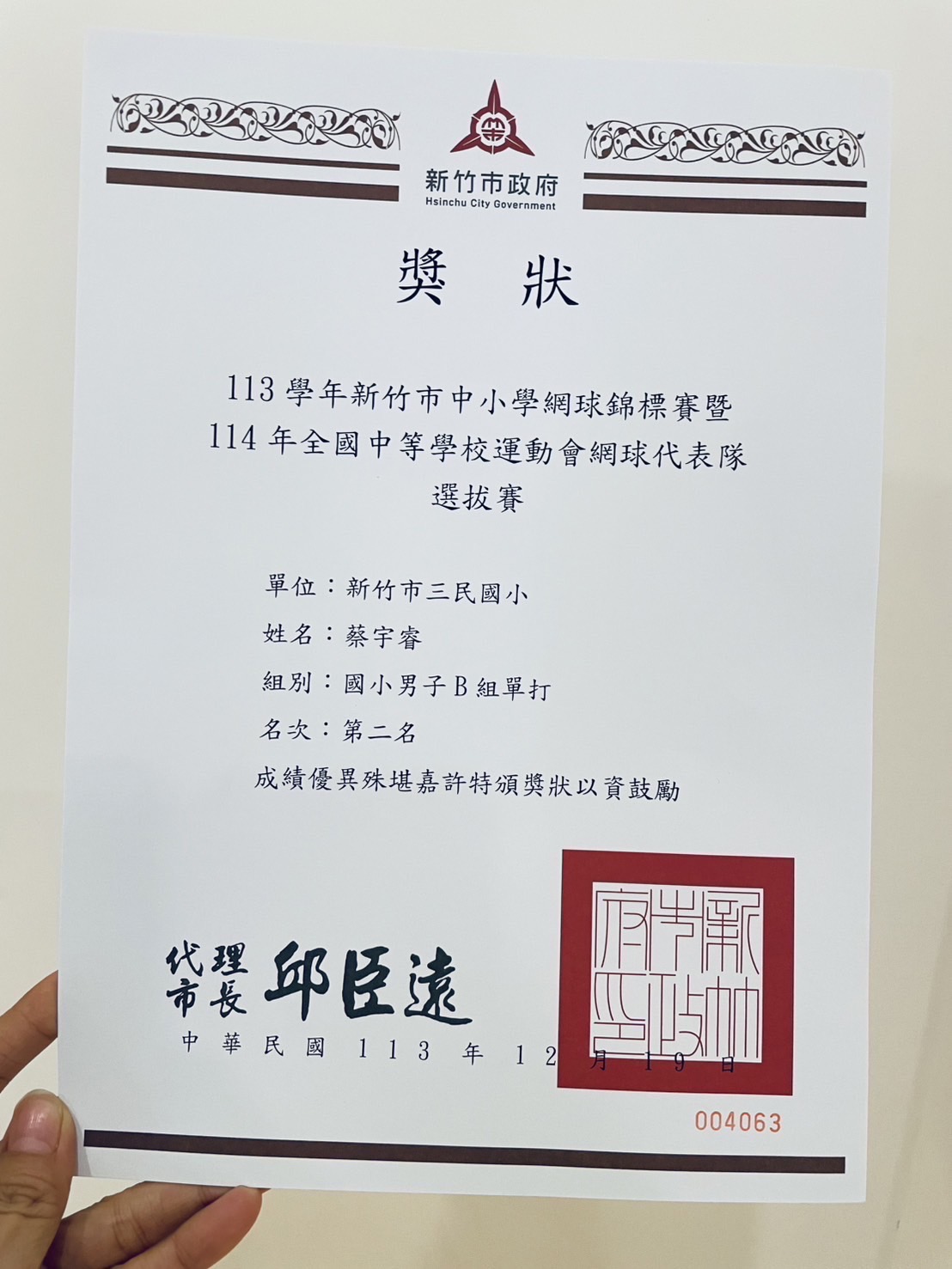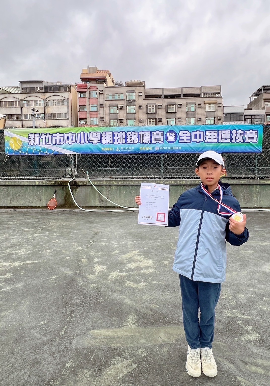 賀412蔡宇睿榮獲113 學年新竹市中小學網球錦標賽暨114 年全國中等學校運動會網球代表隊選拔賽國小男子B組單打 第二名。